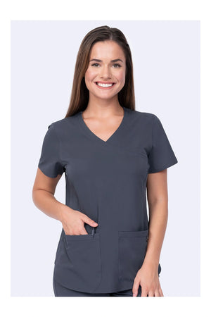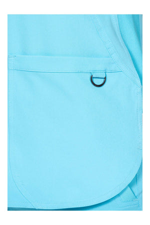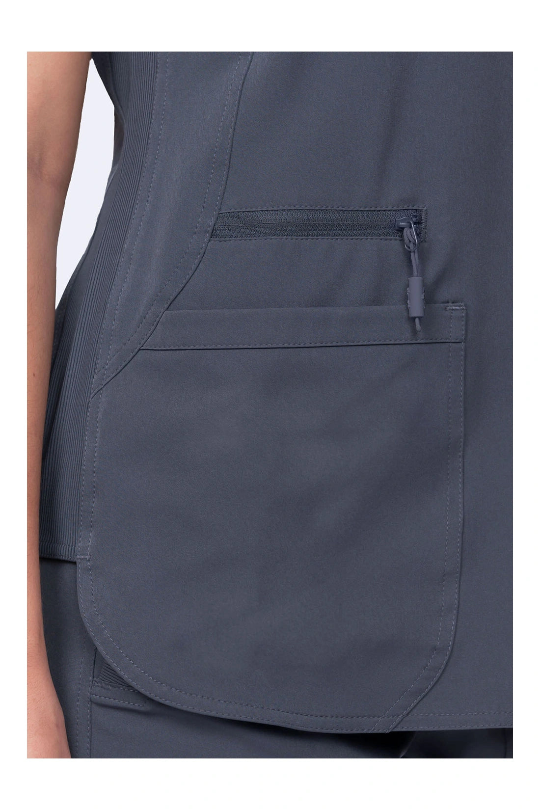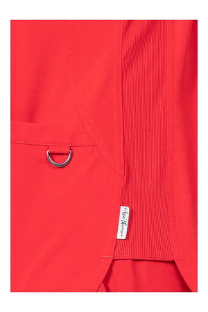 Cuello de pico cruzado con banda cruzada Mangas cortas con bordado del logotipo de la flecha del corazón DTM Dos bolsillos delanteros de parche curvados cerca del dobladillo Bolsillo adicional con cremallera y tirador extraíble con logotipo Paneles laterales de punto elástico Detalle de ribete en contraste en el interior del cuello Lengüeta con anilla metálica de utilidad