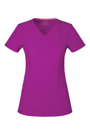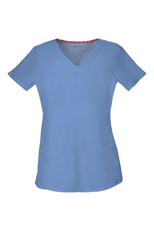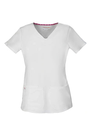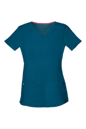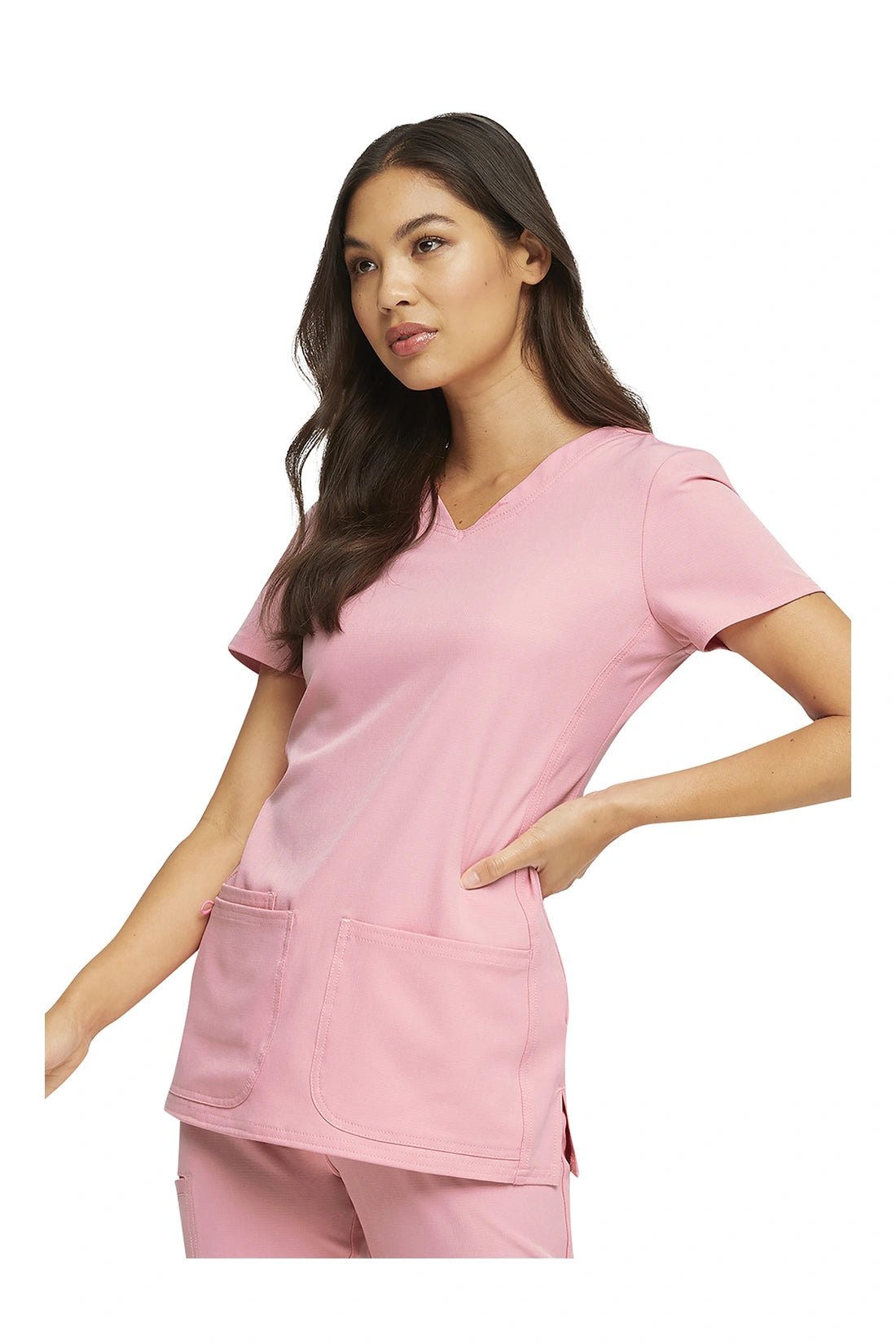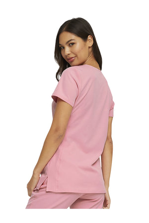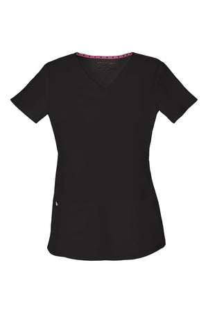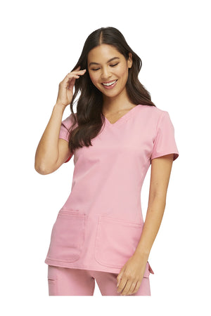 La camiseta de cuello en V de corte contemporáneo presenta bolsillos de parche redondeados con un pequeño bolsillo interior, un lazo elástico rosa exterior y un ojal rosa funcional oculto y un lazo elástico para pasar los cables de los auriculares por el interior. También cuenta con pespuntes de doble aguja, una cinta tejida característica en la parte trasera del cuello, costuras princesa delanteras y traseras y aberturas laterales. Longitud del centro de la espalda: 25 1/2