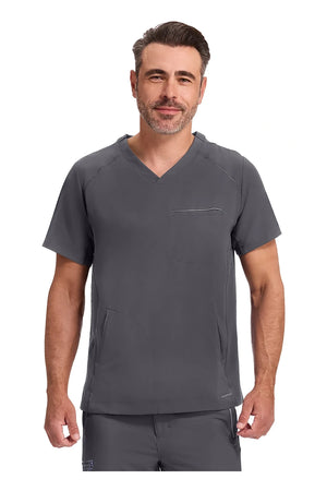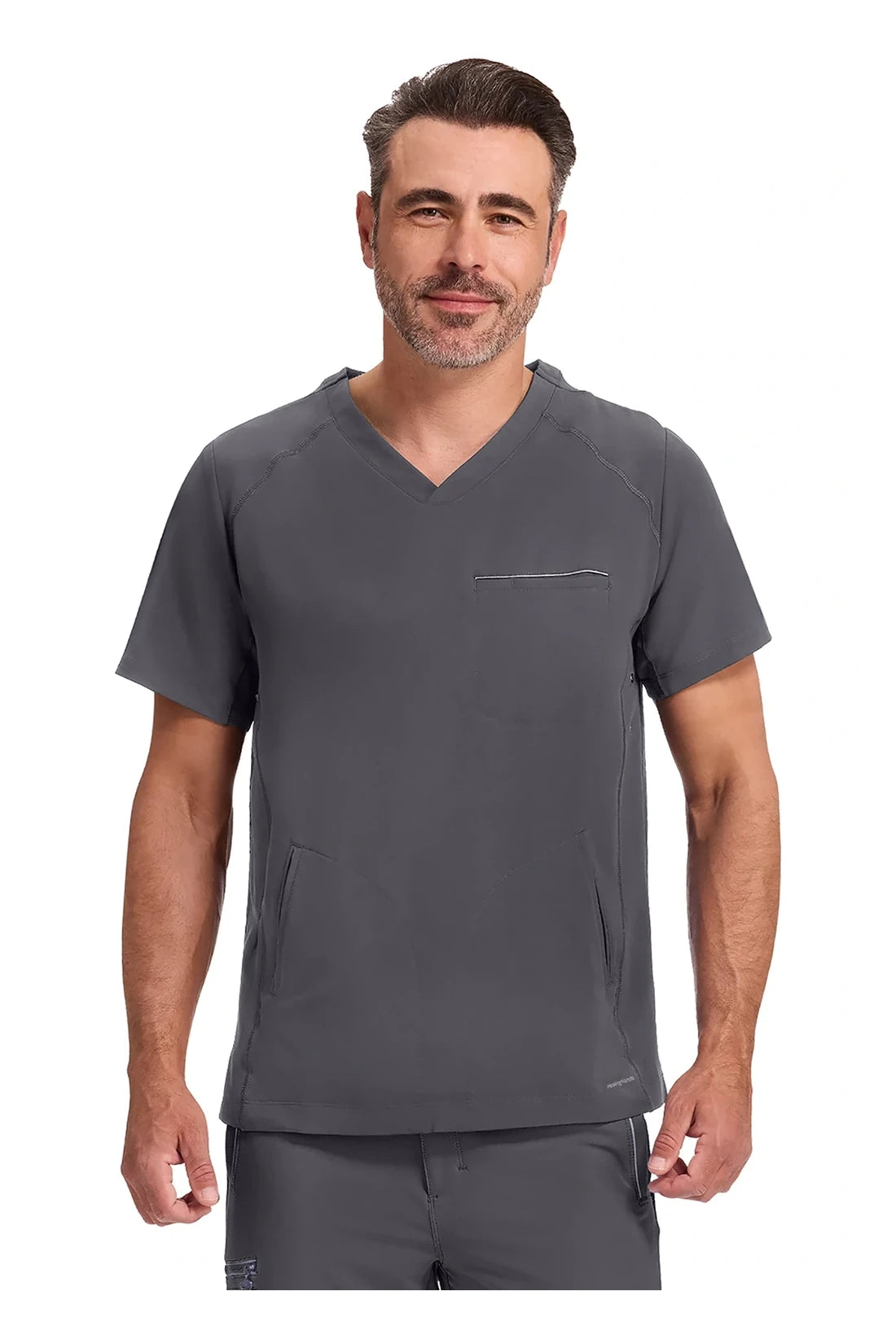 la parte superior de 3 bolsillos con escote en v tiene 1 bolsillo con ribete en el pecho y 2 bolsillos delanteros con costelas. tiene costuras atléticas de cierre plano con ribetes en forma de ojales en los paneles frontales laterales.
