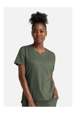 Luce lo mejor posible en el trabajo con la blusa de cuello redondo con muescas para mujer Meavn Matrix. La blusa de corte clásico viene con una tela transpirable que absorbe la humedad. Con un cuello con muescas con cierre de tapeta oculta, paneles de micro punto teñidos a juego, presilla elástica para la credencial de identificación y aberturas frontales para moverse, obtenga una funcionalidad absoluta en movimiento. Con tres bolsillos espaciosos, incluido un bolsillo de ribete en el pecho y dos bolsillos ocultos con entrada lateral, la blusa de hospital tiene una excelente relación calidad-precio.