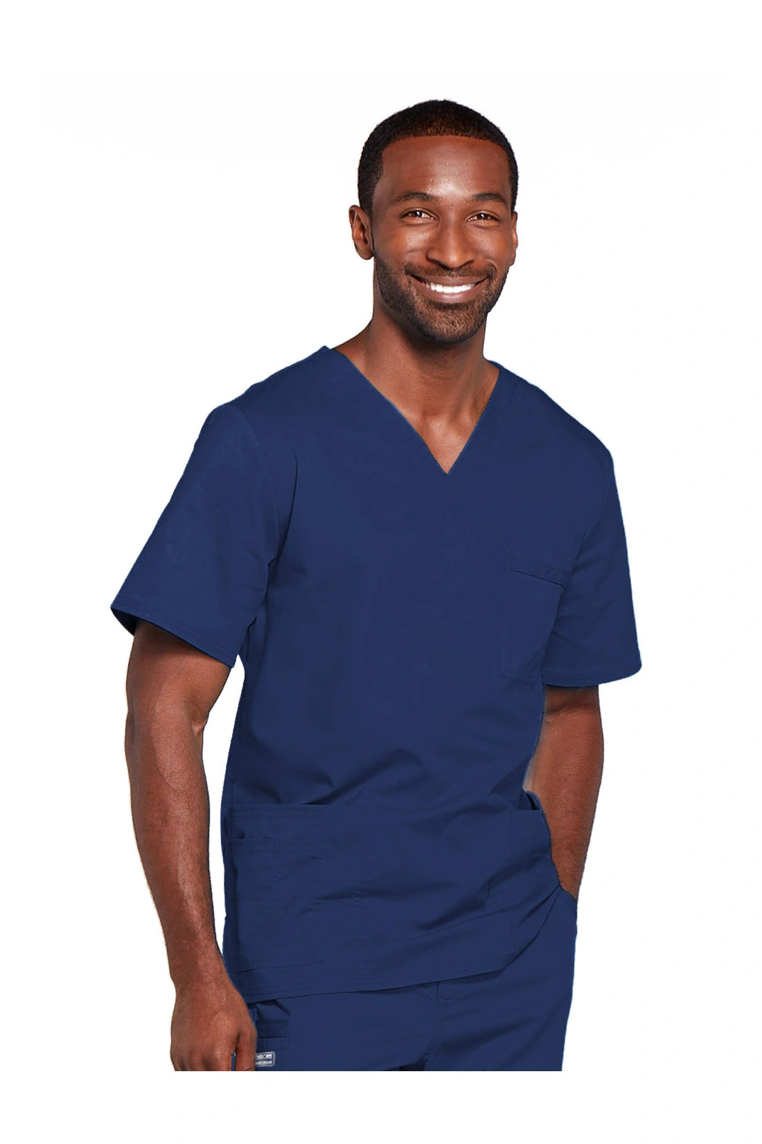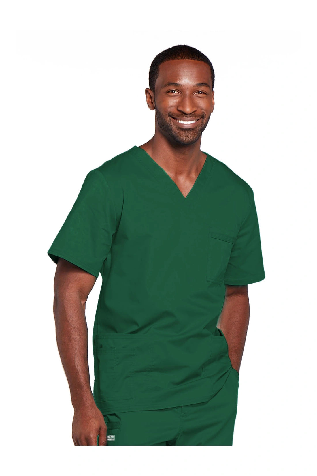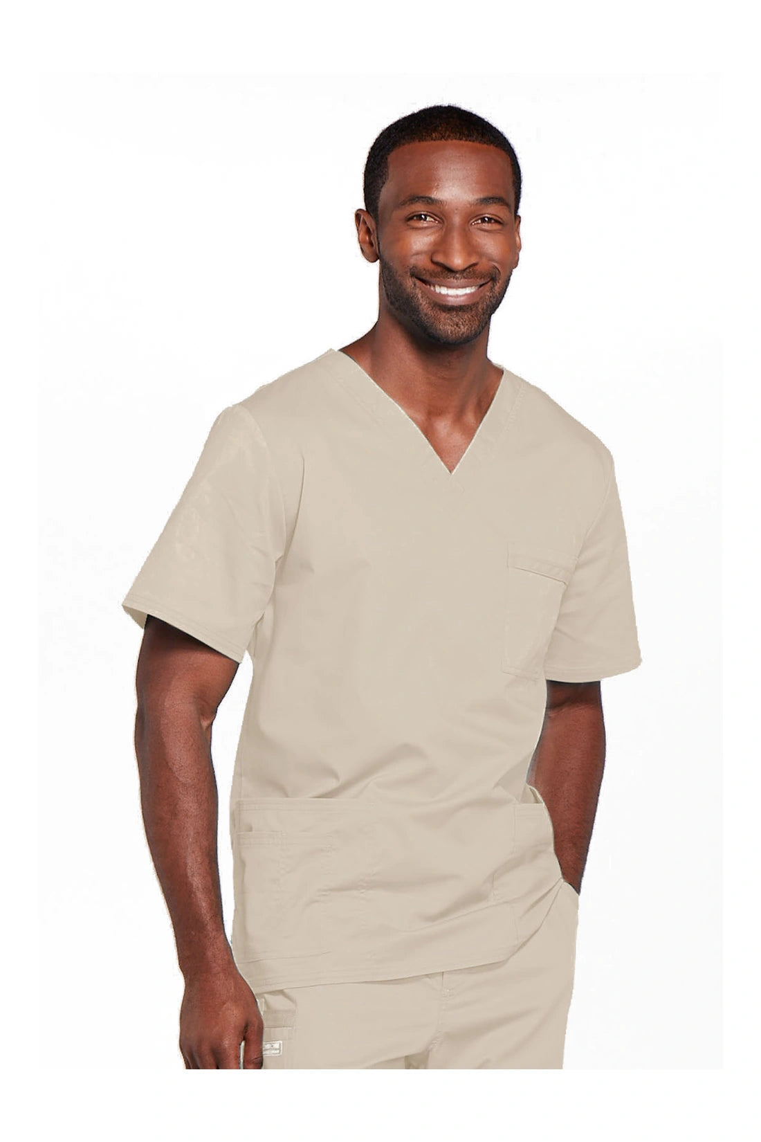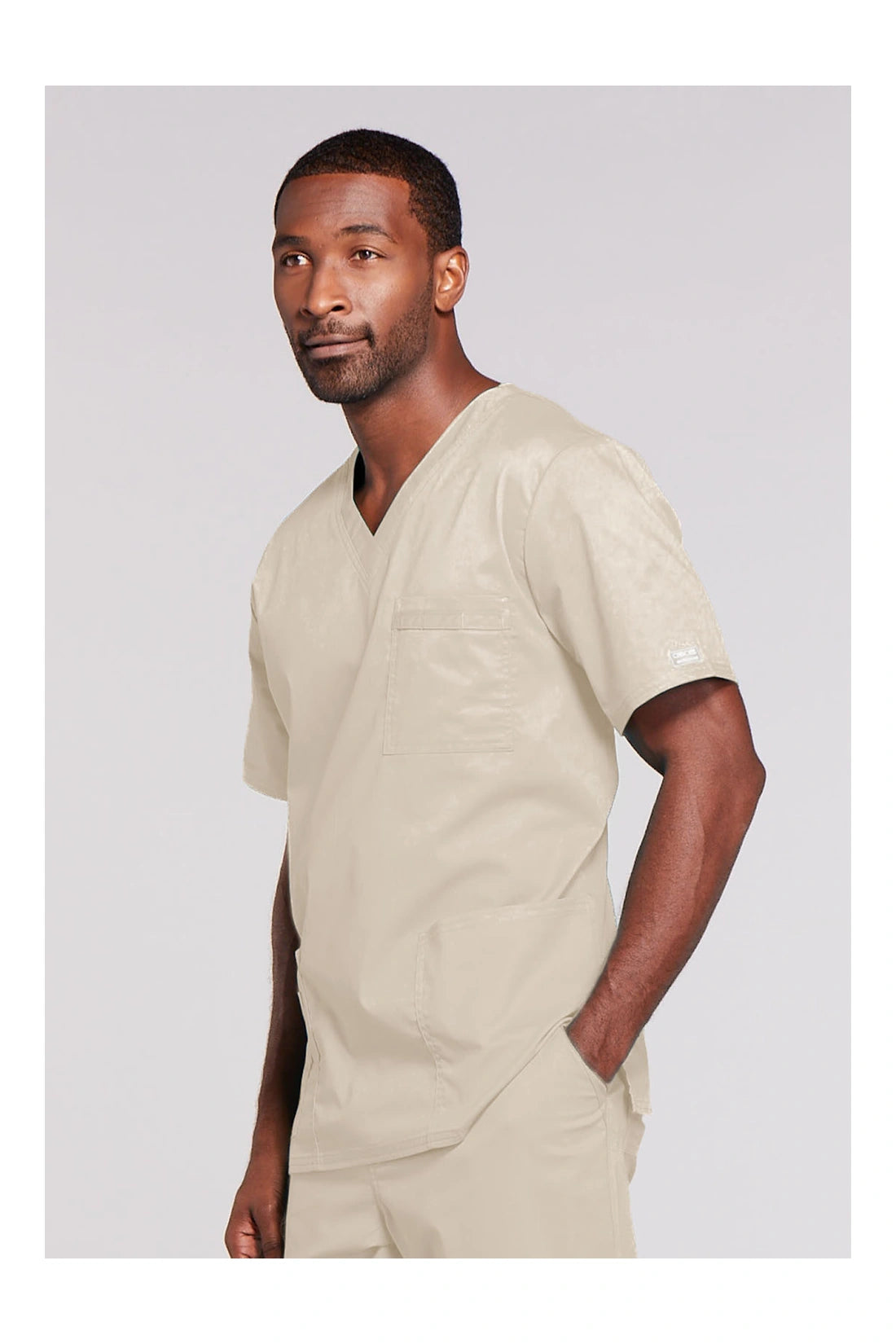 Cuello en V de ajuste tradicional unisex con costuras de doble aguja. El bolsillo del pecho cuenta con un soporte para instrumentos. También incluye dos bolsillos de parche, un bolsillo adicional para instrumentos/teléfono móvil en el lado derecho, canesú trasero y aberturas laterales. Longitud del centro de la espalda: 28