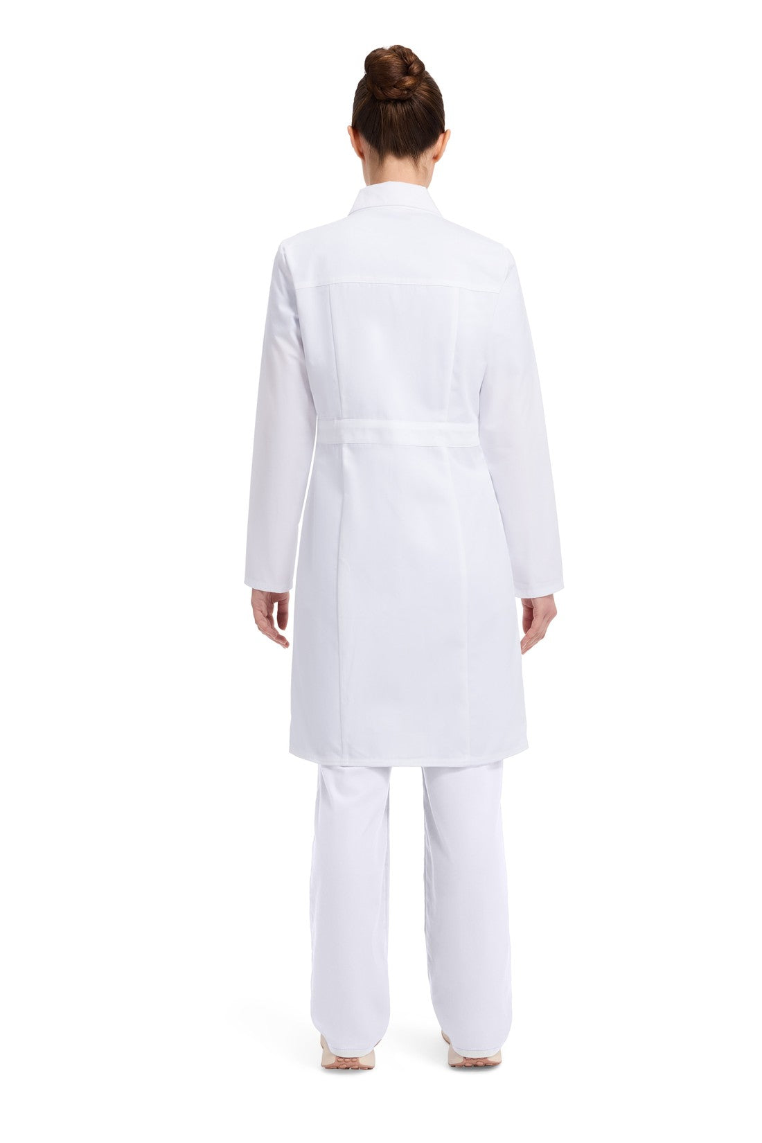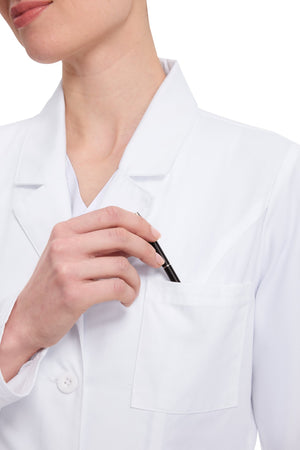 Una bata médica de corte contemporáneo con botones en la parte delantera, solapas con muescas y cuatro bolsillos de parche (un bolsillo en el pecho, dos bolsillos delanteros en ángulo y un bolsillo para el teléfono móvil) con un porta instrumentos oculto dentro del bolsillo derecho. Las costuras princesa en la espalda y el cinturón trasero cosido completan este cuadro. Longitud del centro de la espalda: 37".