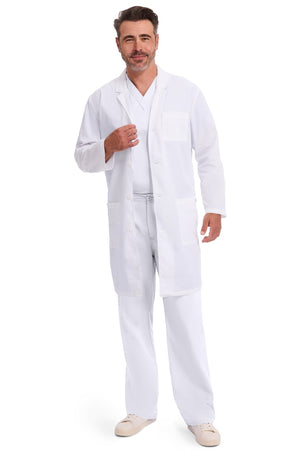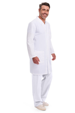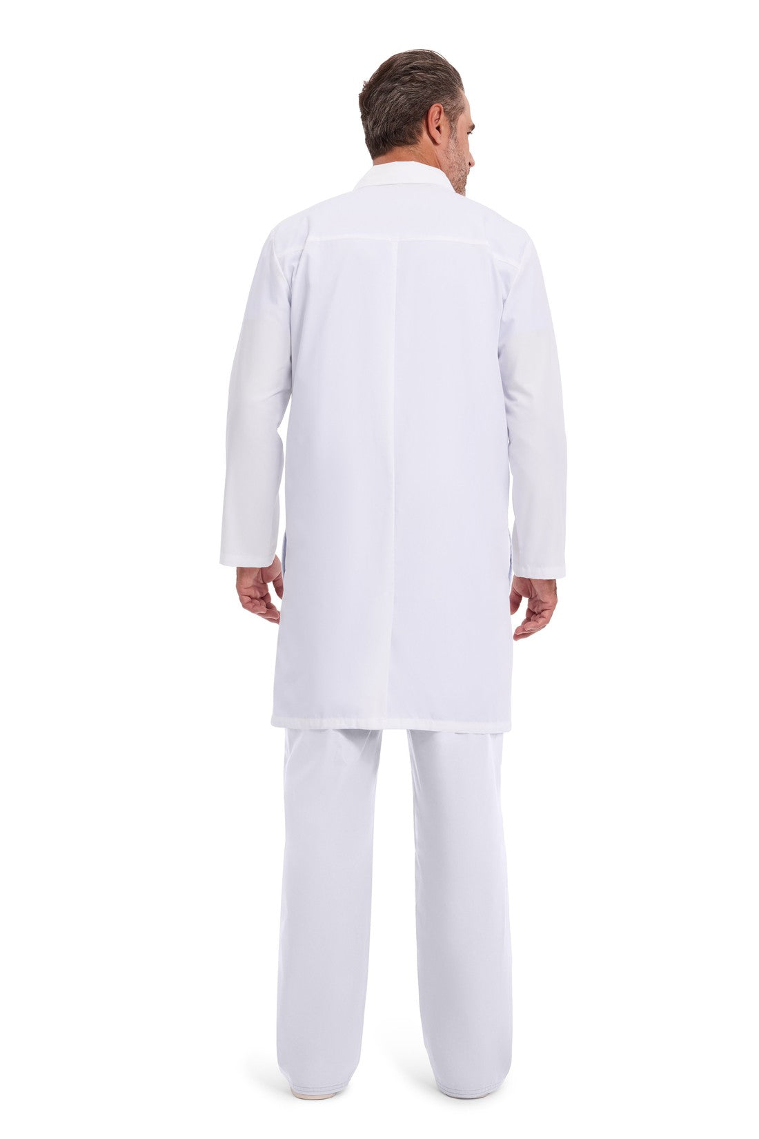 La bata médica de ajuste unisex presenta una solapa con muescas y un cierre frontal de cuatro botones. También cuenta con un bolsillo en el pecho y dos bolsillos de parche inferiores con entrada lateral para facilitar el acceso a los bolsillos del pantalón. Un canesú en la espalda y un pliegue en la espalda completan esta bata. Longitud en el centro de la espalda: 40".