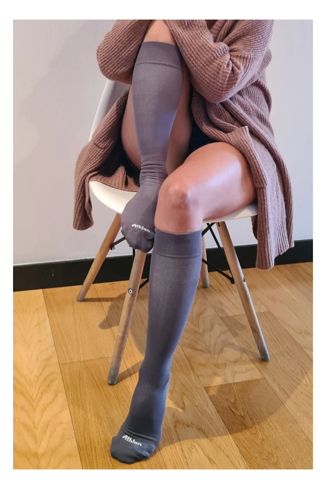 Innovadores calcetines elaborados en microfribra, con construcción avanzada y diseño formal largo que proporciona una compresión graduada.