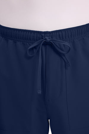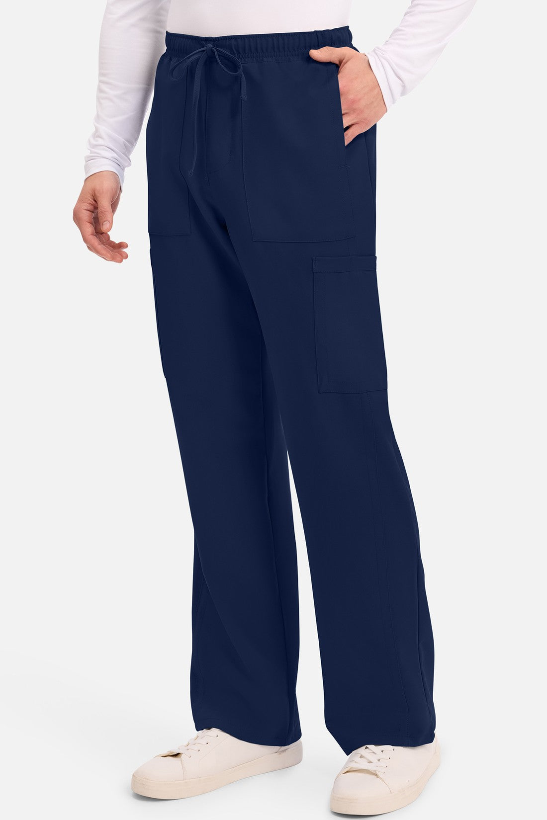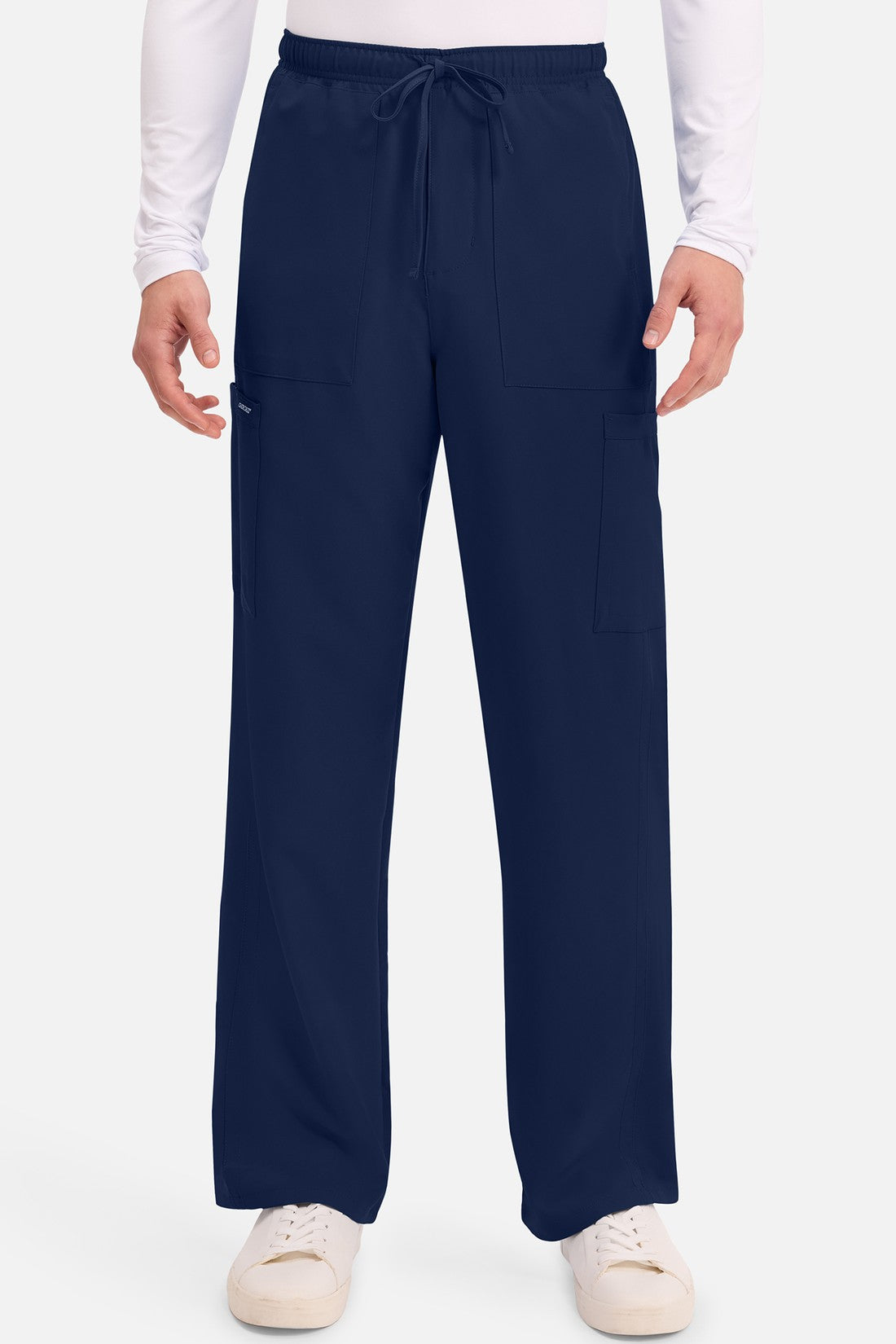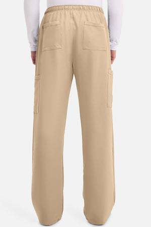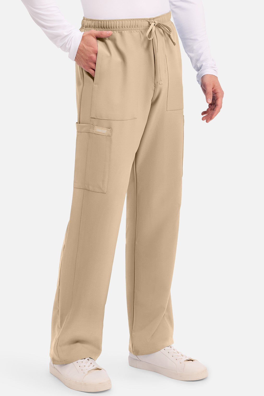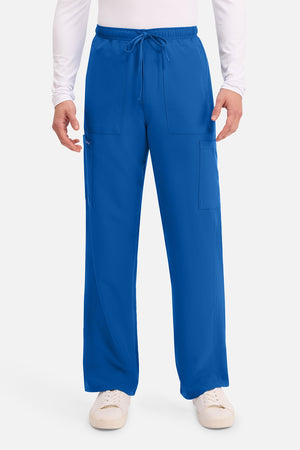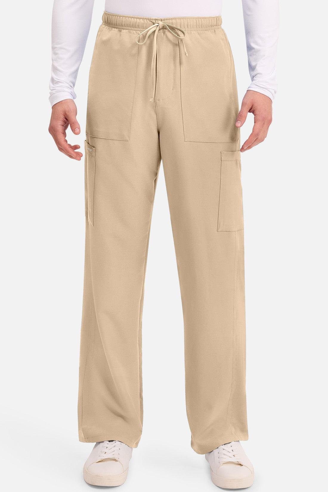 Un auténtico pantalón de corte masculino con bragueta de cremallera, este estilo ofrece muchos bolsillos y un estilo funcional. La cintura elástica reforzada de talle medio incluye un cordón de ajuste. Dispone de seis bolsillos para un almacenamiento organizado: dos bolsillos laterales de parche, dos bolsillos cargo con ranuras para bolígrafos/instrumentos y dos bolsillos traseros de parche. Los bolsillos cargo y los bolsillos traseros tienen un ribete inverso en el dobladillo para mayor detalle. Las costuras delanteras de las perneras alargan las piernas. Los pespuntes decorativos a tono rematan este estilo. Pernera recta, abertura de 19». Entrepierna: 32