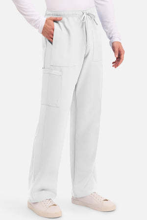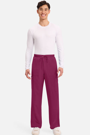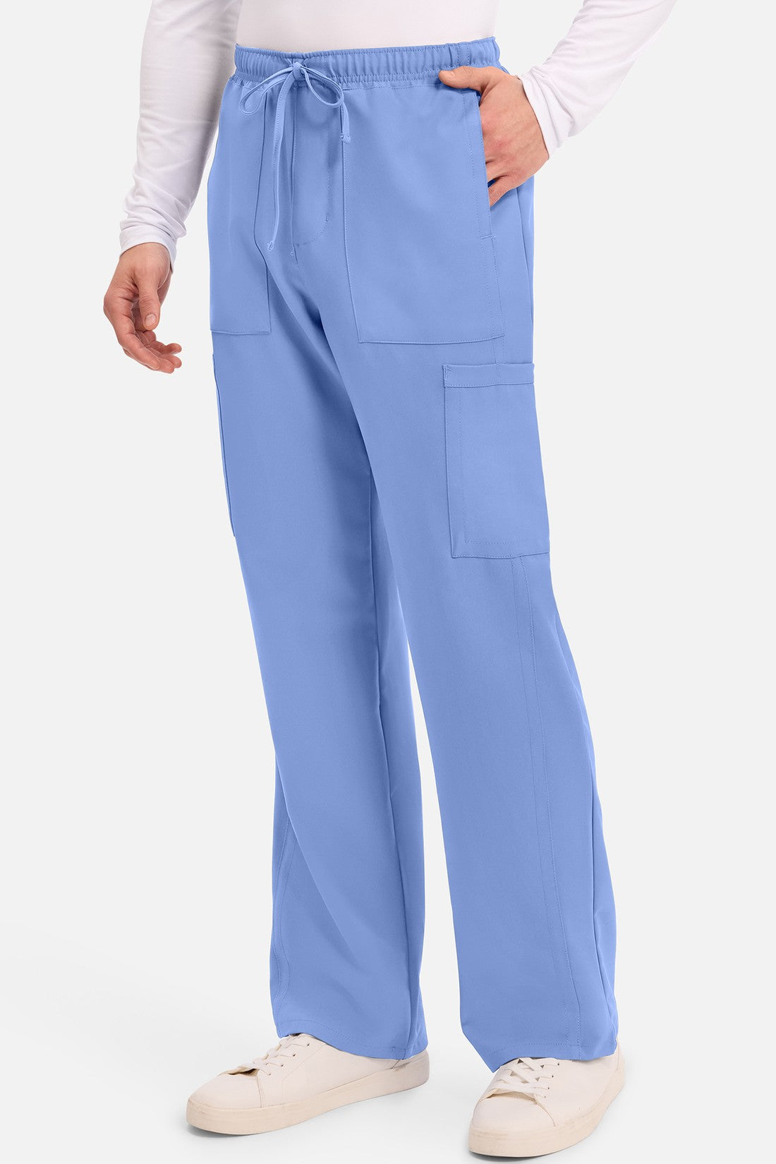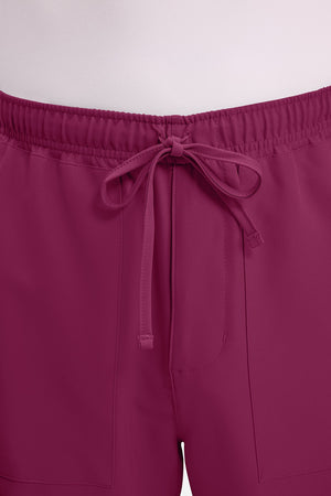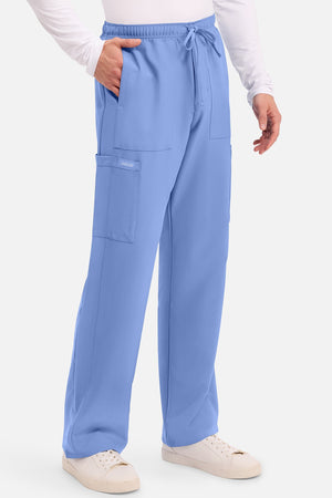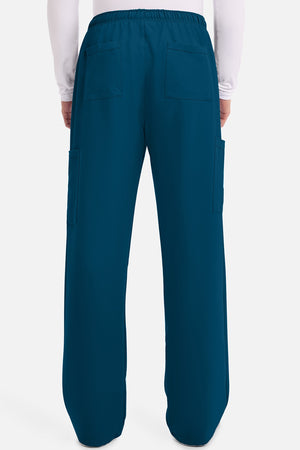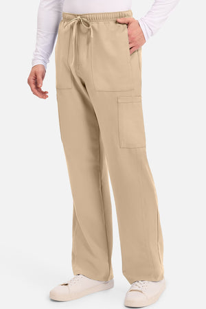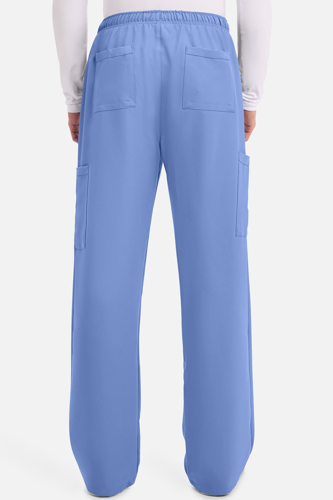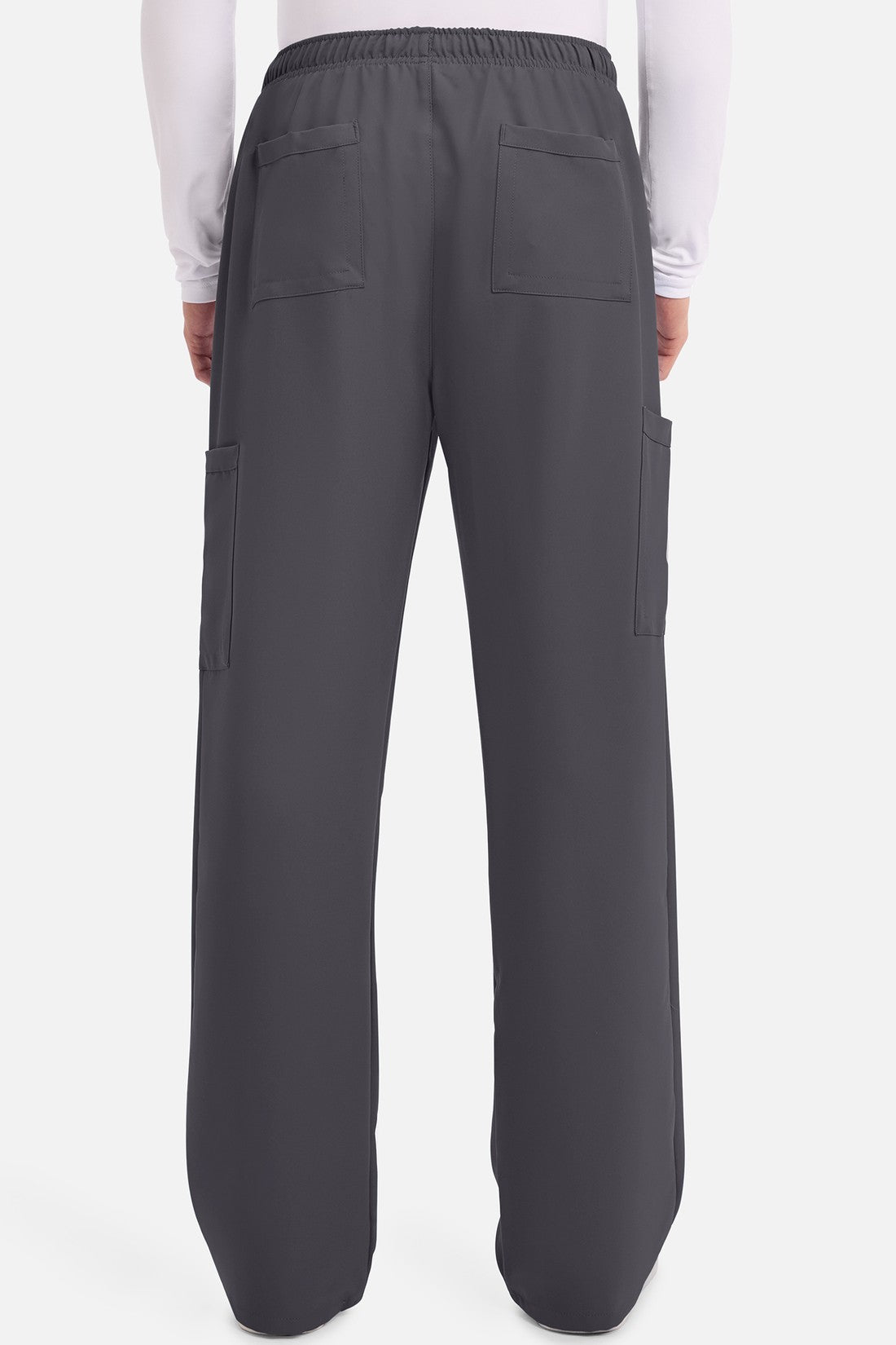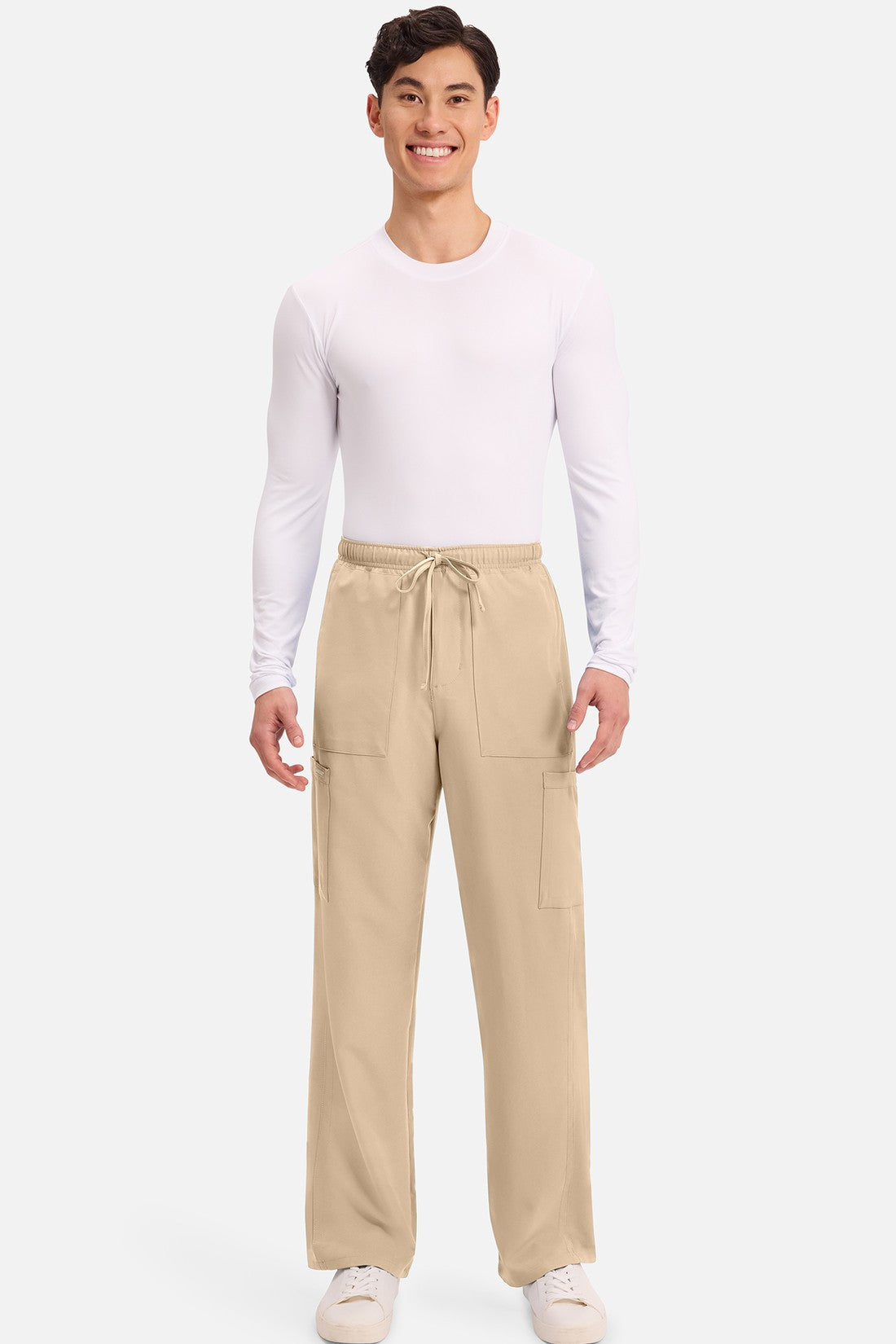 Un auténtico pantalón de corte masculino con bragueta de cremallera, este estilo ofrece muchos bolsillos y un estilo funcional. La cintura elástica reforzada de talle medio incluye un cordón de ajuste. Dispone de seis bolsillos para un almacenamiento organizado: dos bolsillos laterales de parche, dos bolsillos cargo con ranuras para bolígrafos/instrumentos y dos bolsillos traseros de parche. Los bolsillos cargo y los bolsillos traseros tienen un ribete inverso en el dobladillo para mayor detalle. Las costuras delanteras de las perneras alargan las piernas. Los pespuntes decorativos a tono rematan este estilo. Pernera recta, abertura de 19». Entrepierna: 32