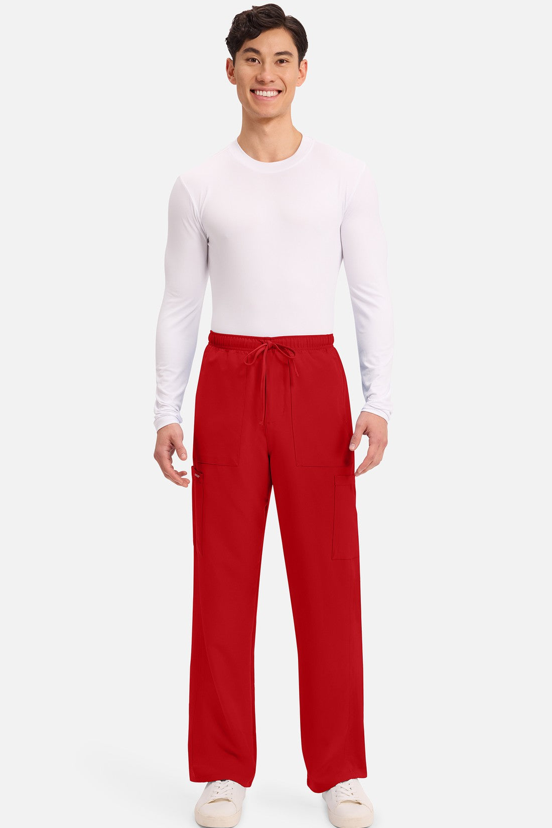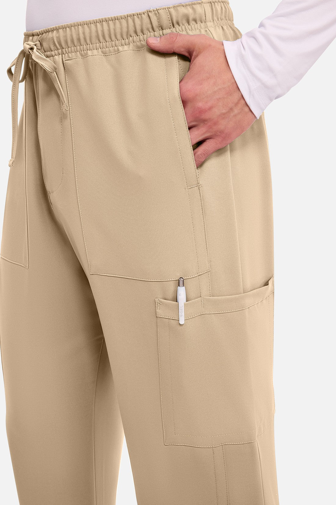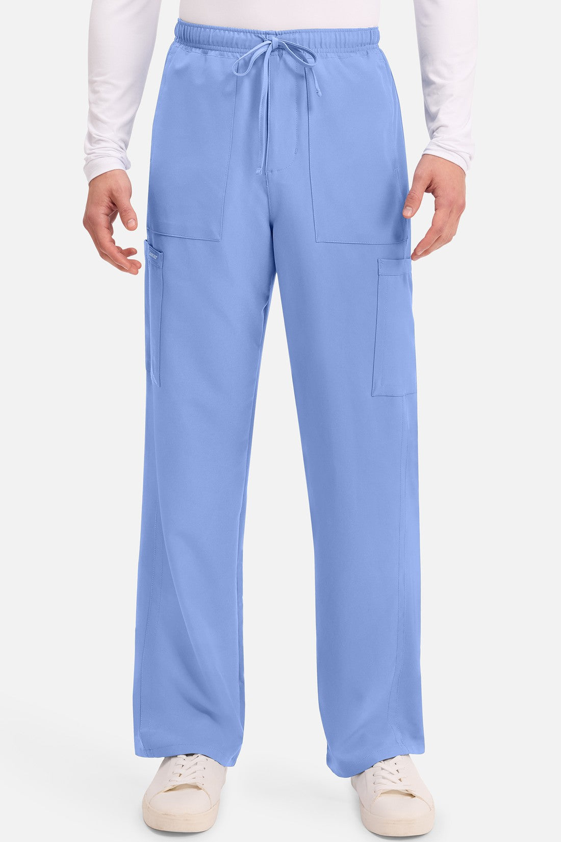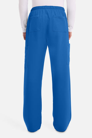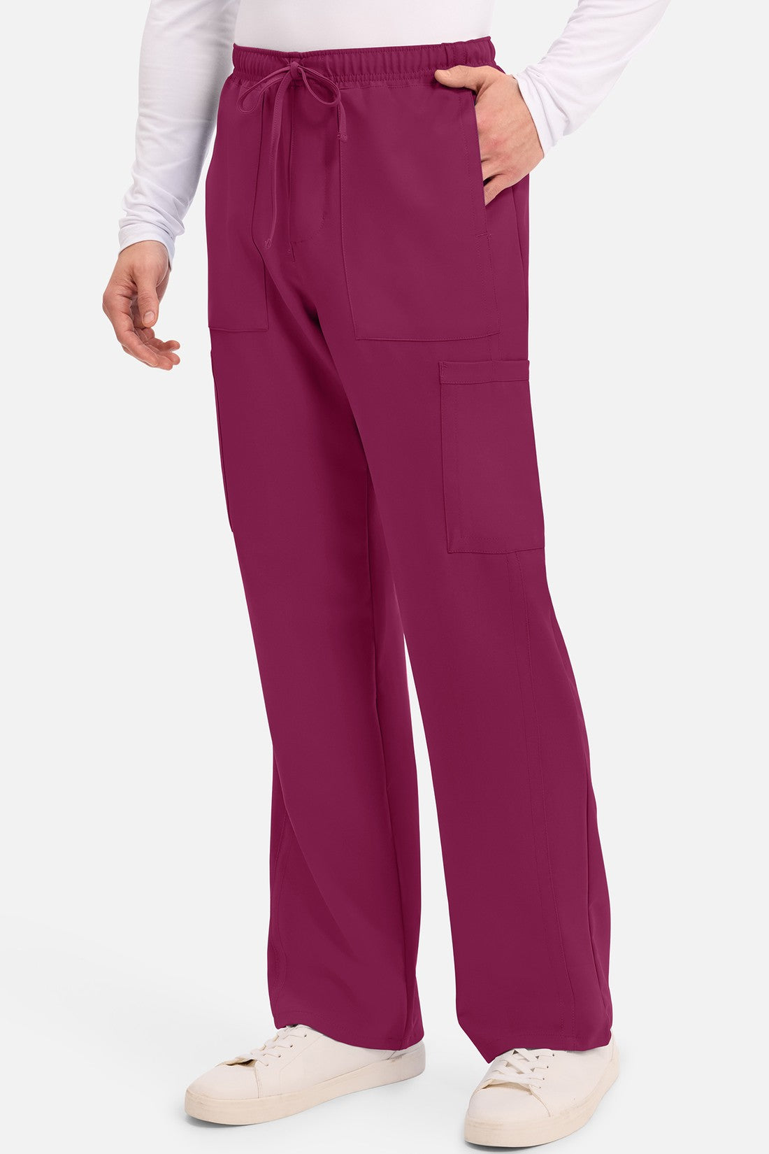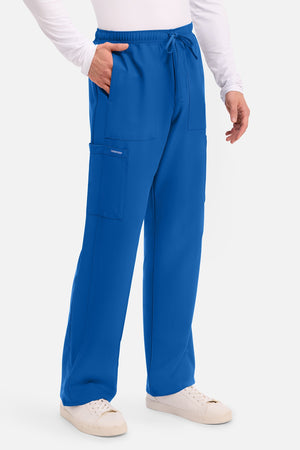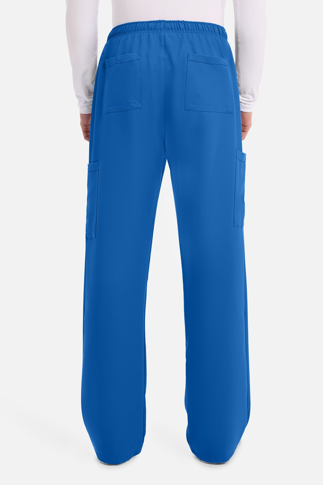 Un auténtico pantalón de corte masculino con bragueta de cremallera, este estilo ofrece muchos bolsillos y un estilo funcional. La cintura elástica reforzada de talle medio incluye un cordón de ajuste. Dispone de seis bolsillos para un almacenamiento organizado: dos bolsillos laterales de parche, dos bolsillos cargo con ranuras para bolígrafos/instrumentos y dos bolsillos traseros de parche. Los bolsillos cargo y los bolsillos traseros tienen un ribete inverso en el dobladillo para mayor detalle. Las costuras delanteras de las perneras alargan las piernas. Los pespuntes decorativos a tono rematan este estilo. Pernera recta, abertura de 19». Entrepierna: 32