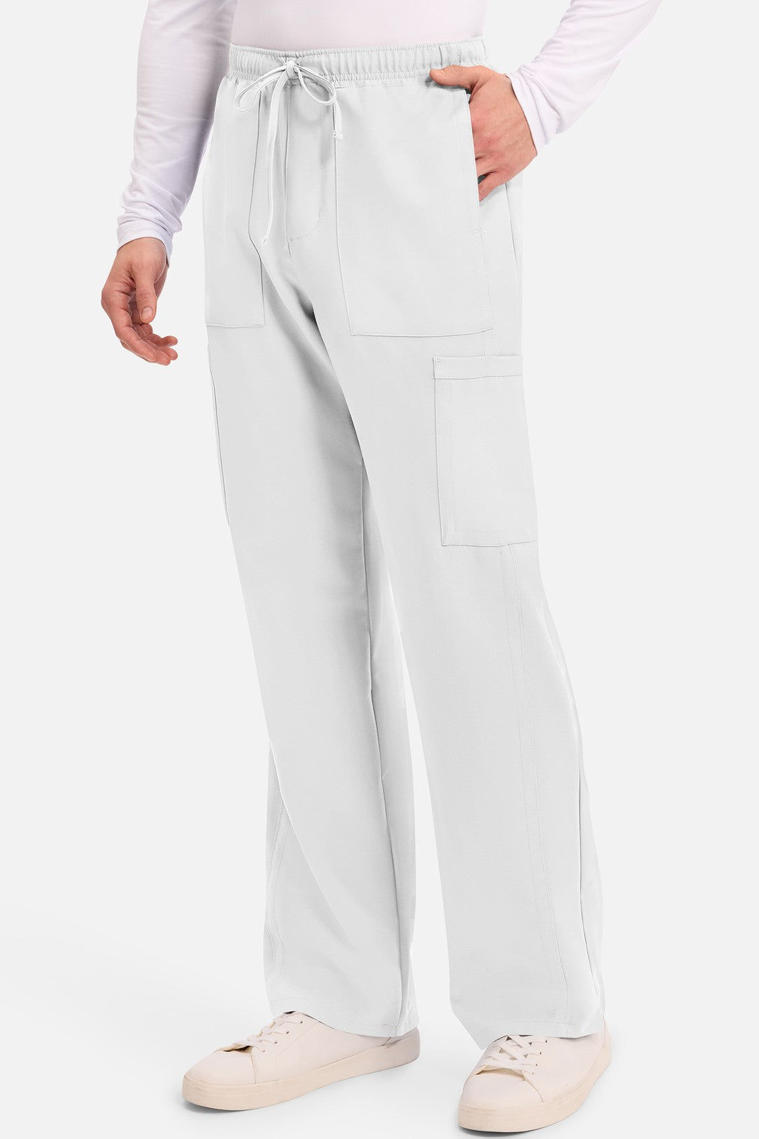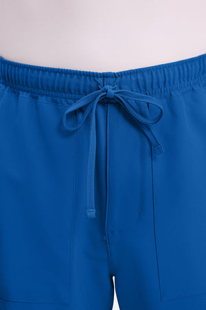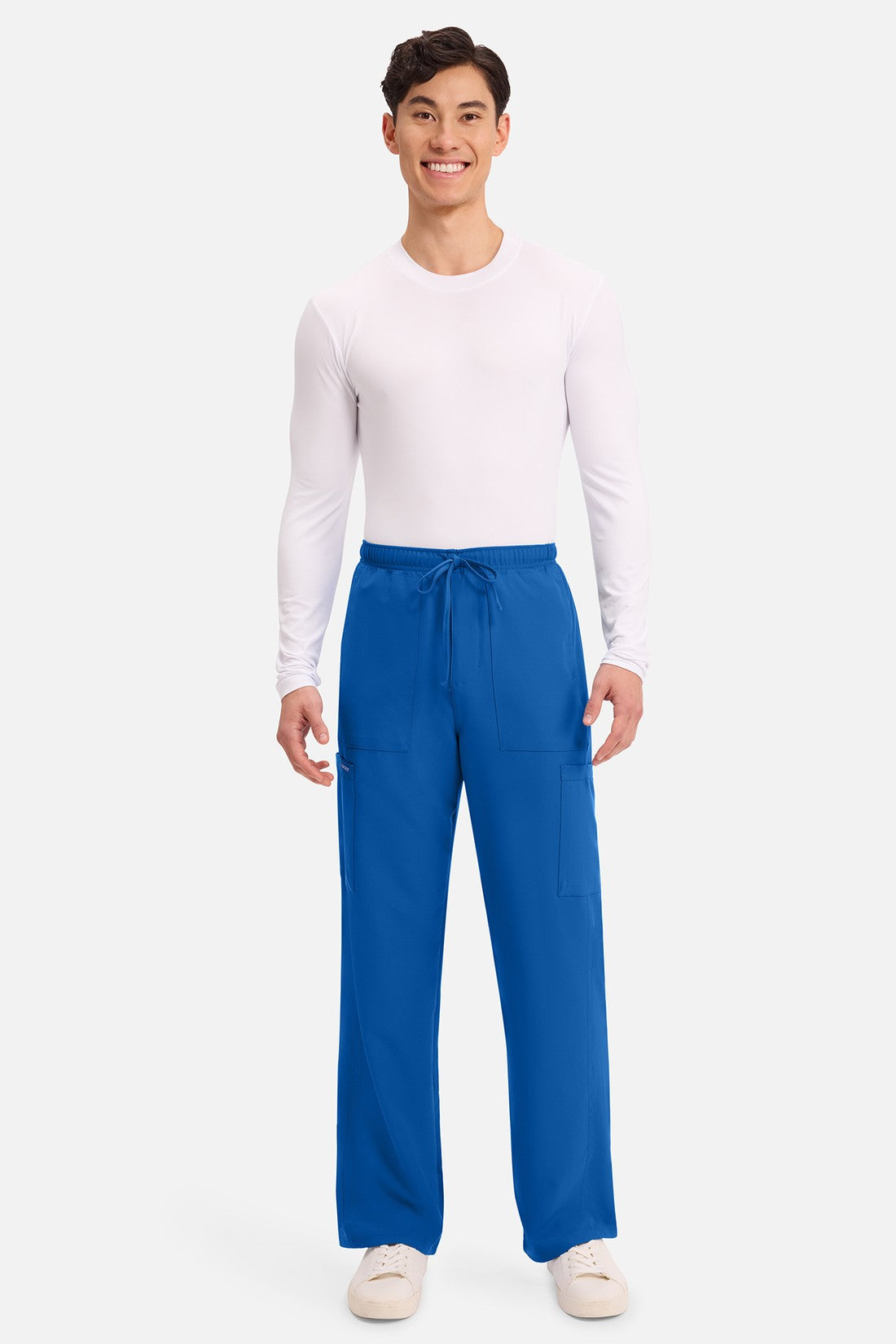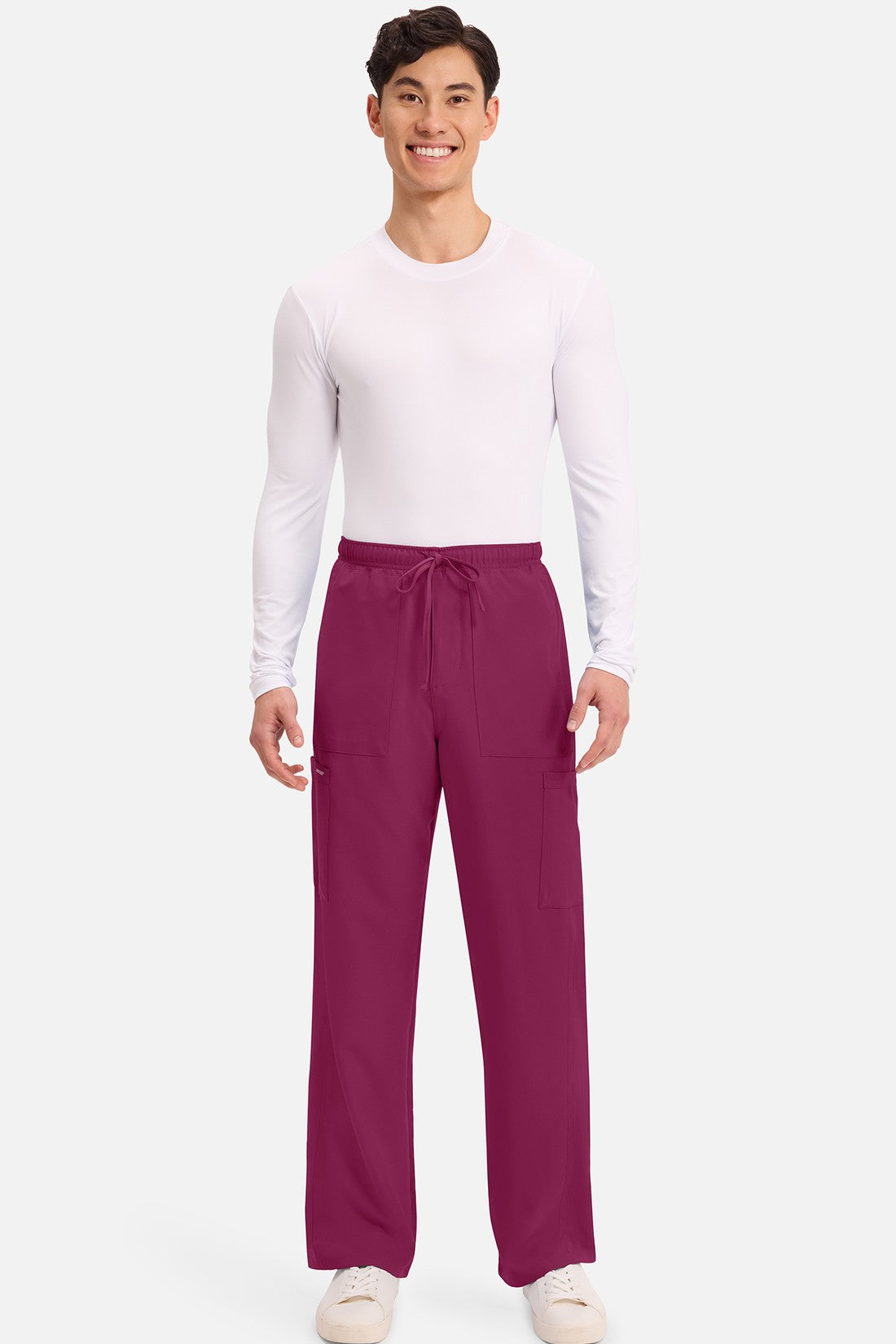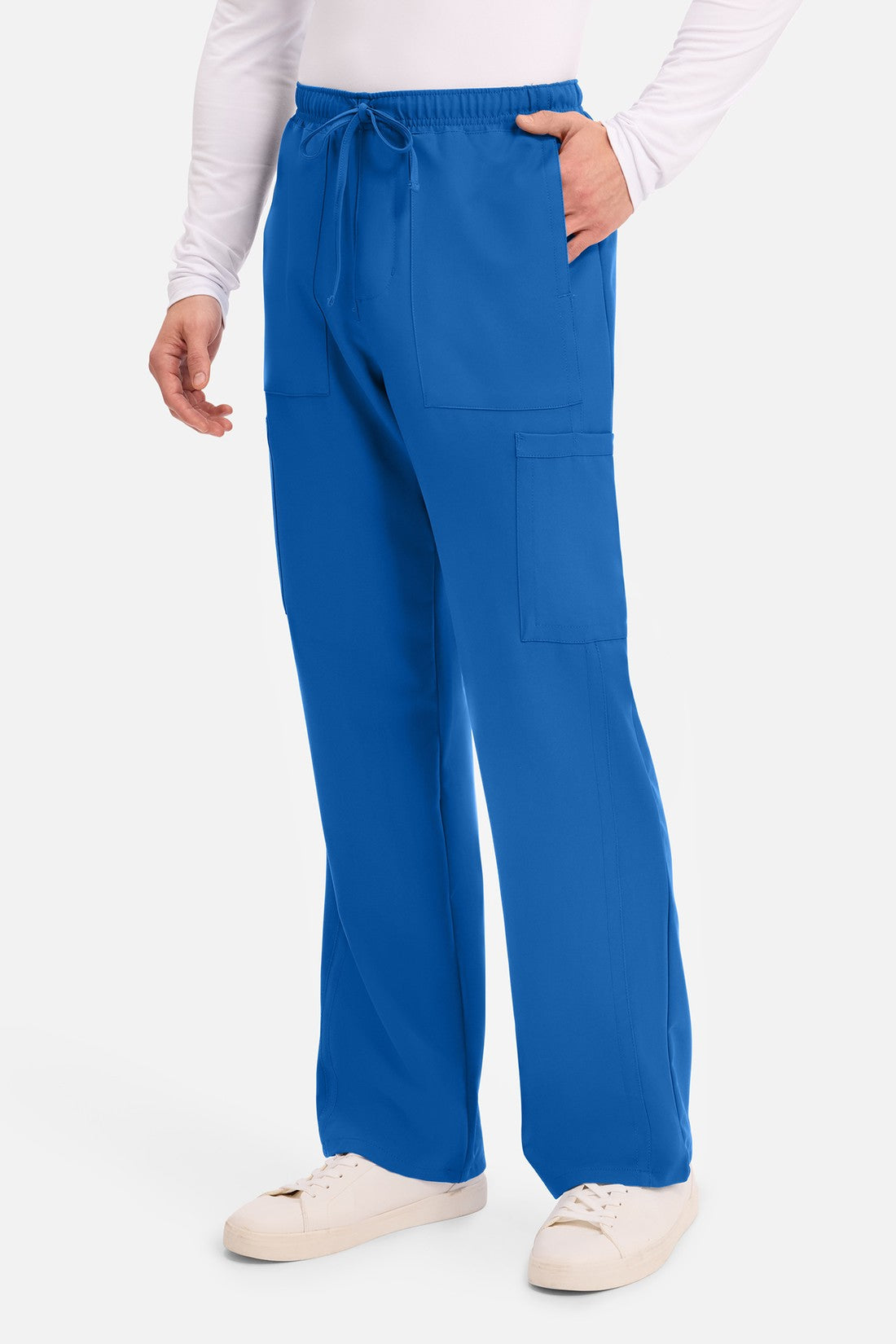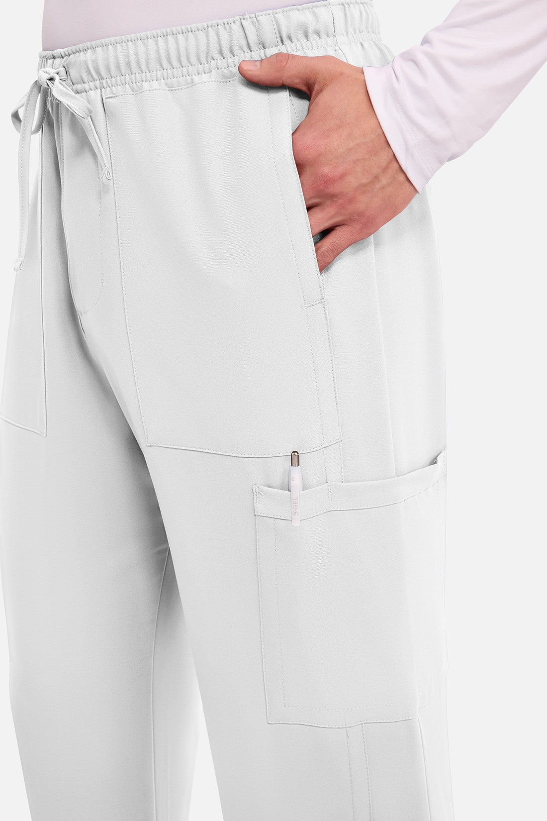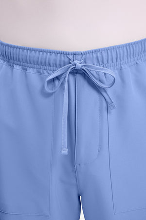 Un auténtico pantalón de corte masculino con bragueta de cremallera, este estilo ofrece muchos bolsillos y un estilo funcional. La cintura elástica reforzada de talle medio incluye un cordón de ajuste. Dispone de seis bolsillos para un almacenamiento organizado: dos bolsillos laterales de parche, dos bolsillos cargo con ranuras para bolígrafos/instrumentos y dos bolsillos traseros de parche. Los bolsillos cargo y los bolsillos traseros tienen un ribete inverso en el dobladillo para mayor detalle. Las costuras delanteras de las perneras alargan las piernas. Los pespuntes decorativos a tono rematan este estilo. Pernera recta, abertura de 19». Entrepierna: 32