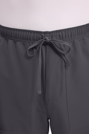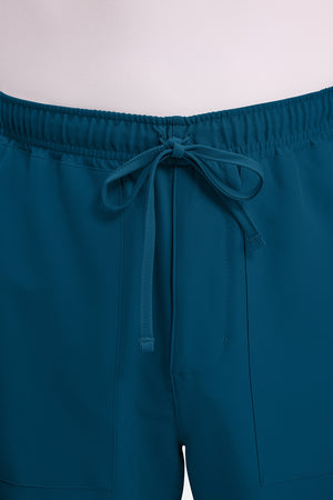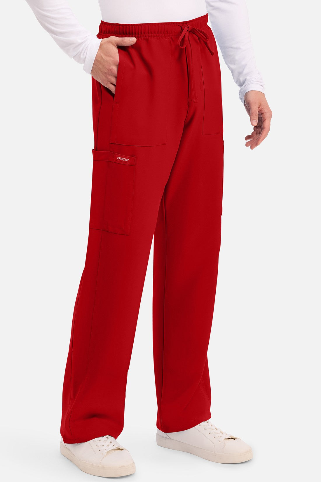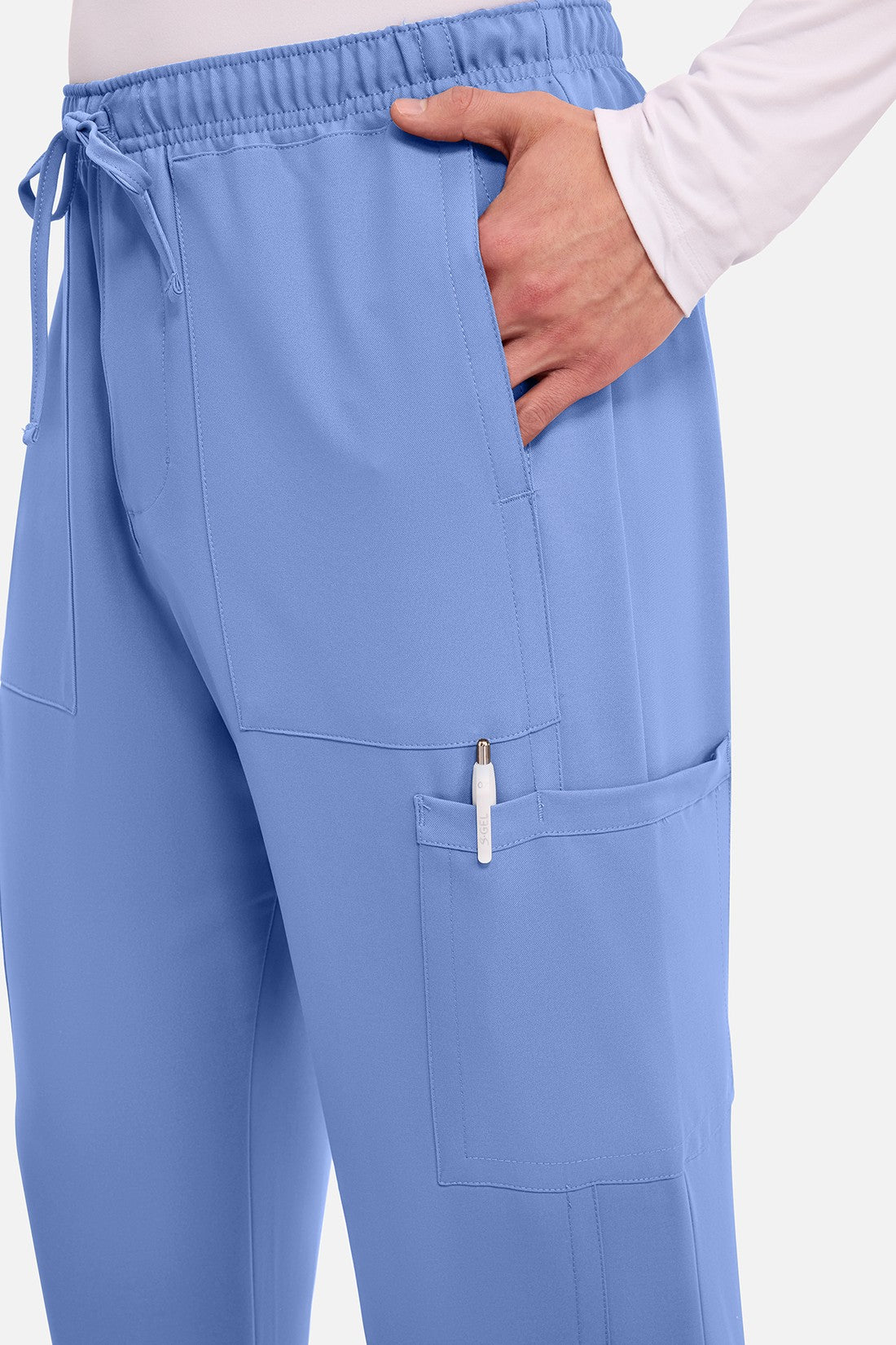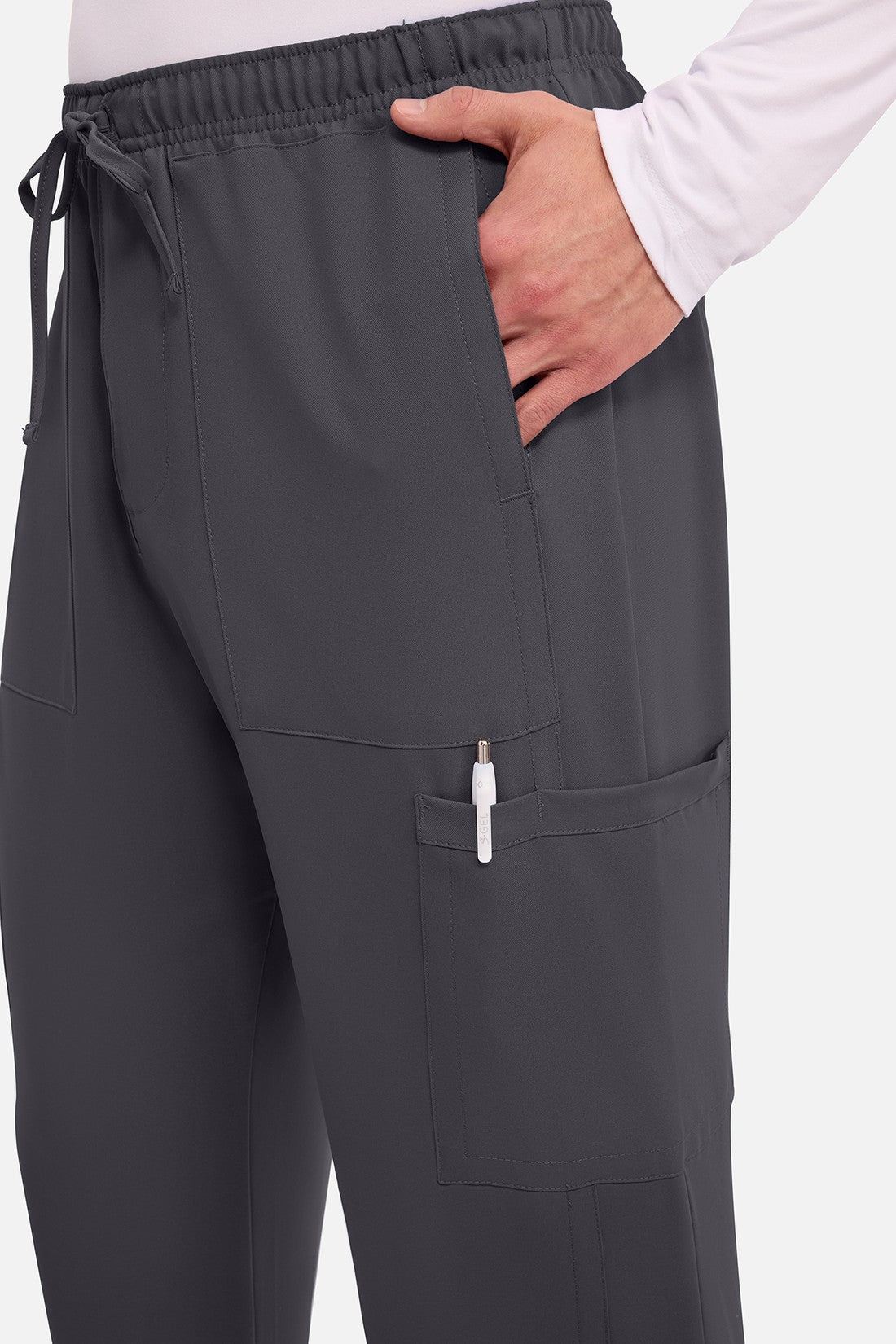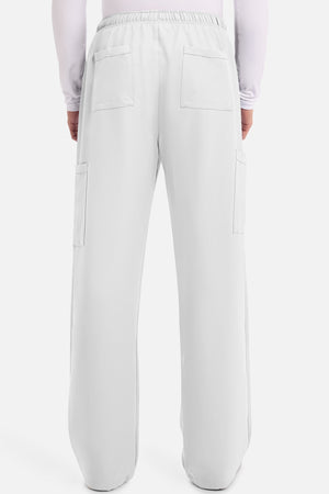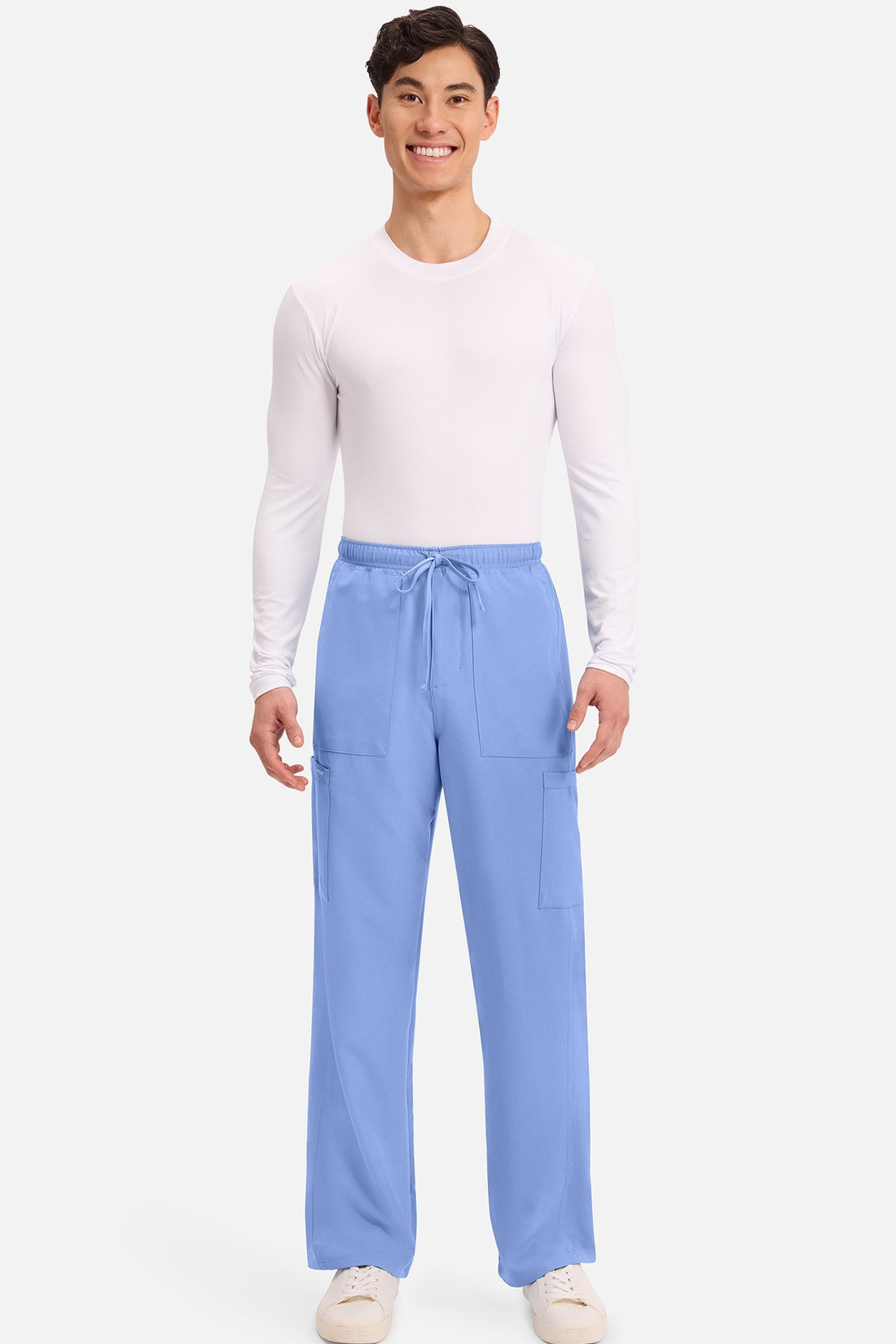 Un auténtico pantalón de corte masculino con bragueta de cremallera, este estilo ofrece muchos bolsillos y un estilo funcional. La cintura elástica reforzada de talle medio incluye un cordón de ajuste. Dispone de seis bolsillos para un almacenamiento organizado: dos bolsillos laterales de parche, dos bolsillos cargo con ranuras para bolígrafos/instrumentos y dos bolsillos traseros de parche. Los bolsillos cargo y los bolsillos traseros tienen un ribete inverso en el dobladillo para mayor detalle. Las costuras delanteras de las perneras alargan las piernas. Los pespuntes decorativos a tono rematan este estilo. Pernera recta, abertura de 19». Entrepierna: 32
