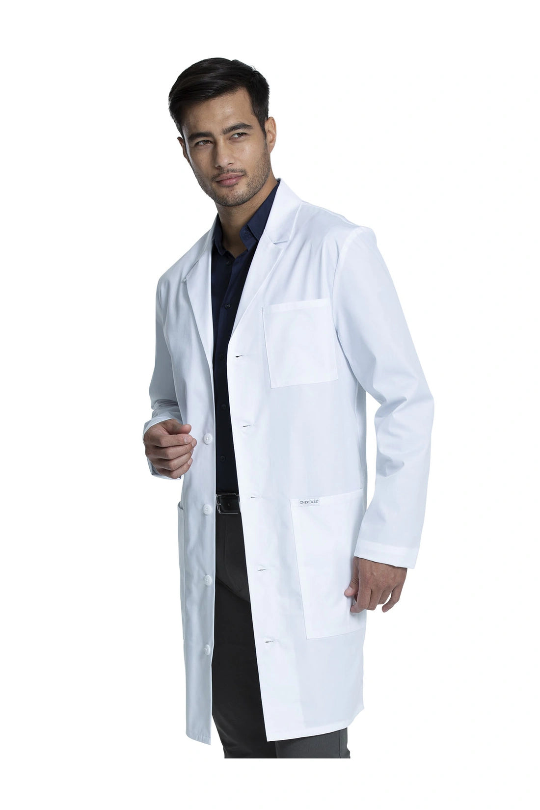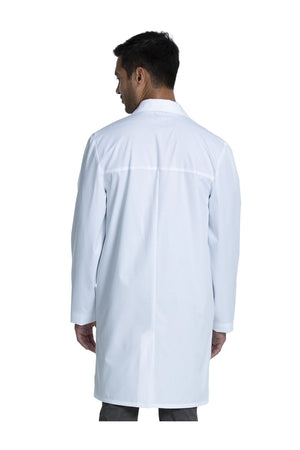 Esta bata médica de corte moderno para hombre tiene un cierre frontal de cinco botones con solapas de muesca y un bucle de identificación en la solapa derecha. También tiene una costura en el canesú trasero y una costura central en la espalda con un pliegue para mayor libertad de movimiento. Lazo elástico para candado en el centro de la espalda, debajo del cuello. Hay tres bolsillos: un bolsillo en el pecho y dos bolsillos delanteros tipo tableta con entrada lateral para facilitar el acceso a los bolsillos del pantalón. Longitud del centro de la espalda: 38".