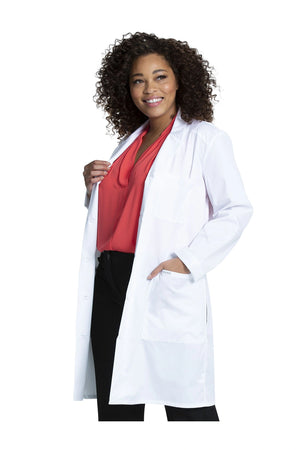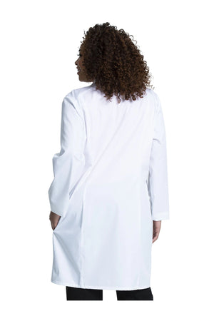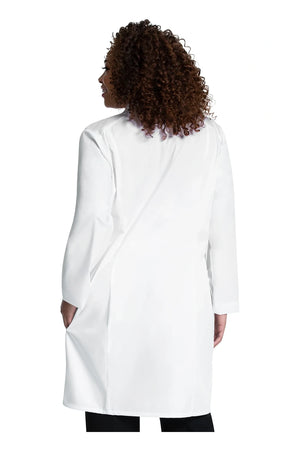 Esta bata médica de corte clásico moderno presenta solapas con muescas y un cierre frontal de cinco botones. Otros detalles son las costuras del canesú delantero y trasero y las costuras traseras tipo princesa. Presilla de identificación elástica en la costura del canesú derecho del usuario y presilla elástica en el centro de la espalda, debajo del cuello. Hay tres bolsillos: un bolsillo en el pecho y dos bolsillos delanteros tipo tableta con entrada lateral para facilitar el acceso a los bolsillos del pantalón. Longitud del centro de la espalda: 37".