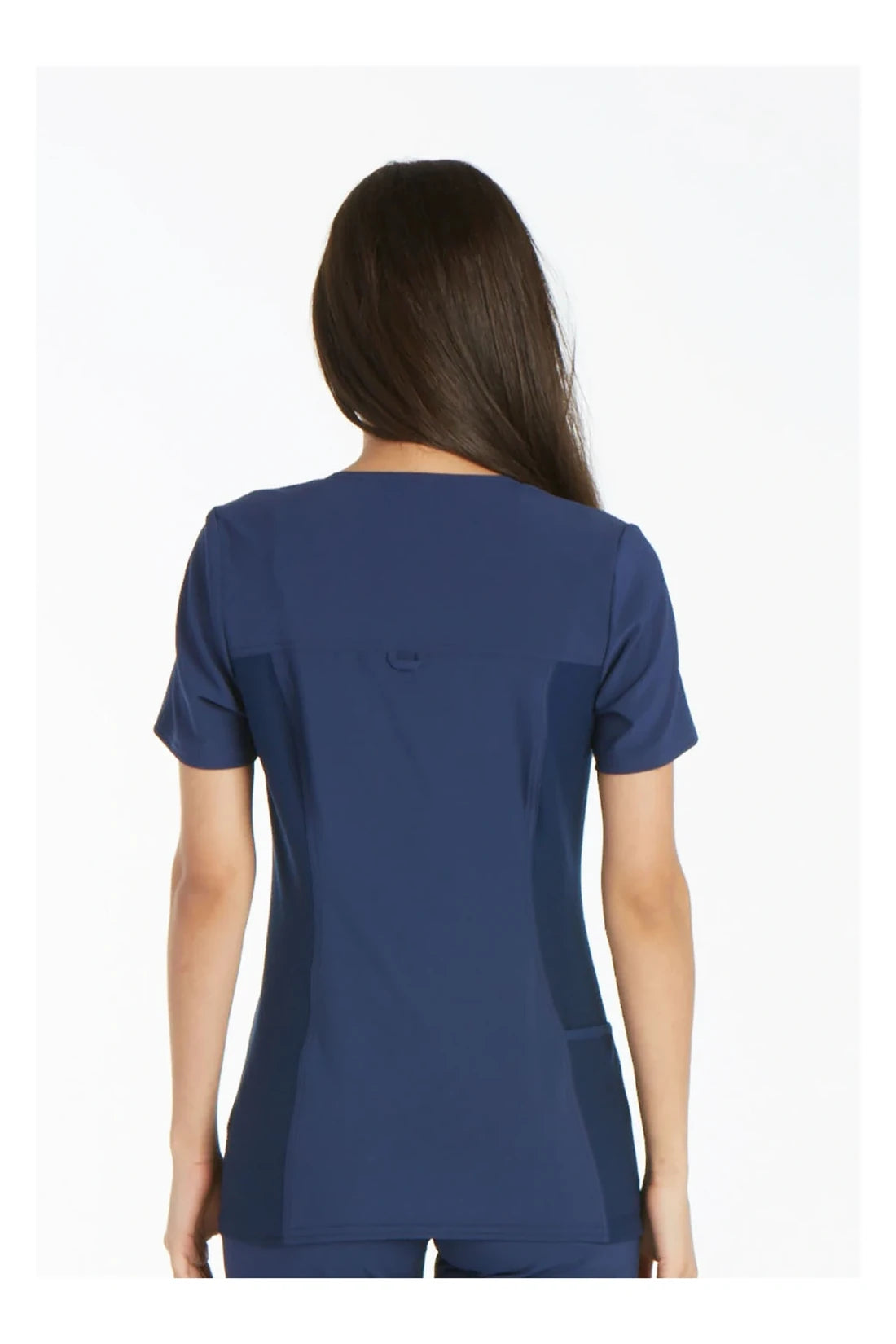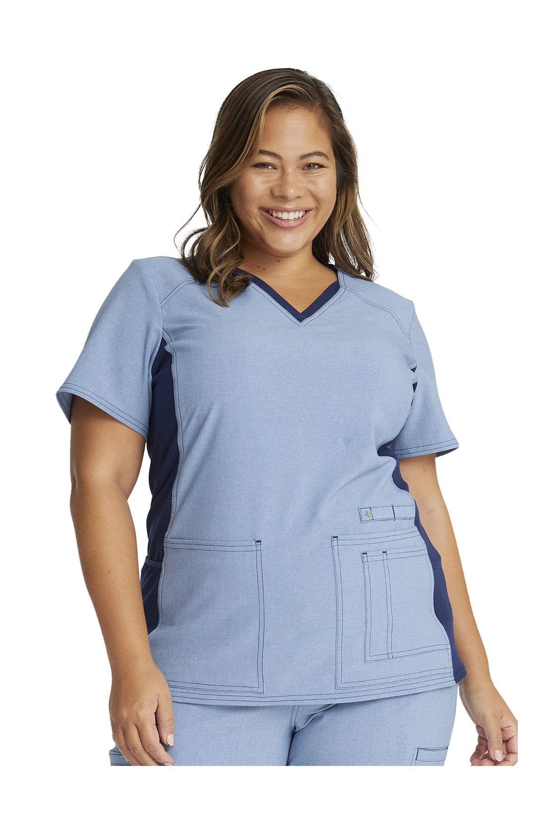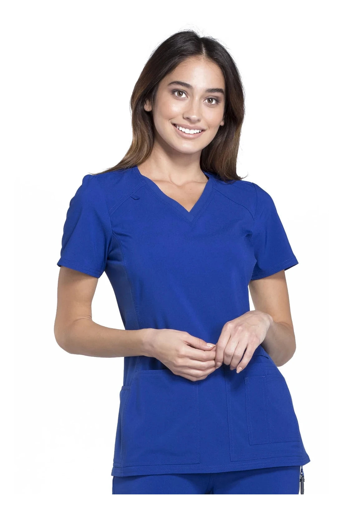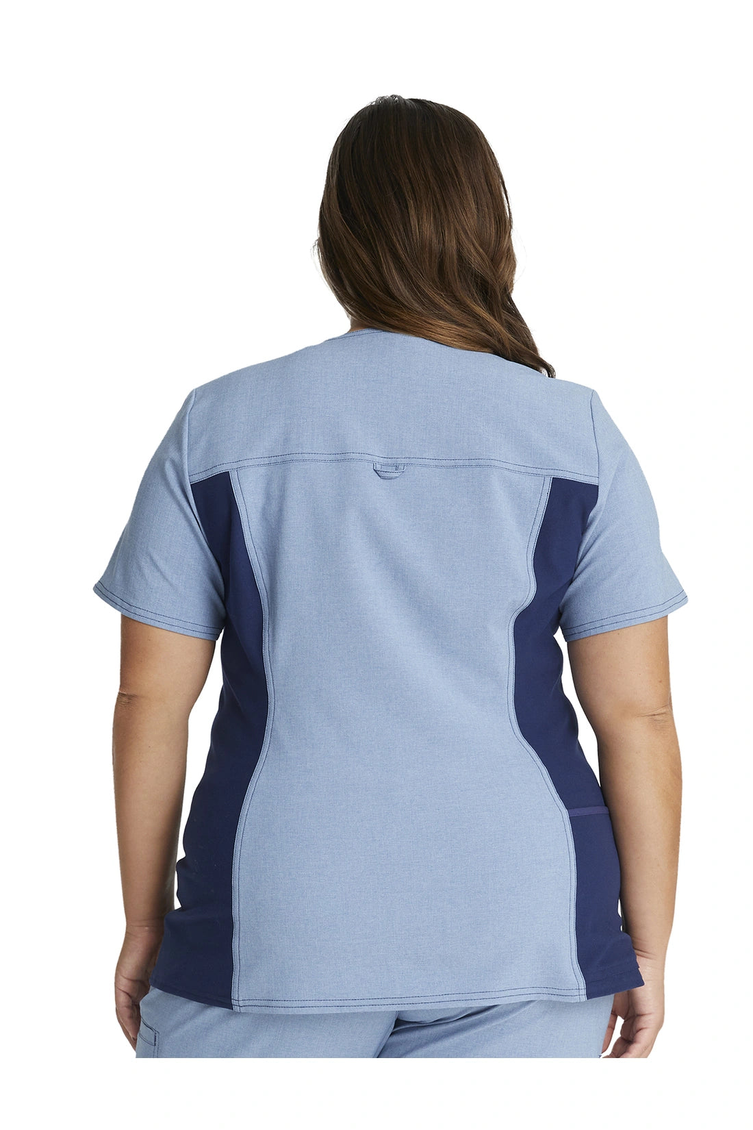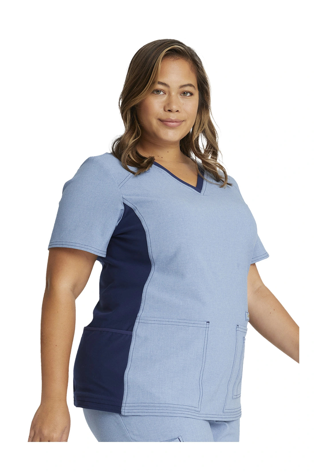 La camiseta de cuello en V de corte contemporáneo cuenta con dos bolsillos de parche delanteros, un bolsillo de tijera, un bolsillo en la cadera derecha y un bucle para instrumentos. También cuenta con un bucle para la tarjeta de identificación y un canesú trasero con bucle para la taquilla. Los paneles laterales delanteros y traseros son de punto suave y elástico para una mayor comodidad y un ajuste favorecedor. Longitud del centro de la espalda: 26". Este duradero tejido dobby elástico combinado con los suaves paneles de punto proporcionan la máxima comodidad, movimiento y flexibilidad.