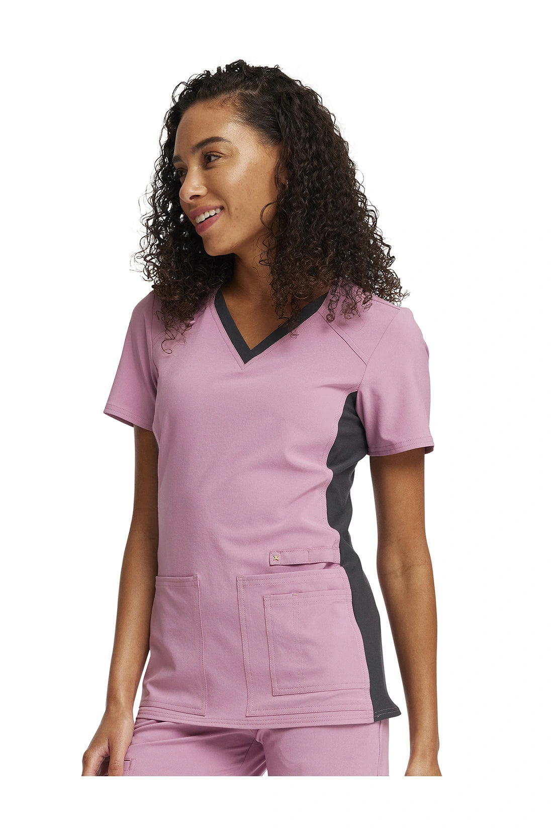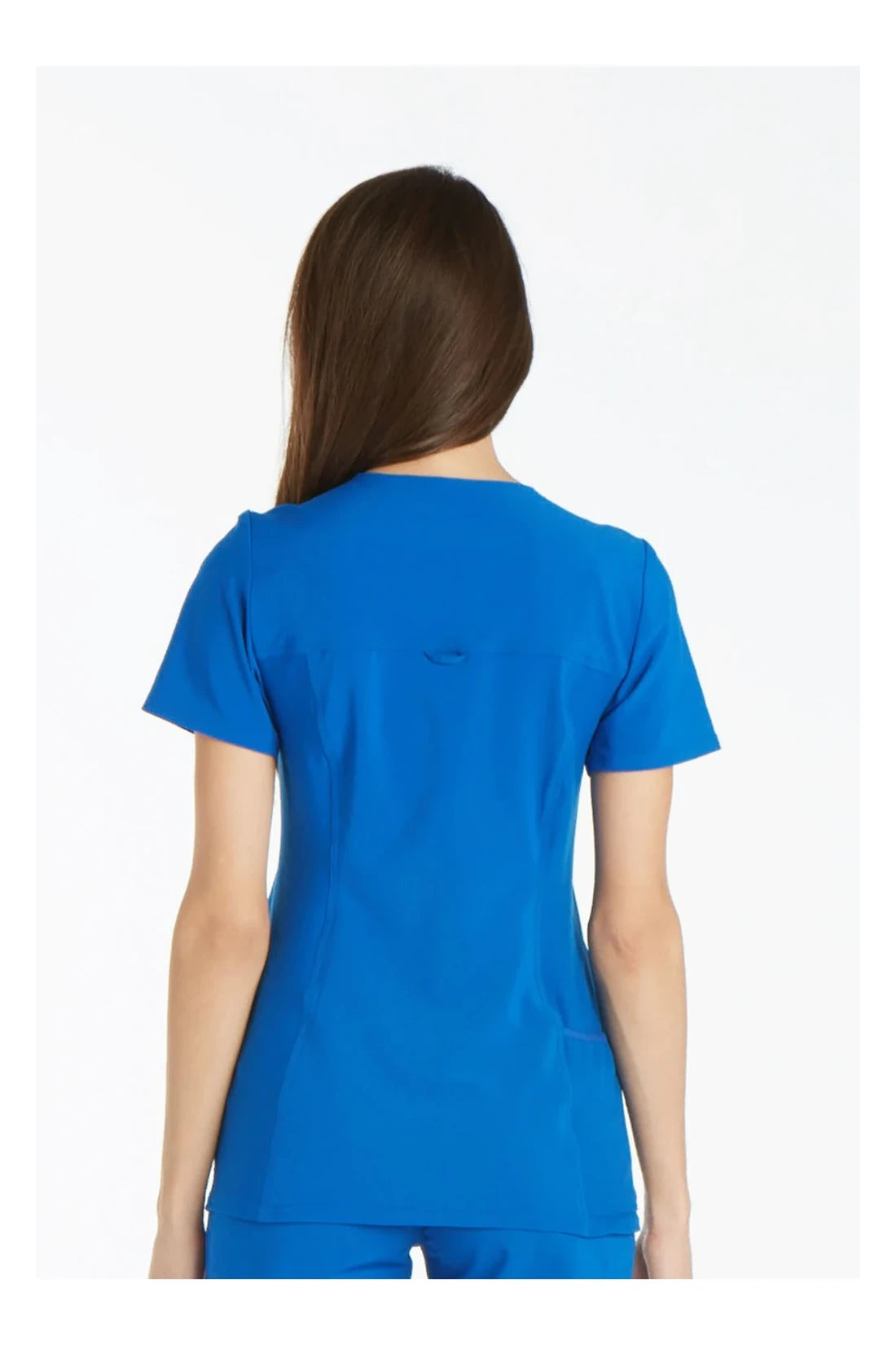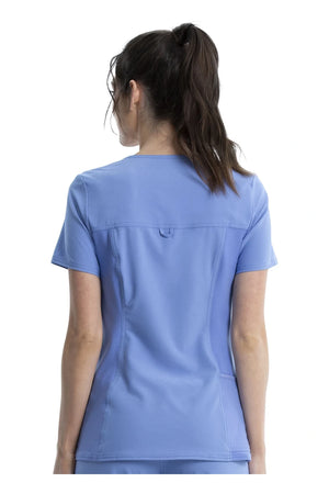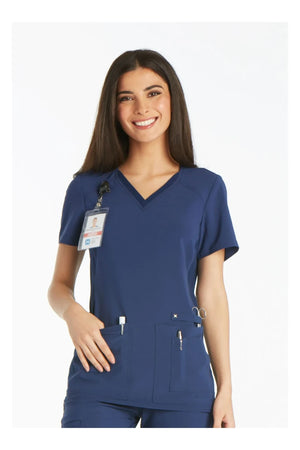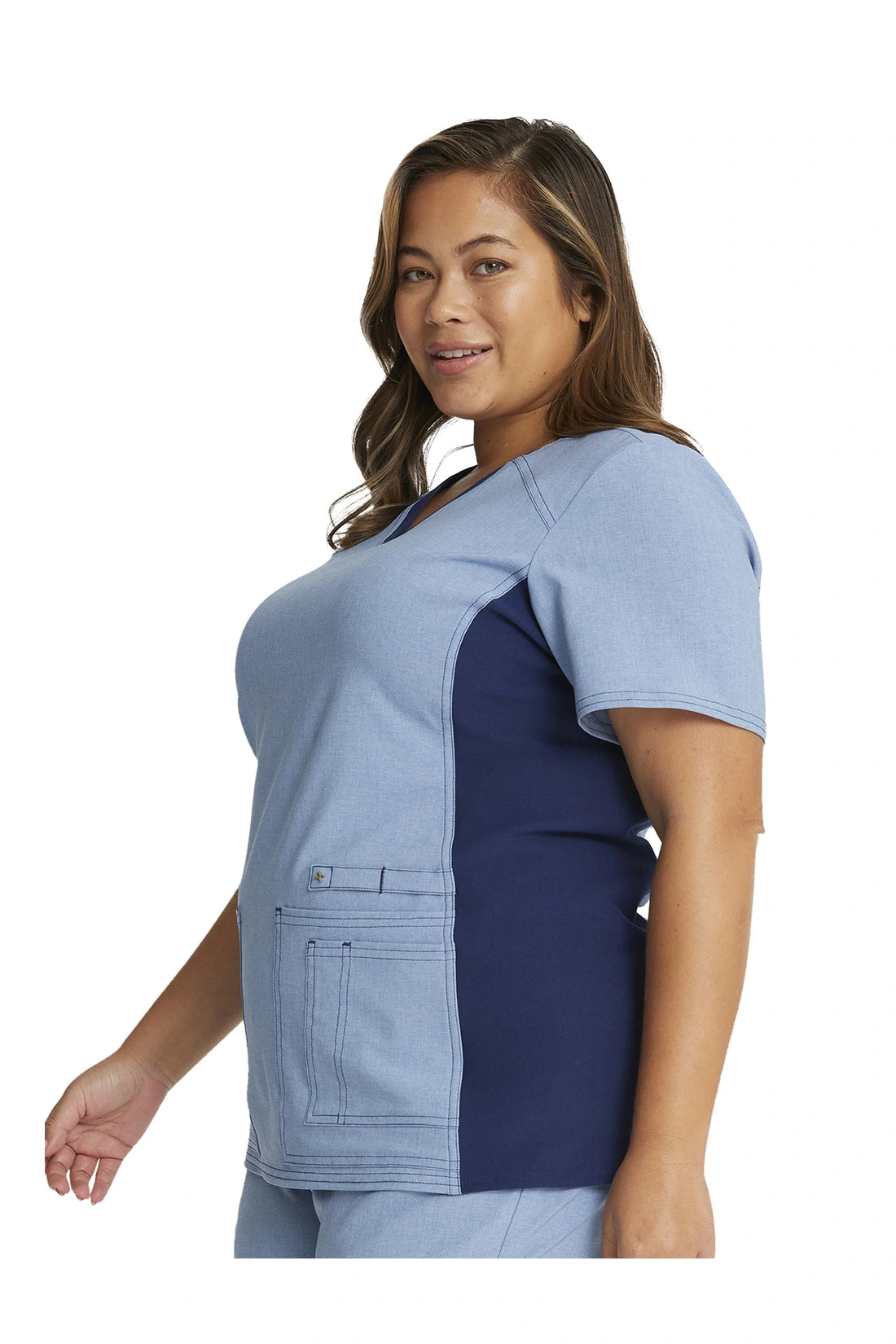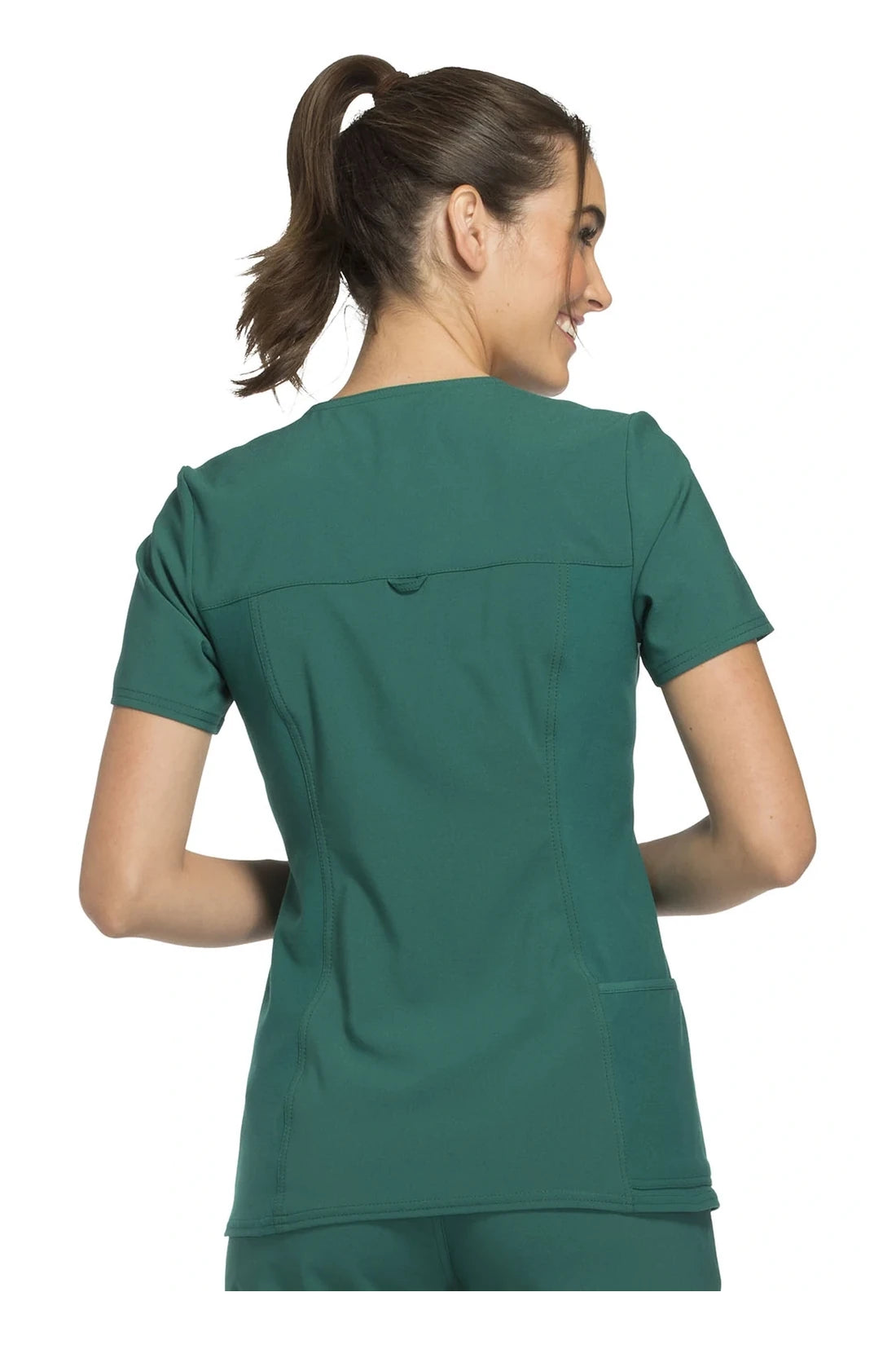 La camiseta de cuello en V de corte contemporáneo cuenta con dos bolsillos de parche delanteros, un bolsillo de tijera, un bolsillo en la cadera derecha y un bucle para instrumentos. También cuenta con un bucle para la tarjeta de identificación y un canesú trasero con bucle para la taquilla. Los paneles laterales delanteros y traseros son de punto suave y elástico para una mayor comodidad y un ajuste favorecedor. Longitud del centro de la espalda: 26". Este duradero tejido dobby elástico combinado con los suaves paneles de punto proporcionan la máxima comodidad, movimiento y flexibilidad.