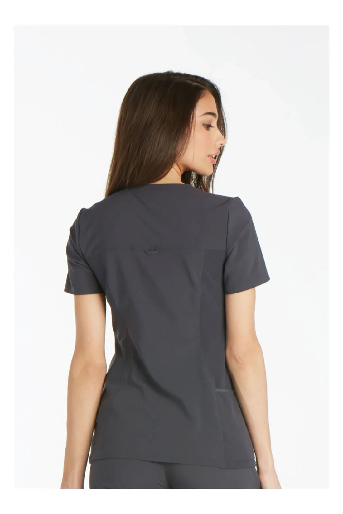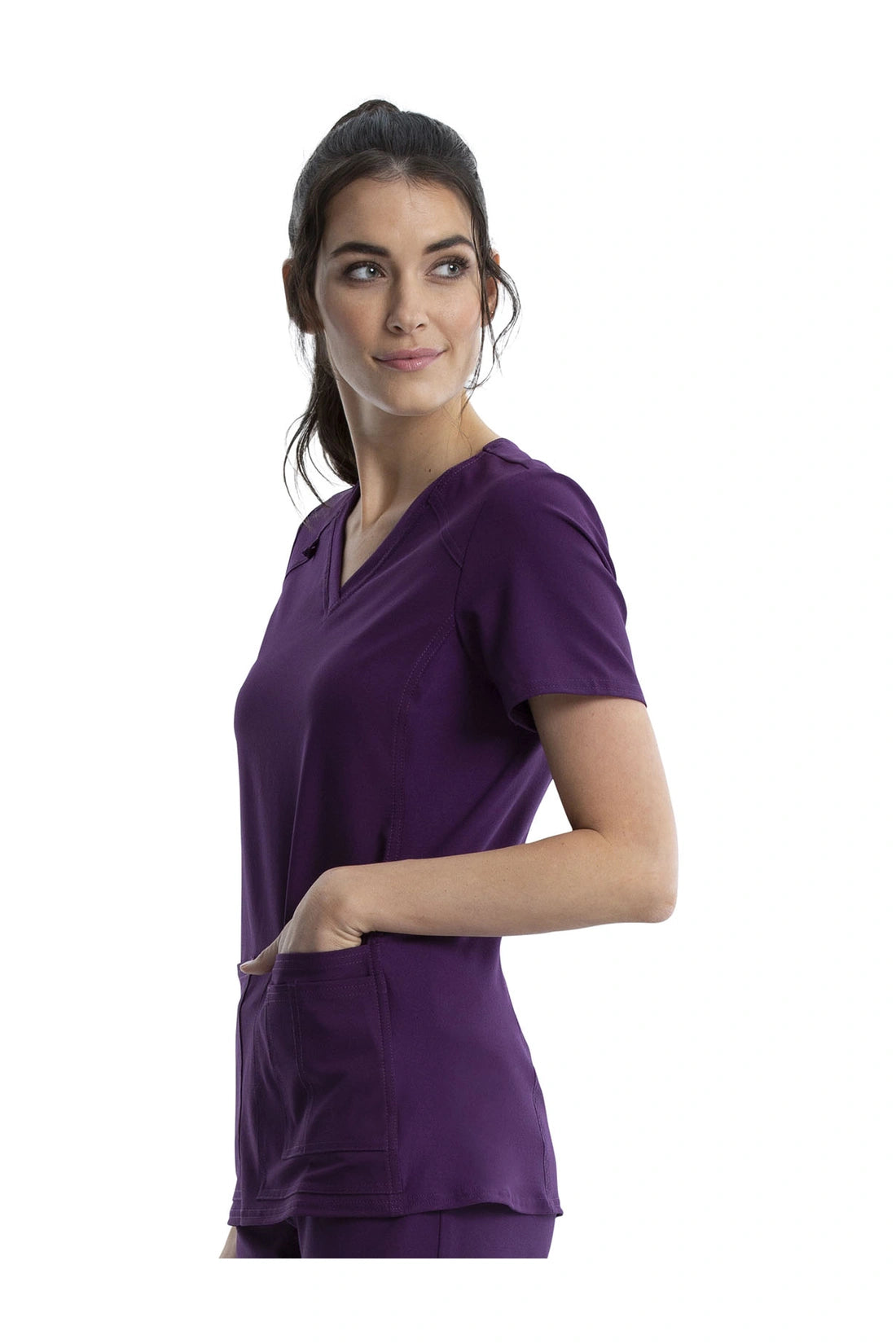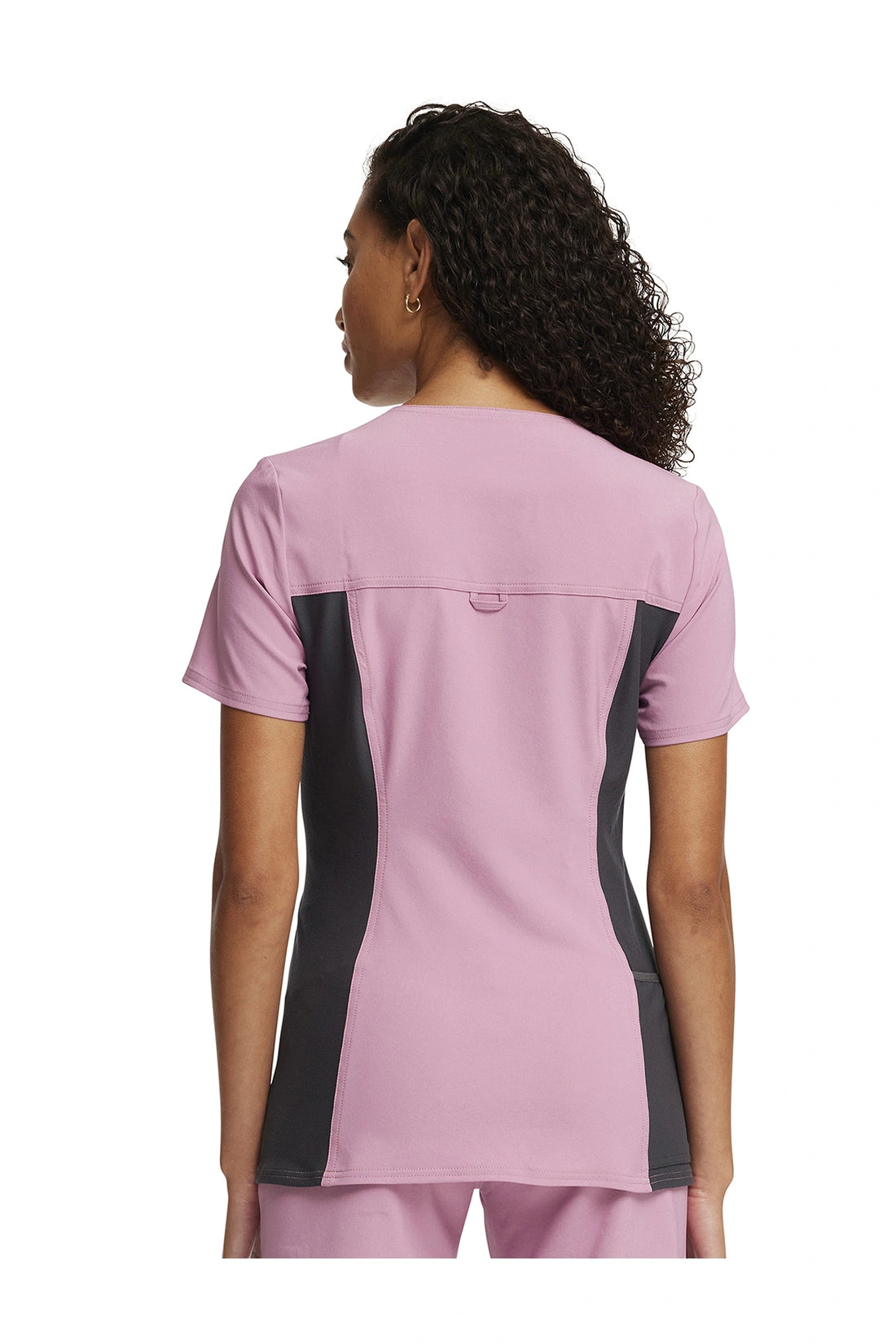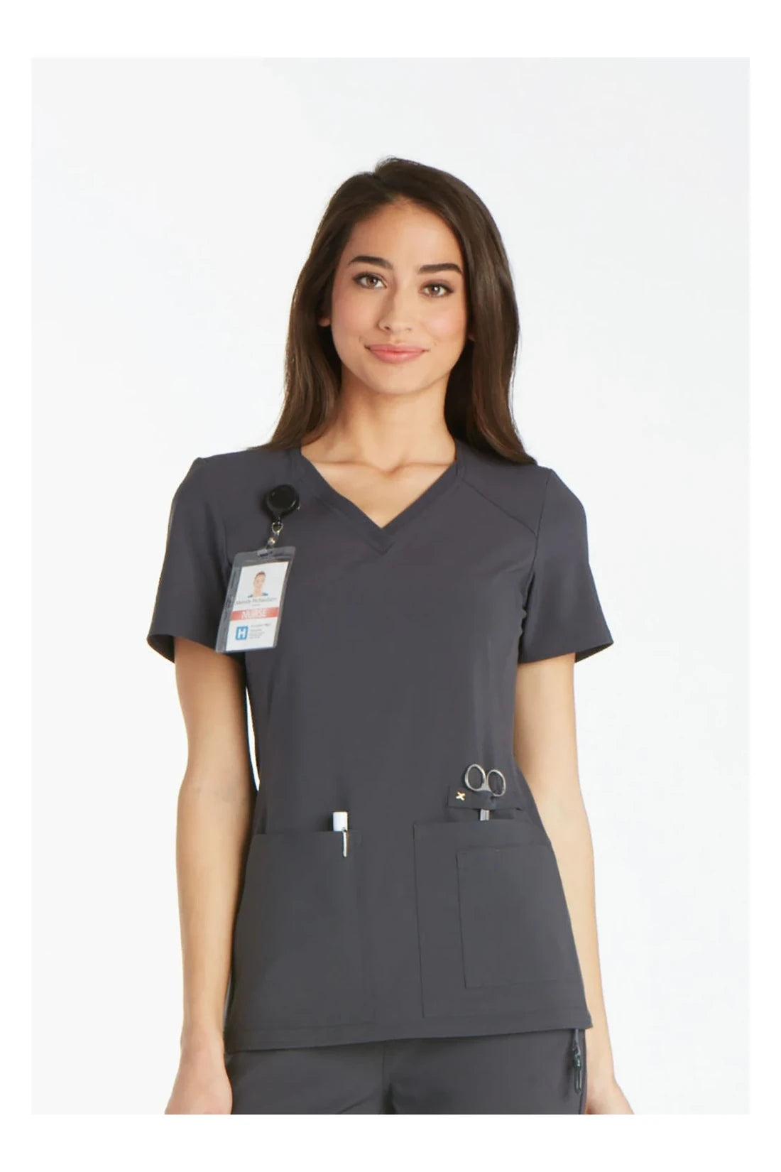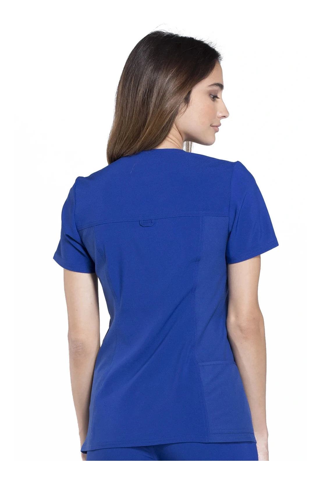 La camiseta de cuello en V de corte contemporáneo cuenta con dos bolsillos de parche delanteros, un bolsillo de tijera, un bolsillo en la cadera derecha y un bucle para instrumentos. También cuenta con un bucle para la tarjeta de identificación y un canesú trasero con bucle para la taquilla. Los paneles laterales delanteros y traseros son de punto suave y elástico para una mayor comodidad y un ajuste favorecedor. Longitud del centro de la espalda: 26". Este duradero tejido dobby elástico combinado con los suaves paneles de punto proporcionan la máxima comodidad, movimiento y flexibilidad.