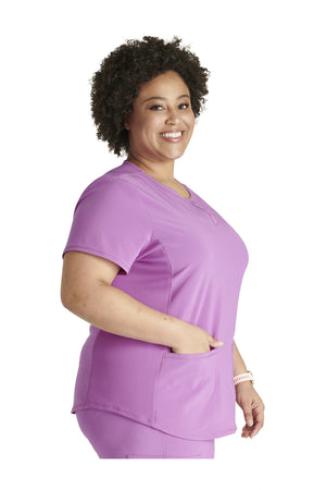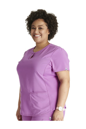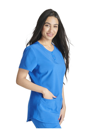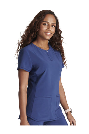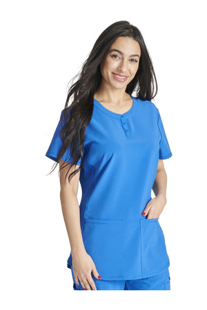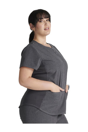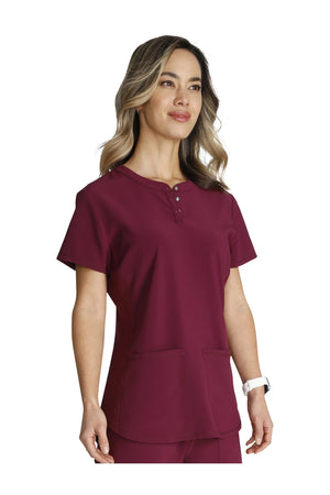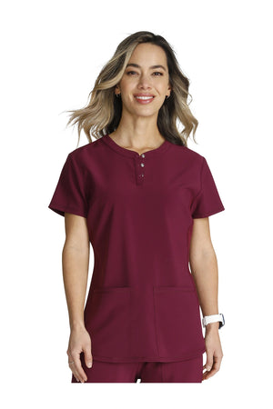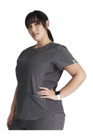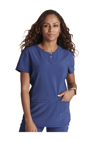 Esta camiseta de corte contemporáneo tiene tres botones a presión funcionales en el cuello. Otras características incluyen costuras princesa delanteras y traseras, paneles laterales de punto elástico, dos bolsillos de parche delanteros y dobladillo redondeado. Largo en el centro de la espalda: 26".