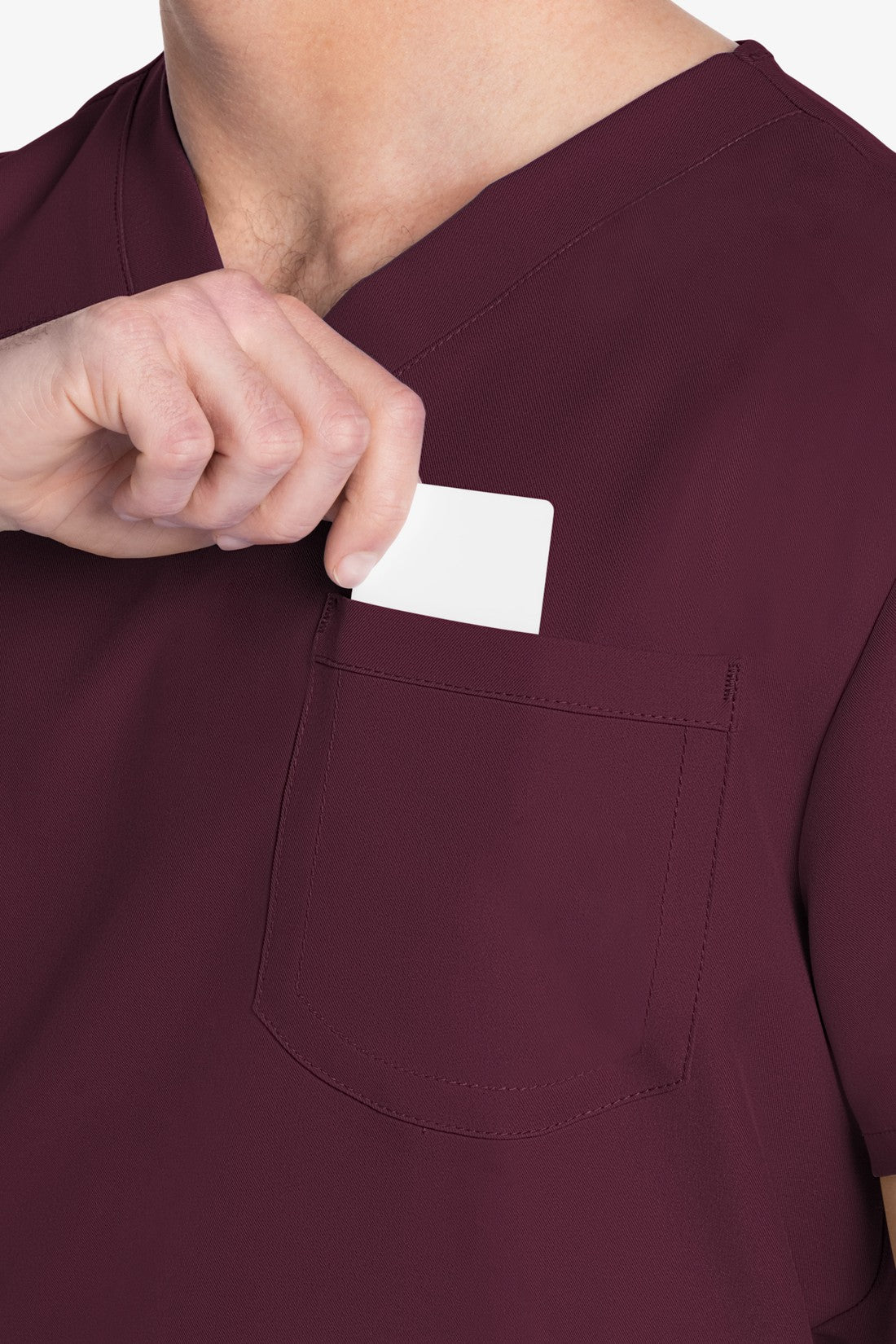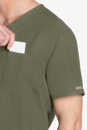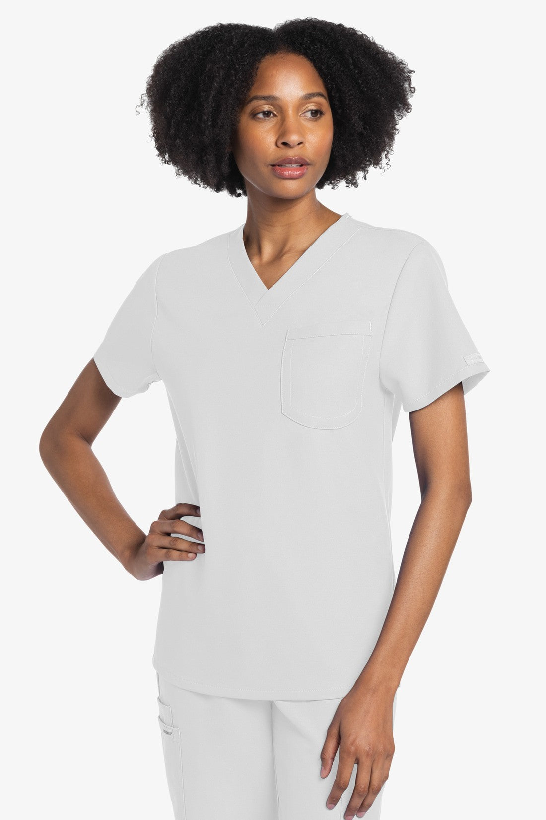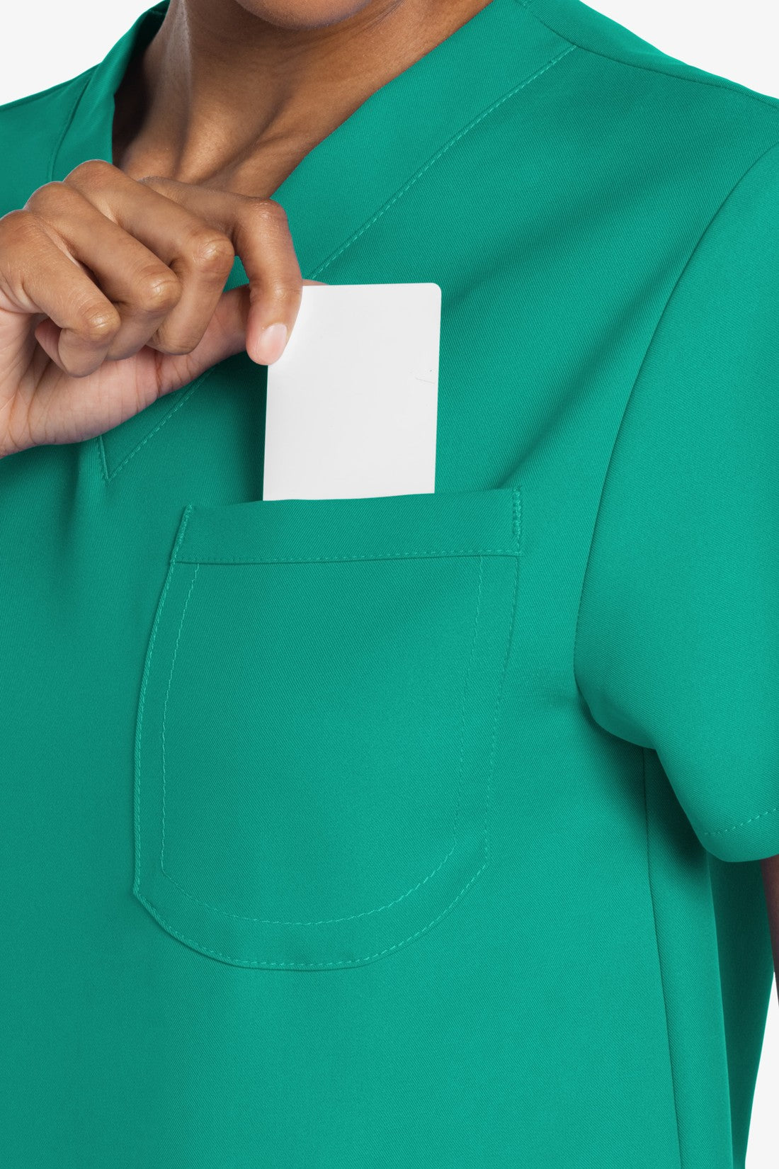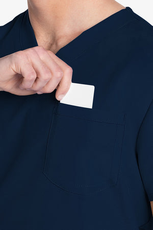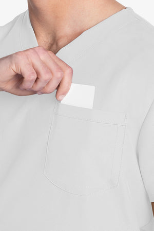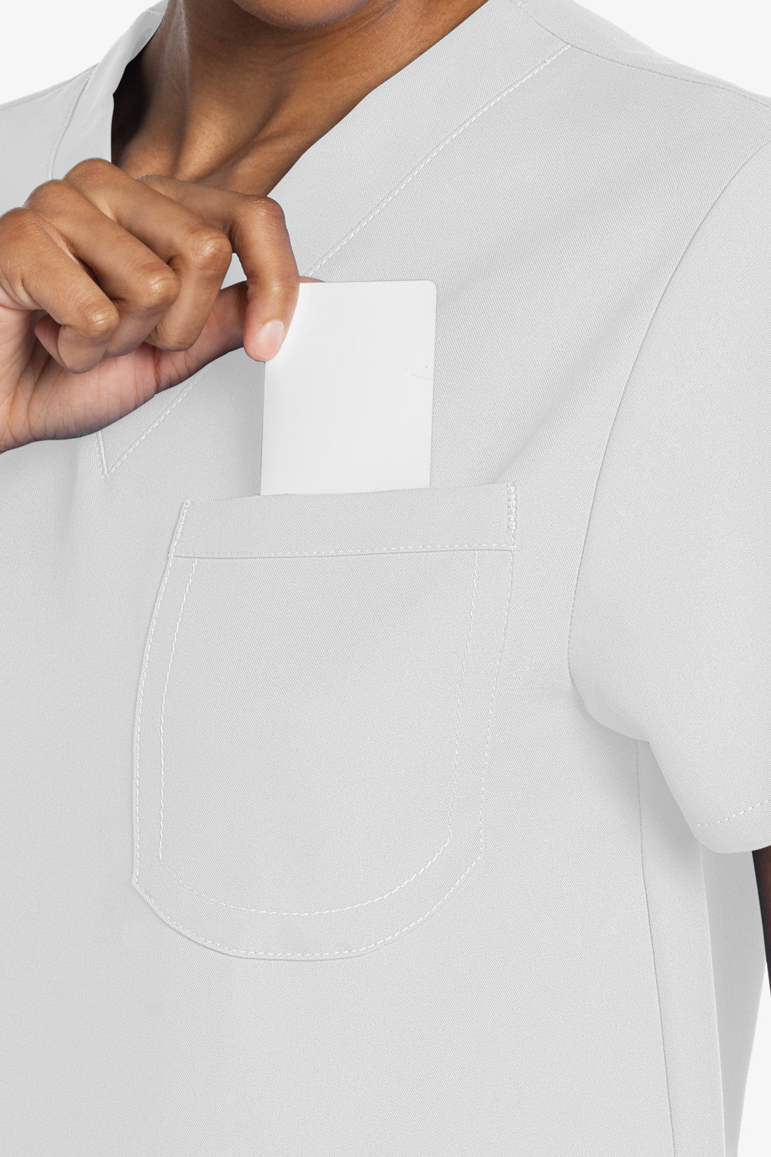 Este top de corte unisex con cuello de pico ofrece un estilo clásico sin distinción de género. Bolsillo de parche en el pecho con ribete en el bajo. Pespuntes decorativos a tono. Largo de la espalda: 28