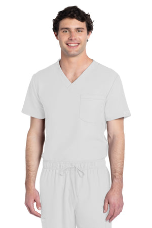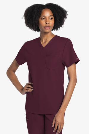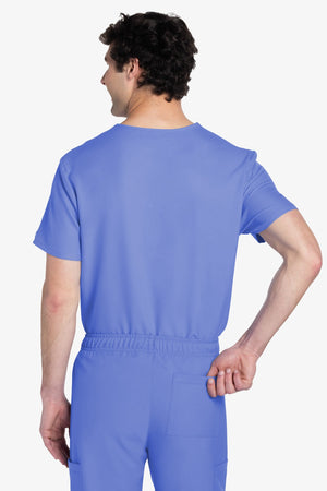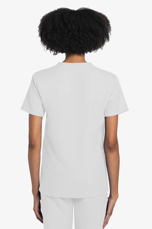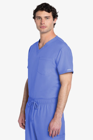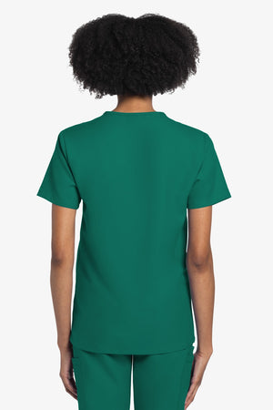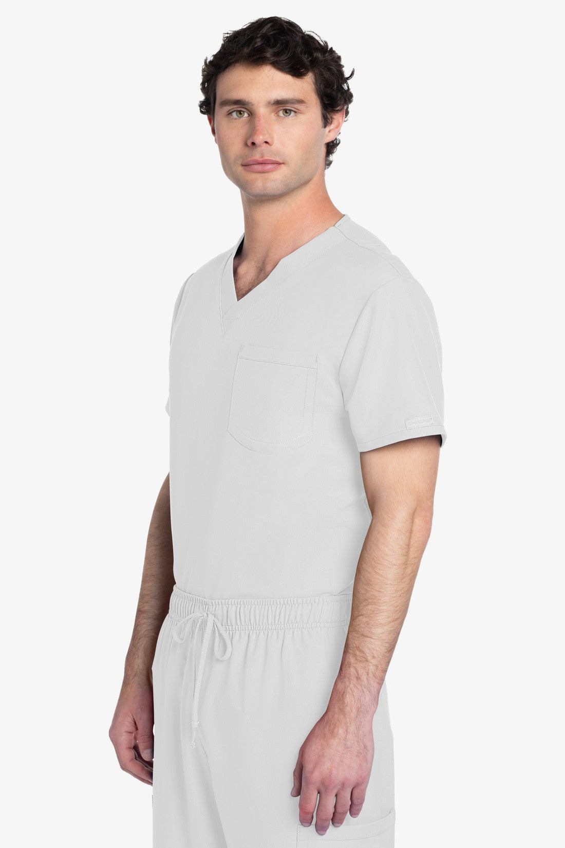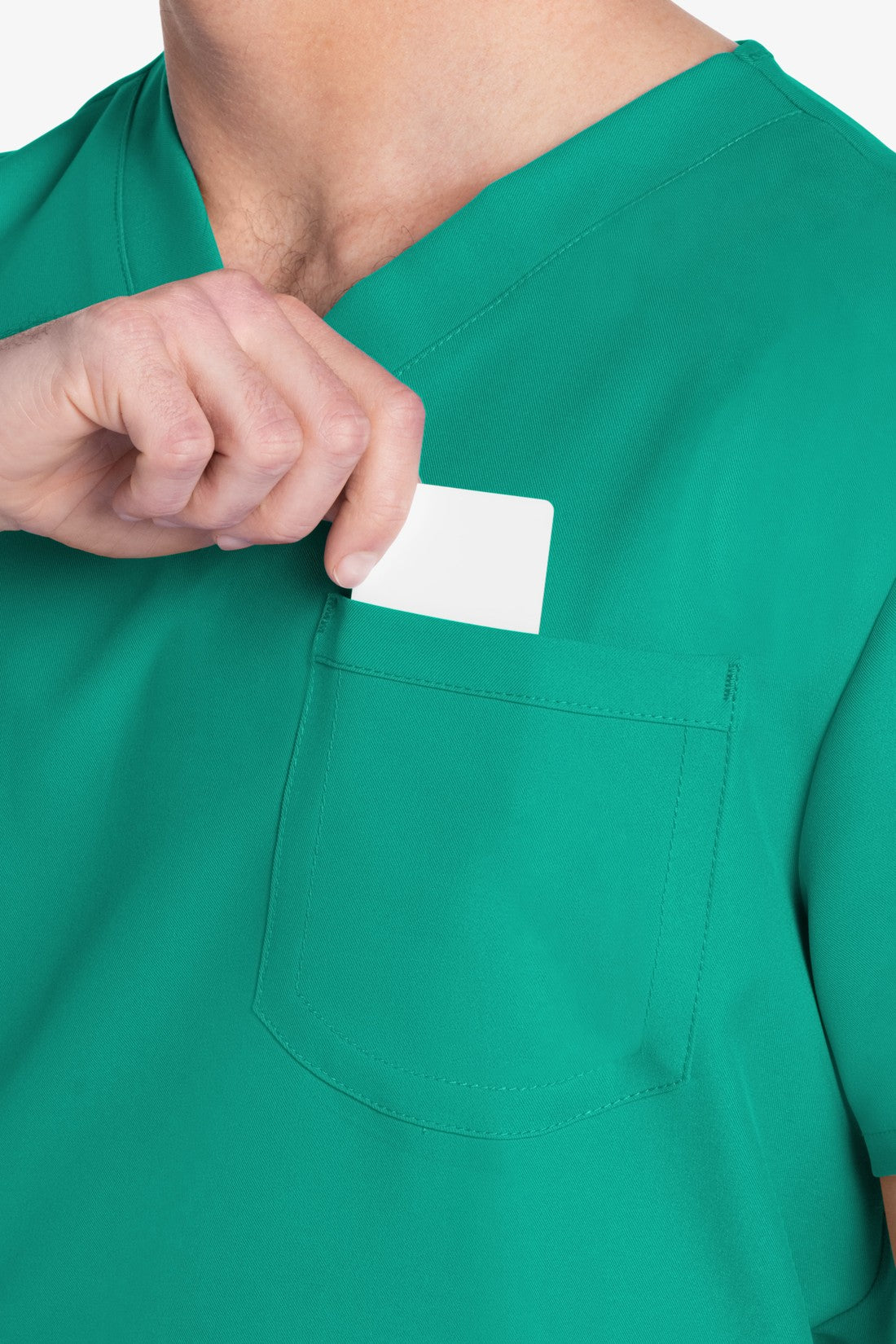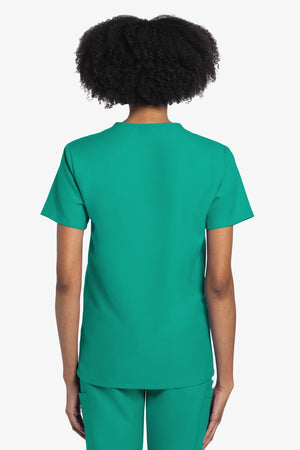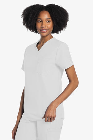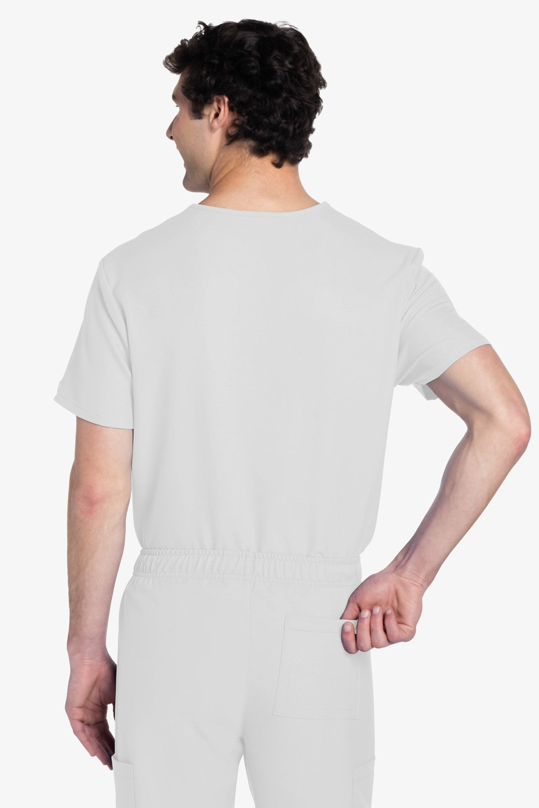 Este top de corte unisex con cuello de pico ofrece un estilo clásico sin distinción de género. Bolsillo de parche en el pecho con ribete en el bajo. Pespuntes decorativos a tono. Largo de la espalda: 28