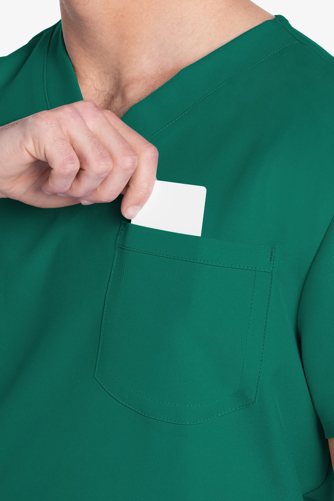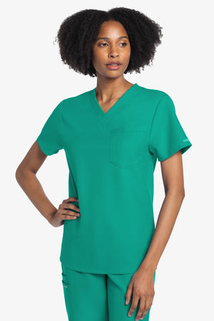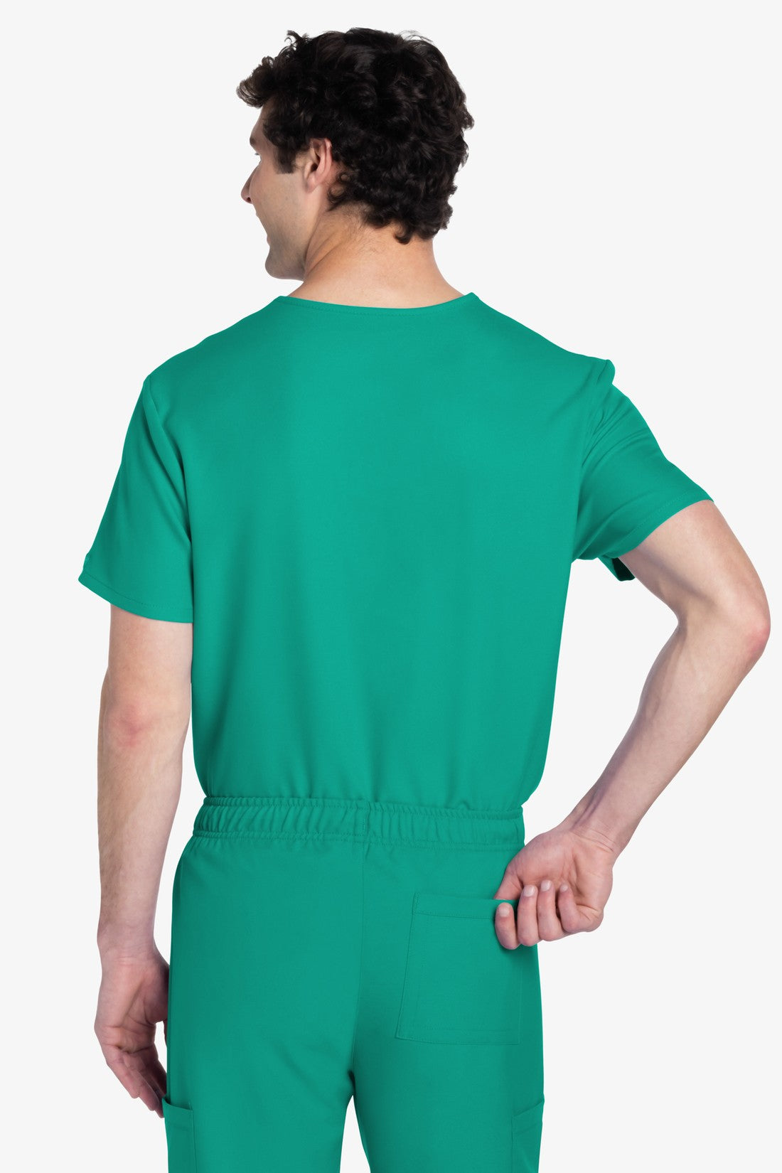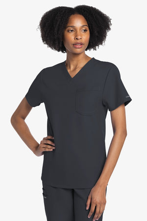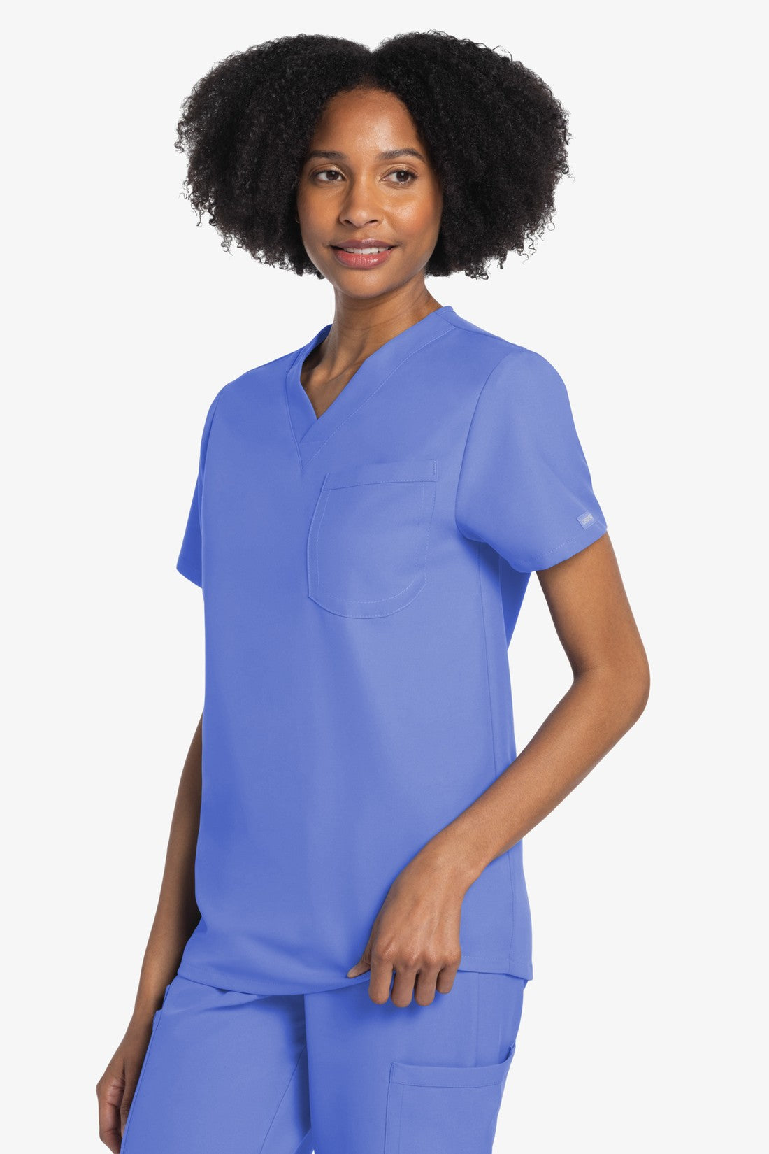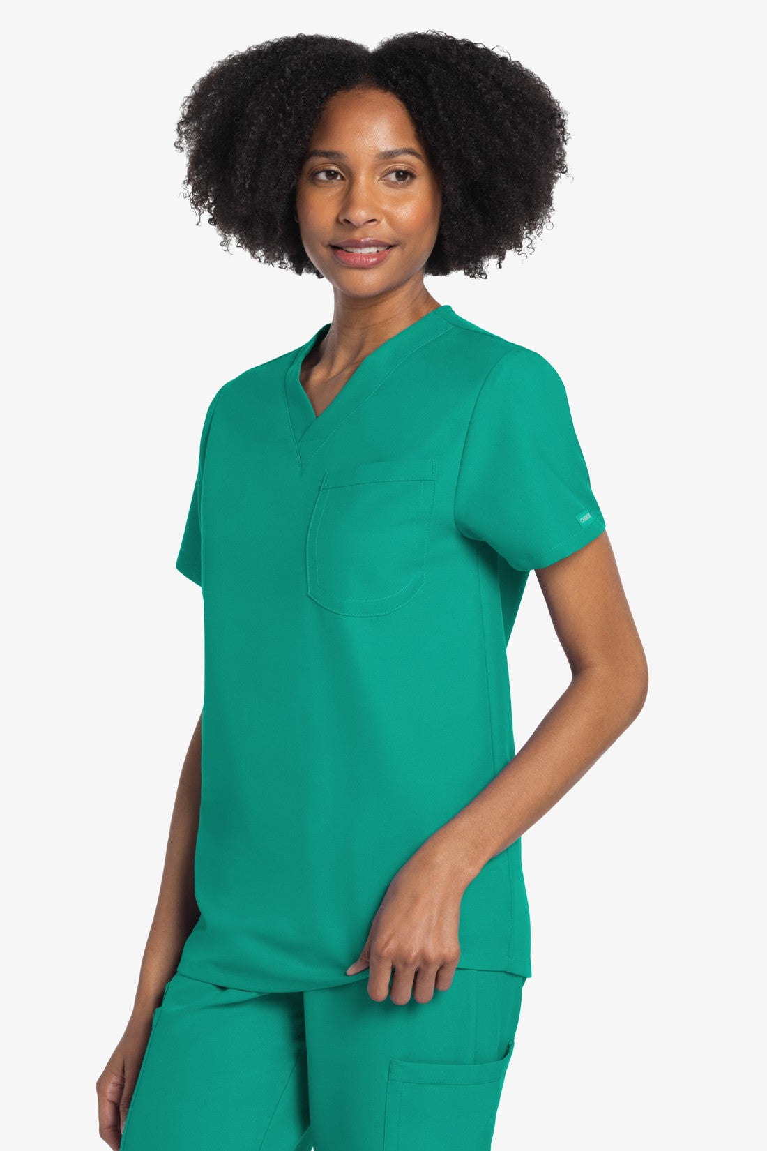 Este top de corte unisex con cuello de pico ofrece un estilo clásico sin distinción de género. Bolsillo de parche en el pecho con ribete en el bajo. Pespuntes decorativos a tono. Largo de la espalda: 28