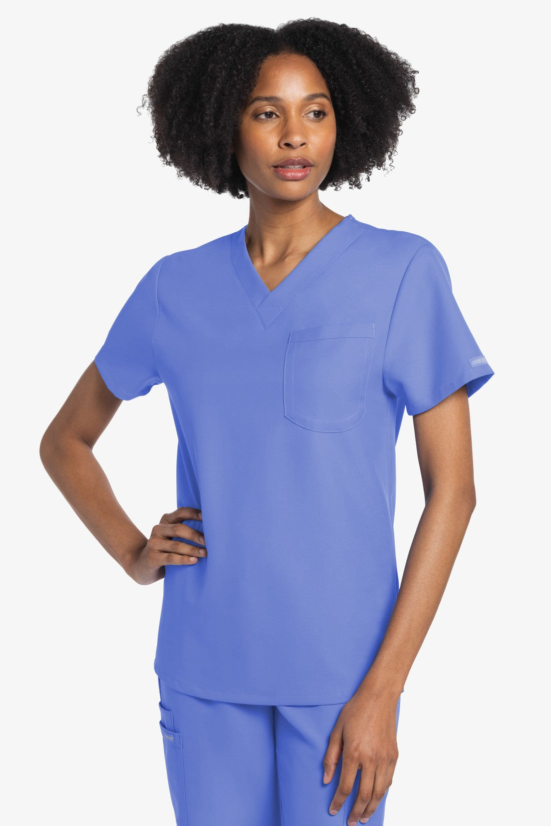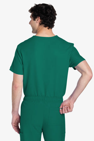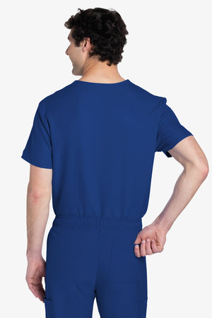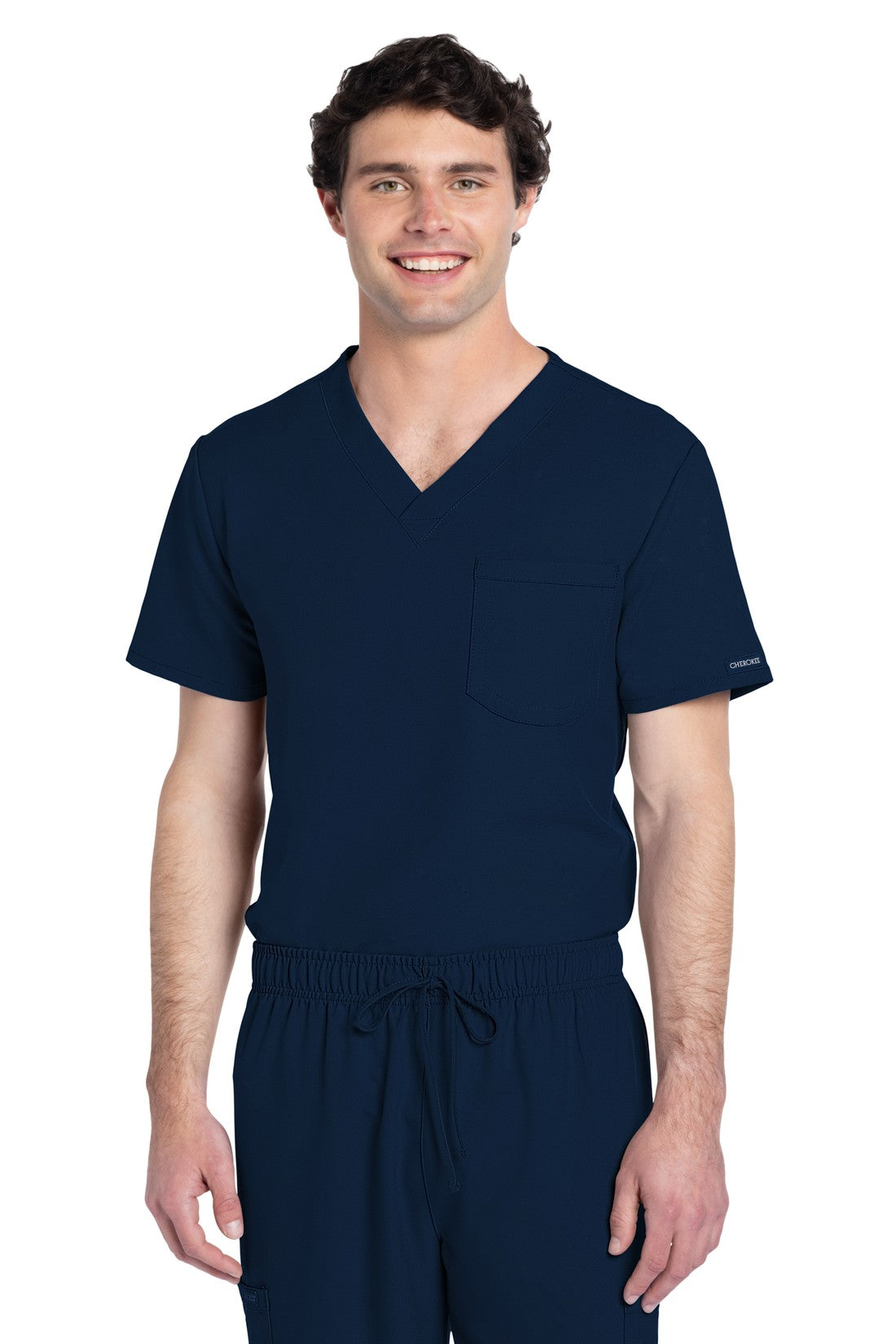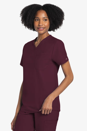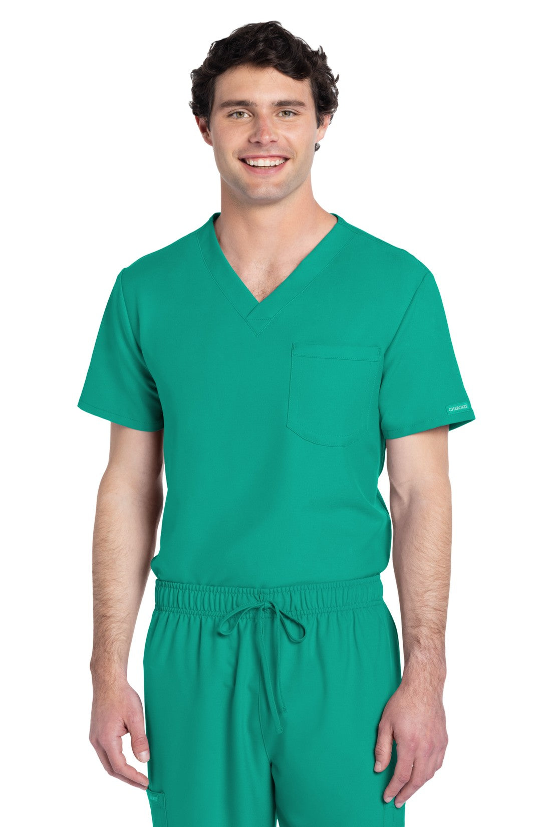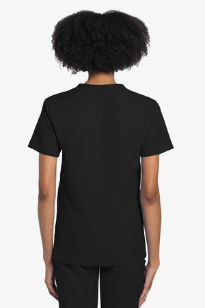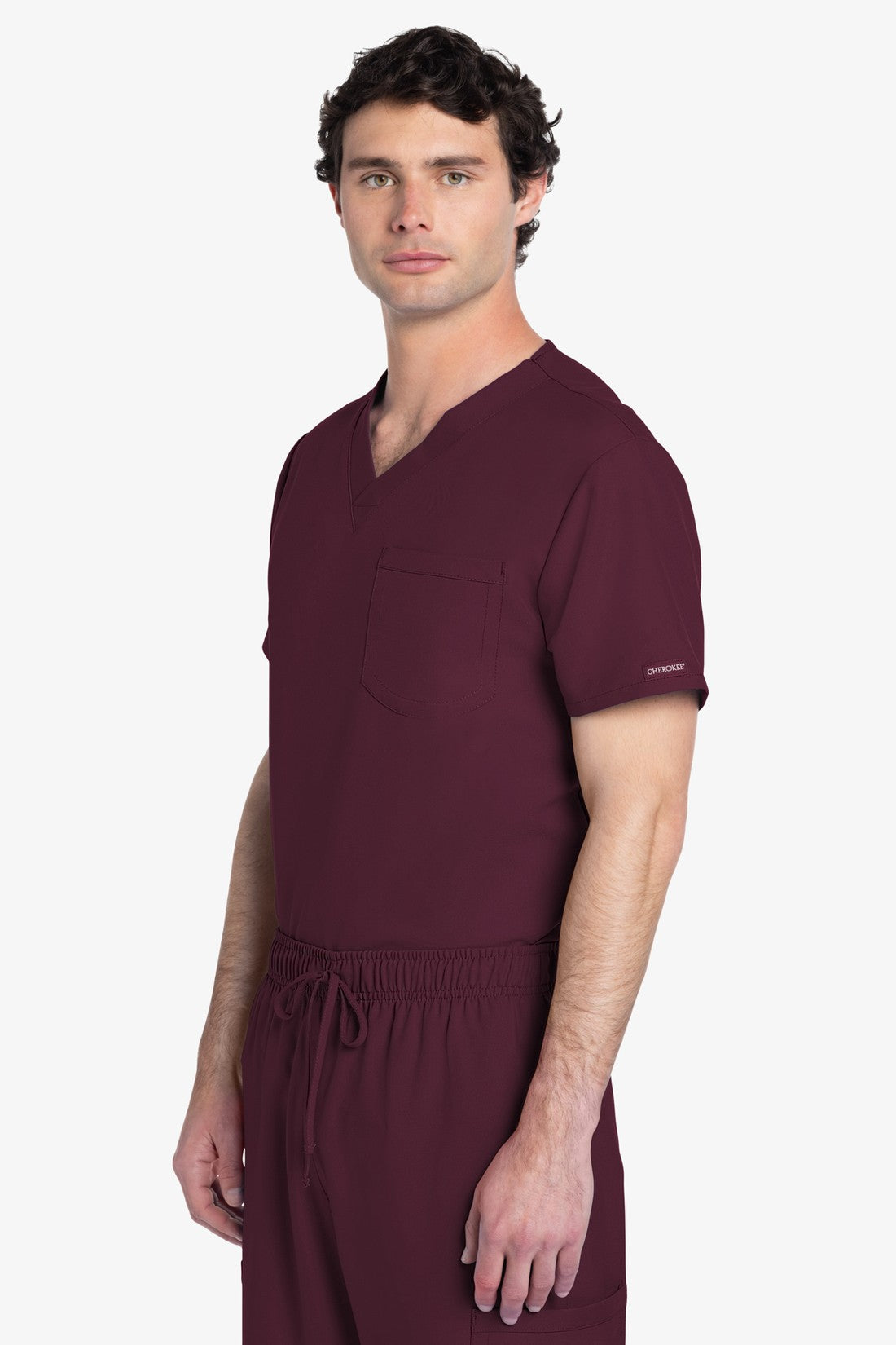 Este top de corte unisex con cuello de pico ofrece un estilo clásico sin distinción de género. Bolsillo de parche en el pecho con ribete en el bajo. Pespuntes decorativos a tono. Largo de la espalda: 28