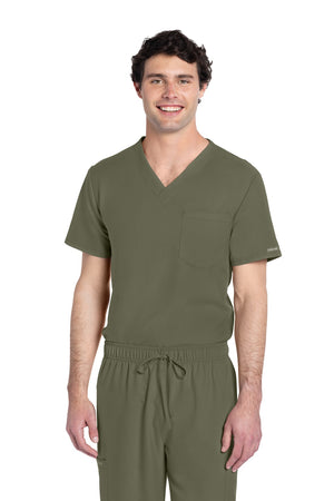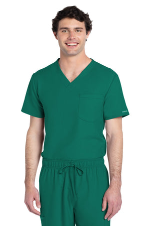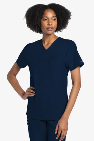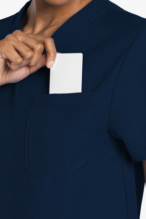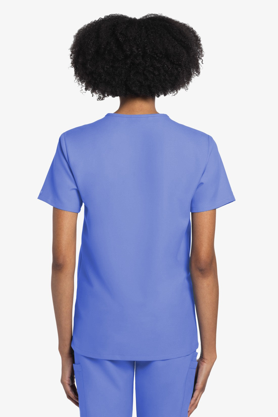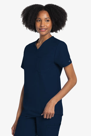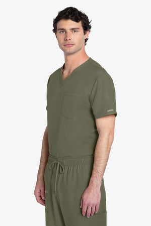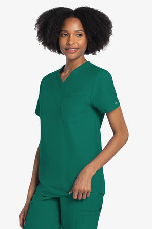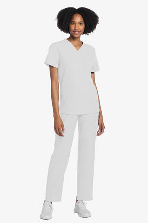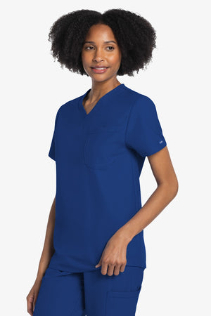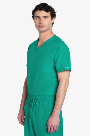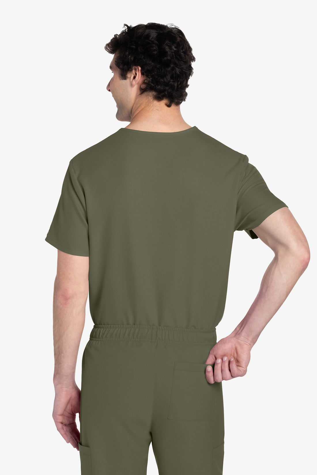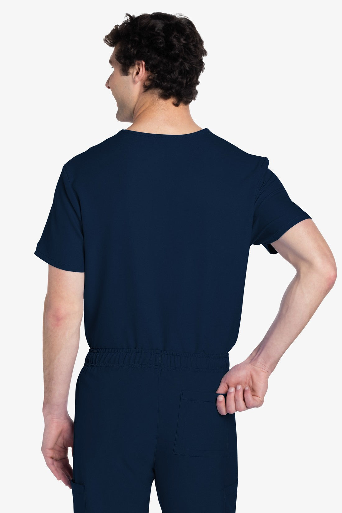 Este top de corte unisex con cuello de pico ofrece un estilo clásico sin distinción de género. Bolsillo de parche en el pecho con ribete en el bajo. Pespuntes decorativos a tono. Largo de la espalda: 28