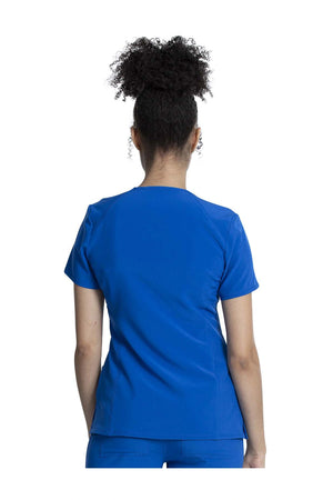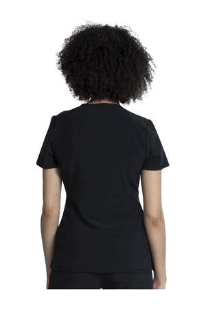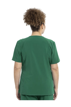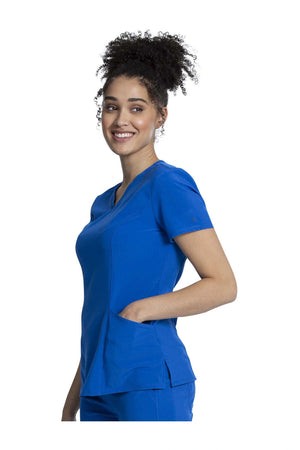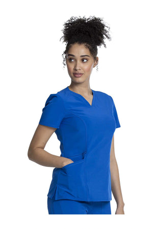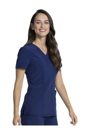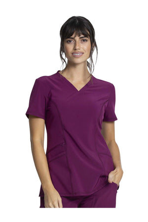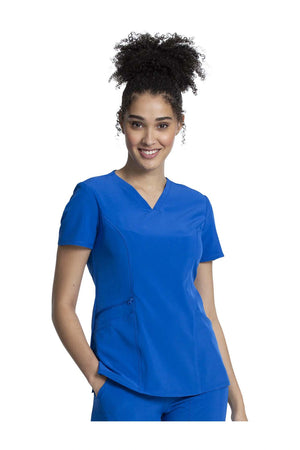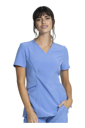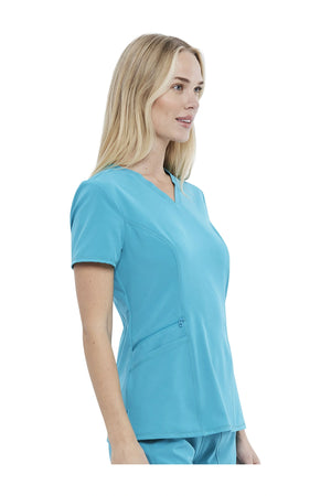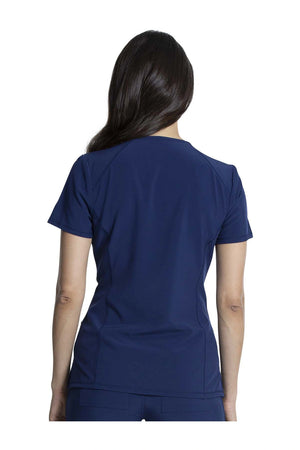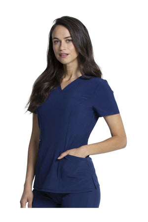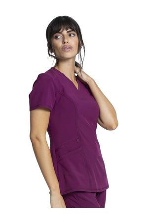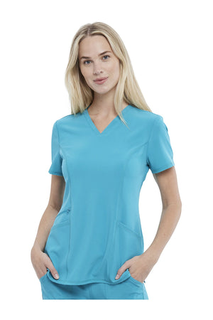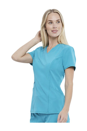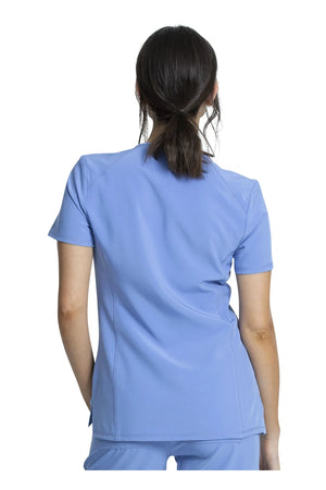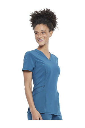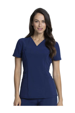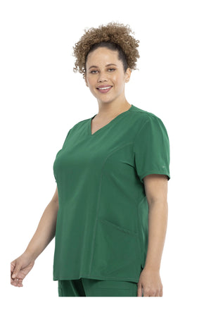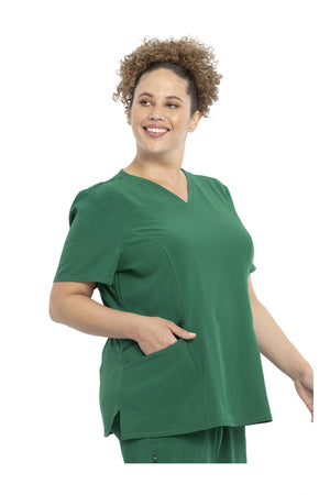 Este top de corte contemporáneo con cuello en V presenta costuras princesa delante y detrás, además de costuras en el canesú trasero. Tiene tres bolsillos: dos bolsillos de parche delanteros y un bolsillo con cremallera para el móvil encima del bolsillo de parche derecho. Las aberturas laterales facilitan el movimiento. Longitud en el centro de la espalda: 26".