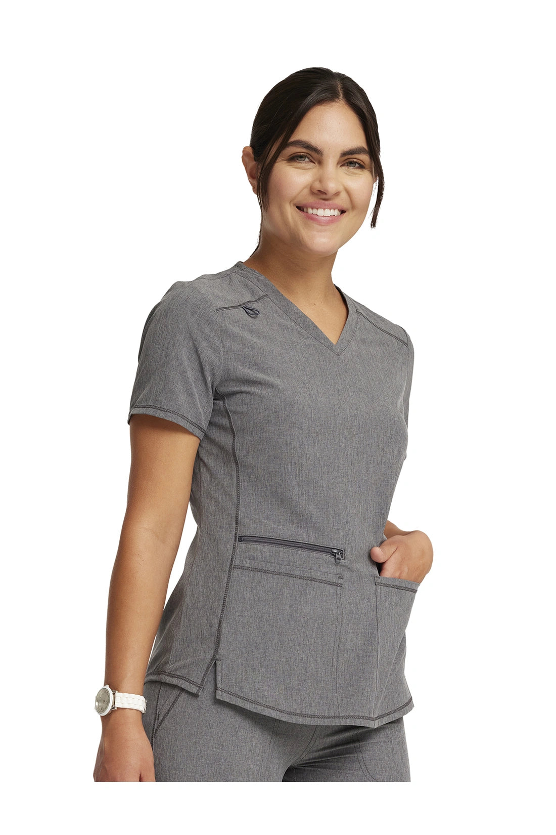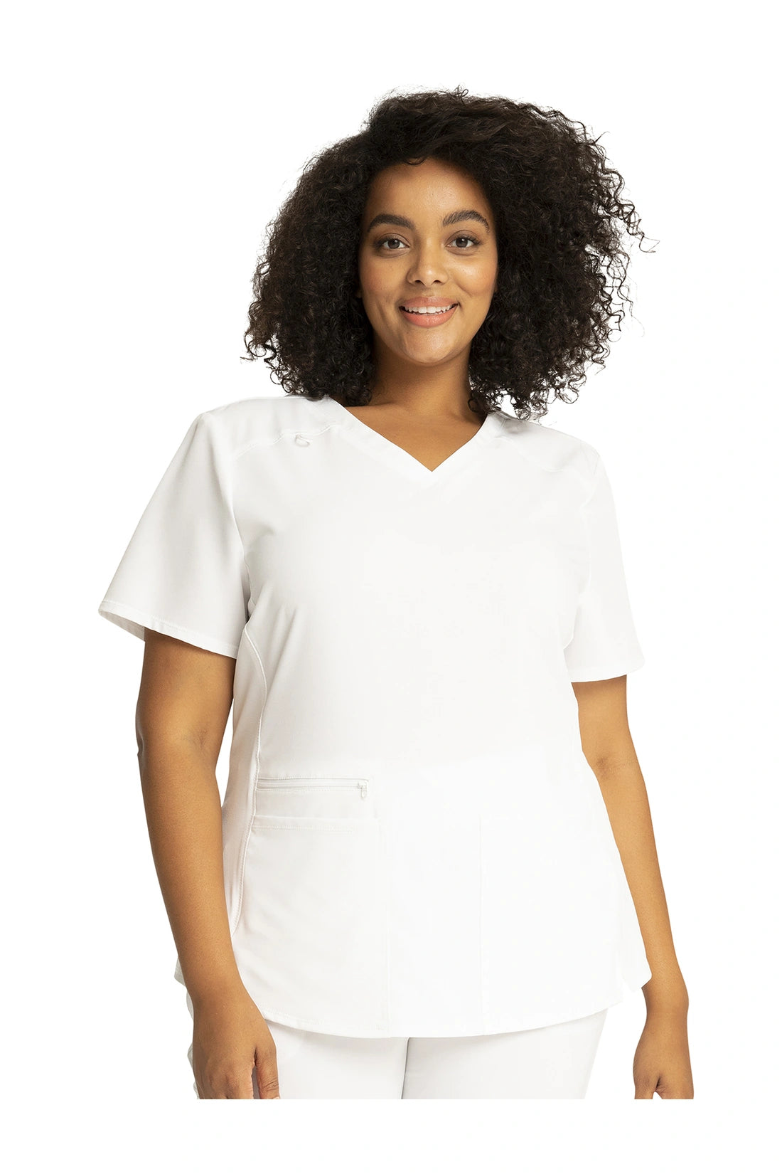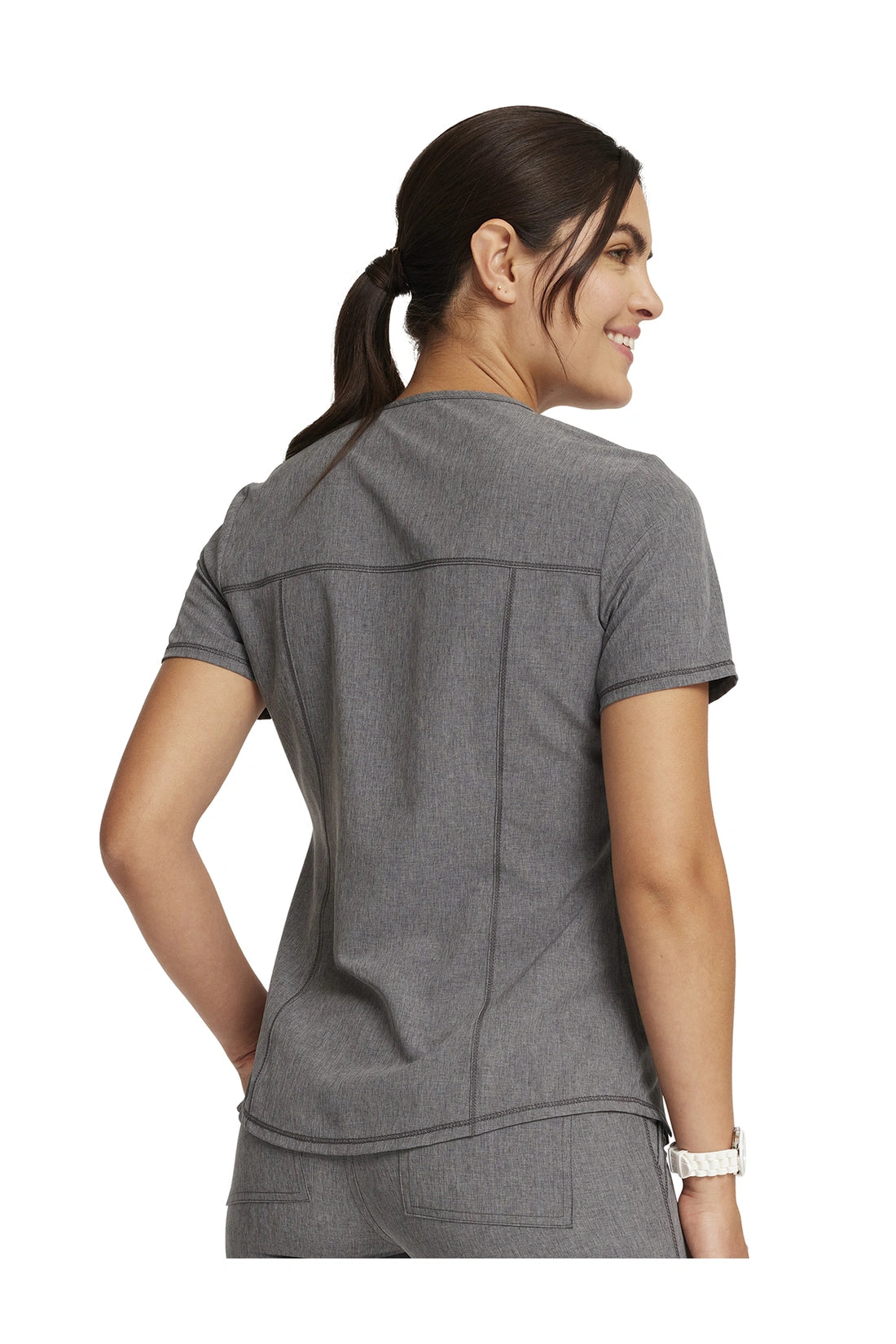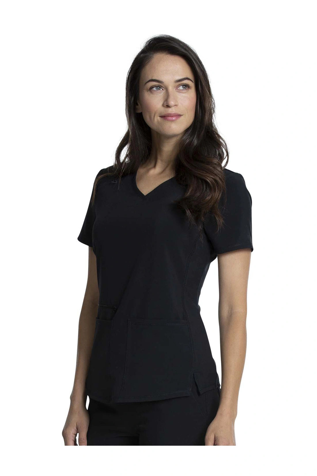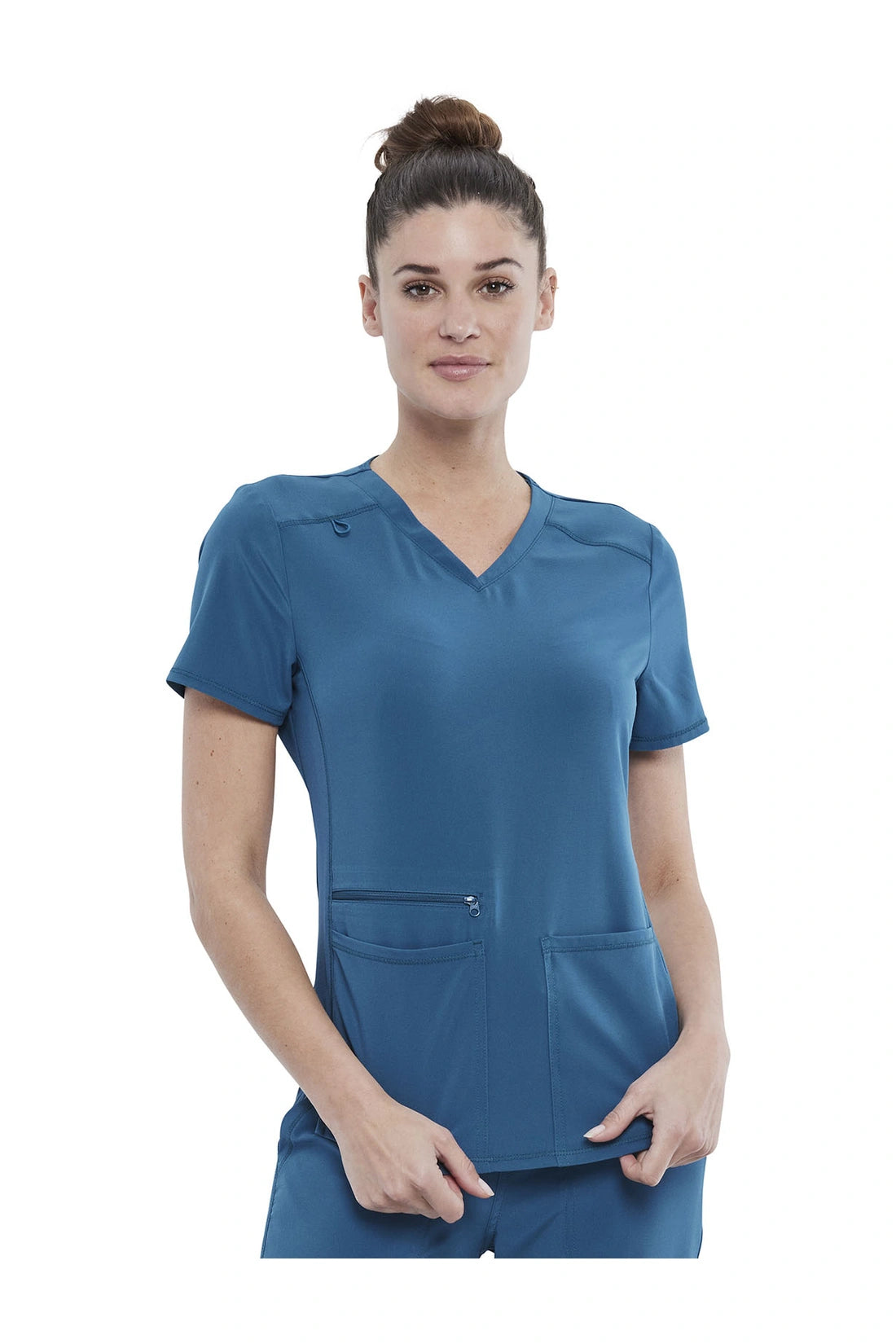 Esta camiseta con cuello en V de corte contemporáneo tiene costuras en los canesúes delanteros y traseros y un bucle de identificación en el canesú delantero derecho. Otras características son las costuras delanteras y traseras tipo princesa, los paneles laterales delanteros, las aberturas laterales y el dobladillo en cola de camisa. Hay tres bolsillos: dos bolsillos de parche delanteros y un bolsillo con cremallera para el móvil. Longitud de la espalda: 26