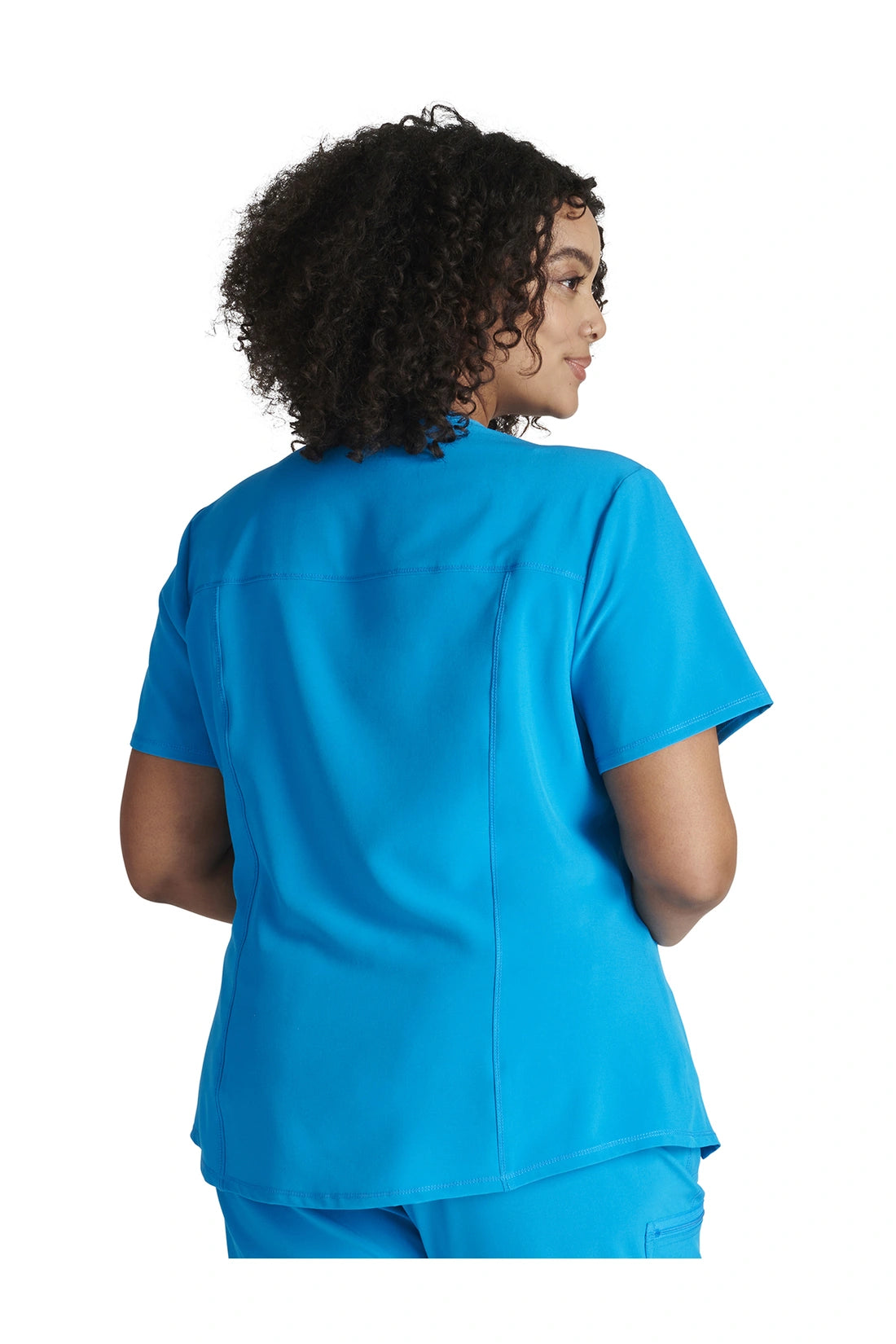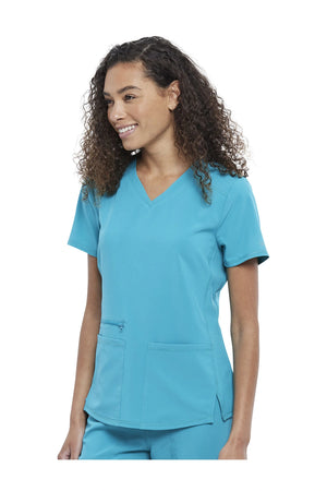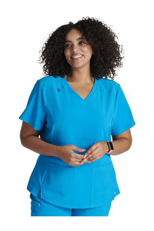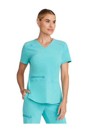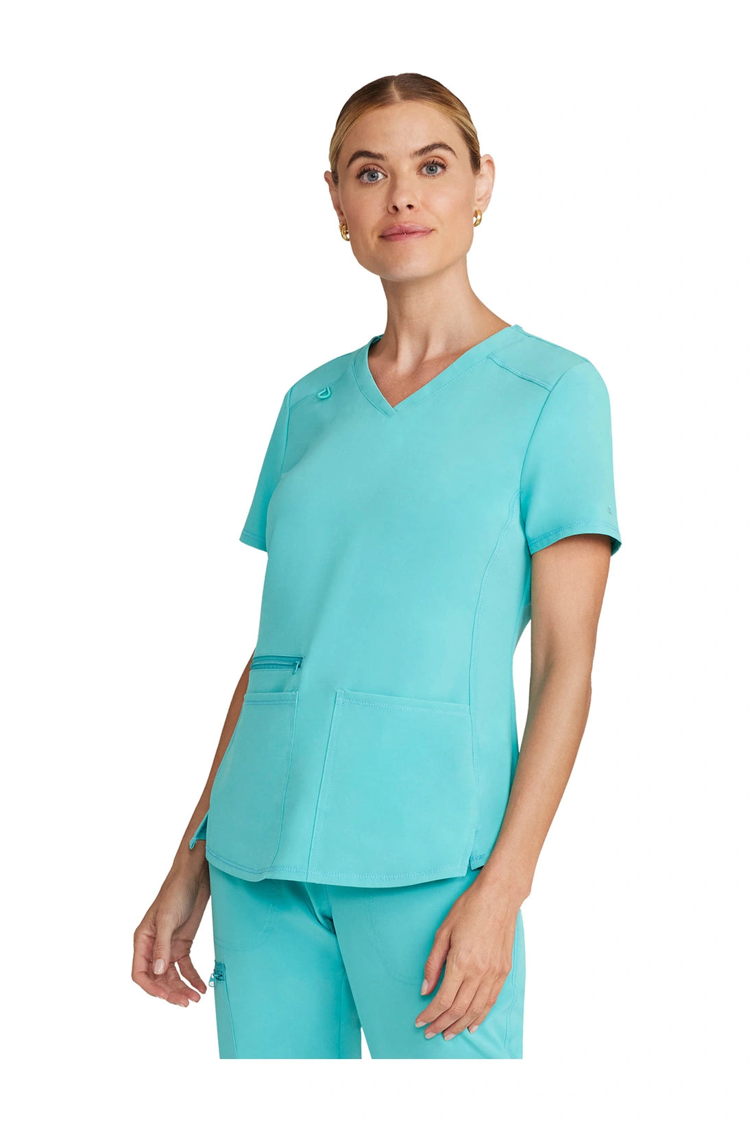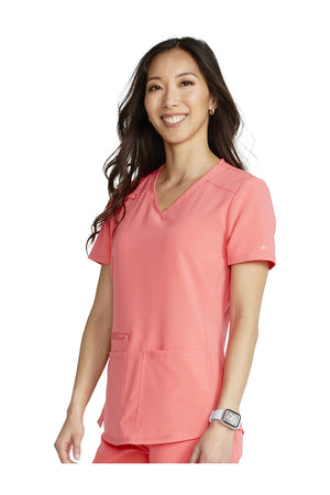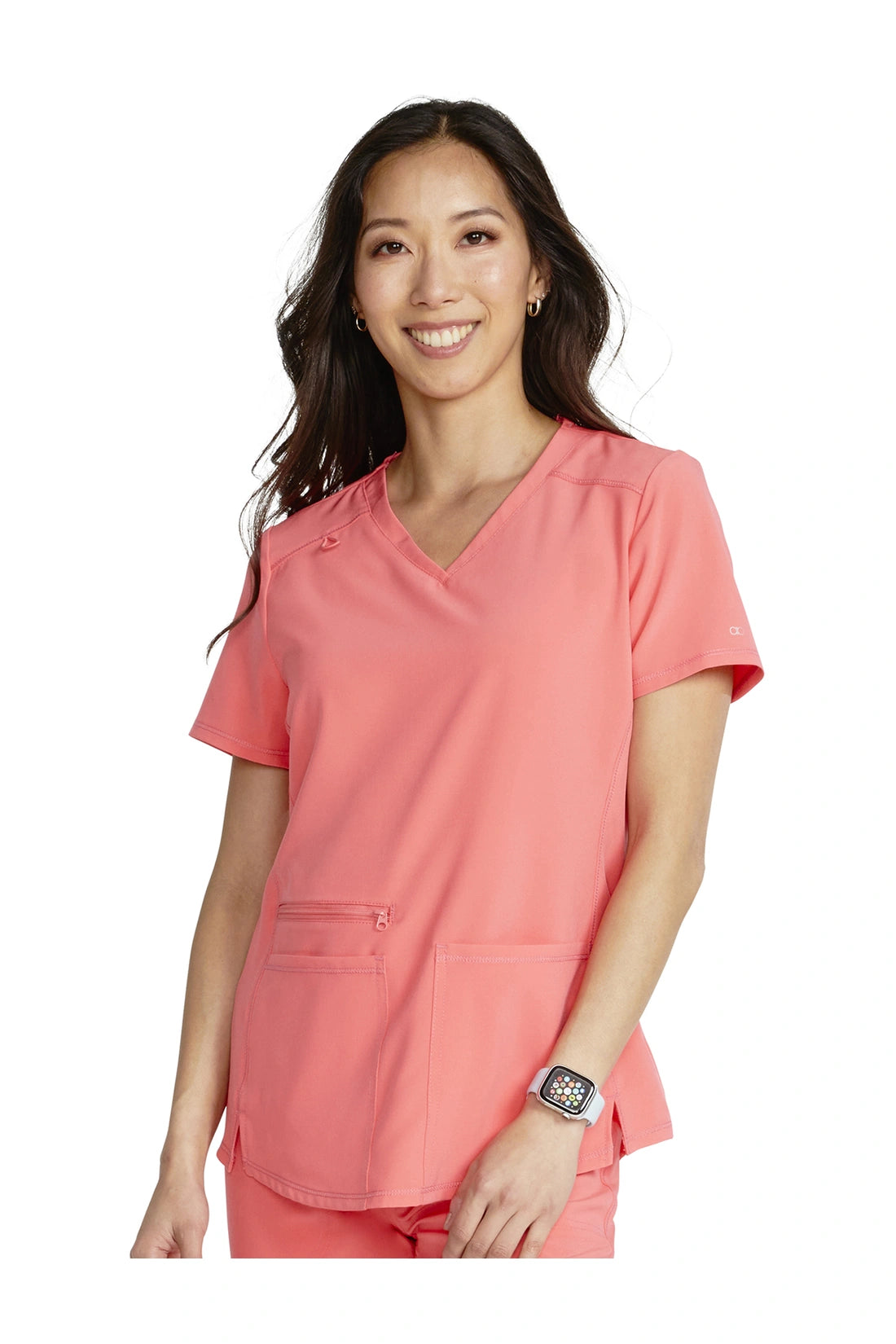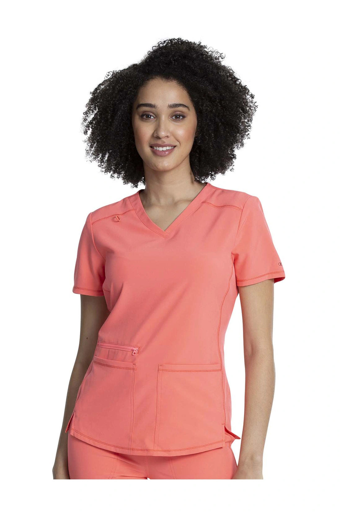 Esta camiseta con cuello en V de corte contemporáneo tiene costuras en los canesúes delanteros y traseros y un bucle de identificación en el canesú delantero derecho. Otras características son las costuras delanteras y traseras tipo princesa, los paneles laterales delanteros, las aberturas laterales y el dobladillo en cola de camisa. Hay tres bolsillos: dos bolsillos de parche delanteros y un bolsillo con cremallera para el móvil. Longitud de la espalda: 26
