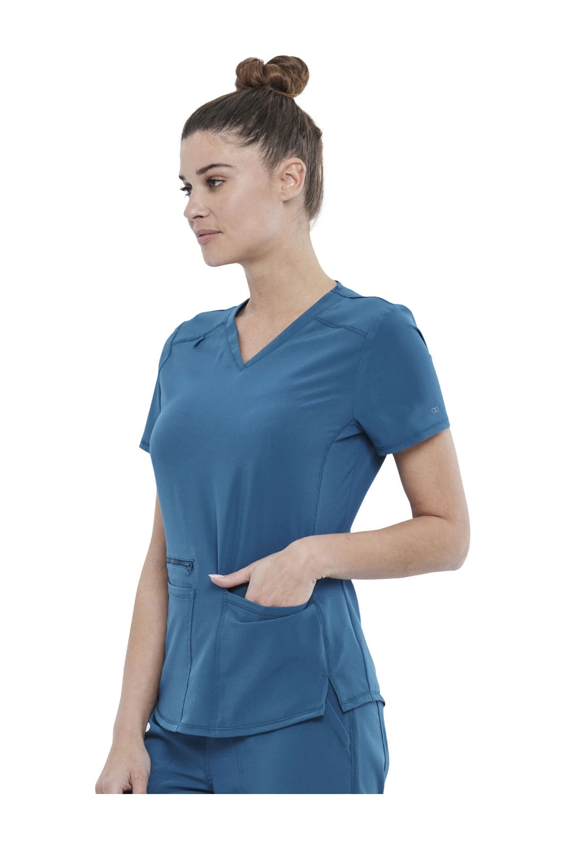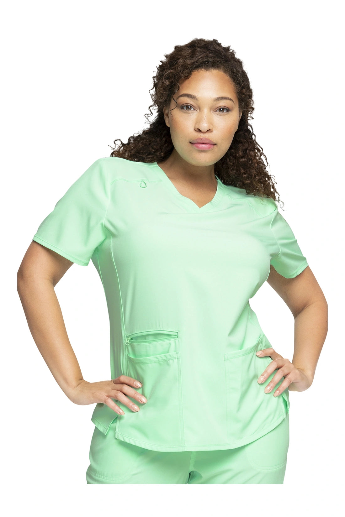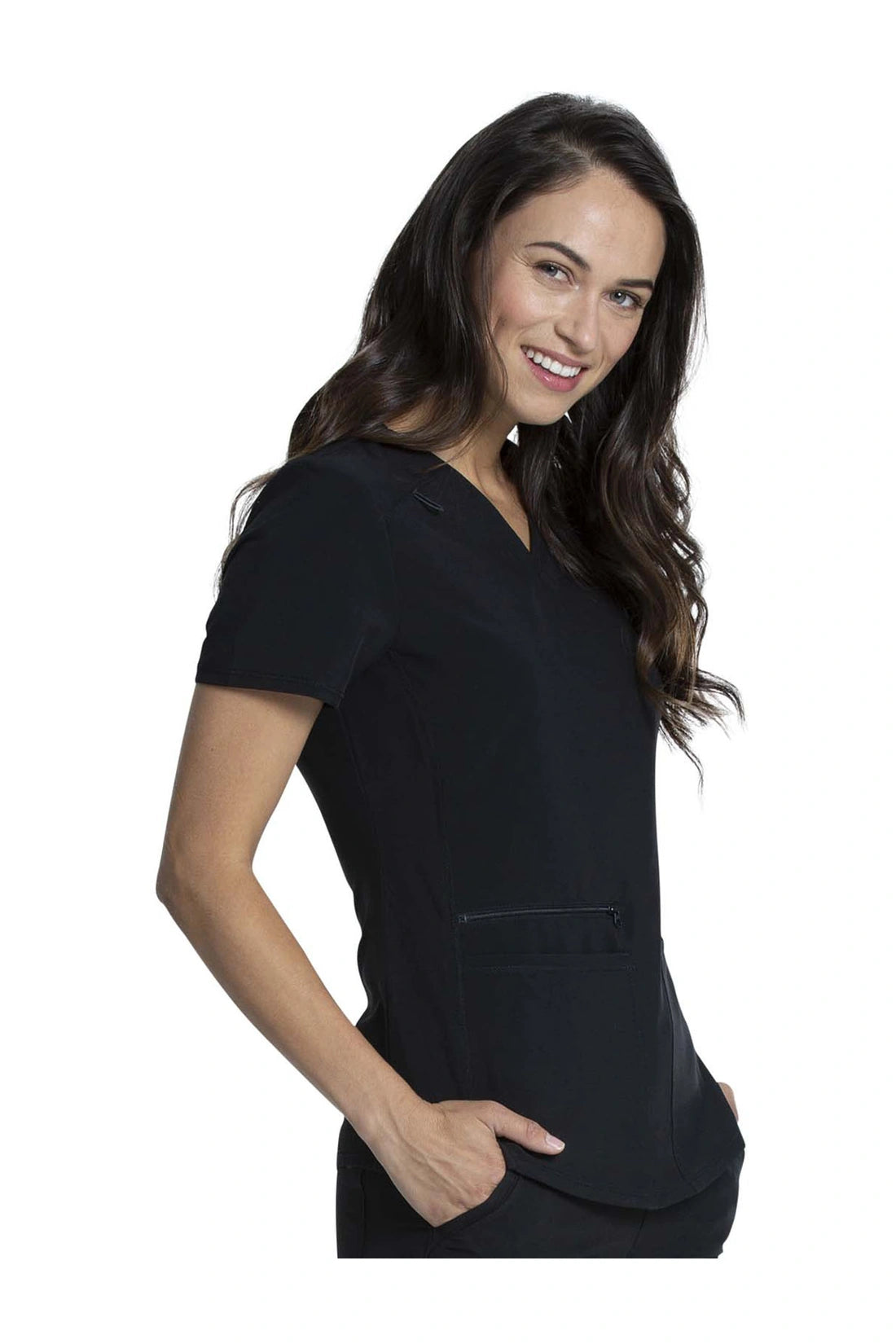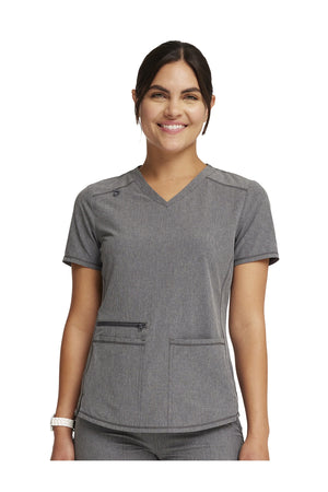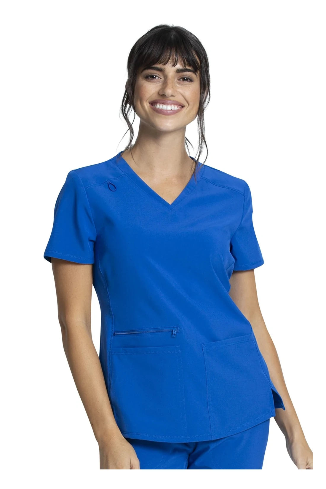 Esta camiseta con cuello en V de corte contemporáneo tiene costuras en los canesúes delanteros y traseros y un bucle de identificación en el canesú delantero derecho. Otras características son las costuras delanteras y traseras tipo princesa, los paneles laterales delanteros, las aberturas laterales y el dobladillo en cola de camisa. Hay tres bolsillos: dos bolsillos de parche delanteros y un bolsillo con cremallera para el móvil. Longitud de la espalda: 26