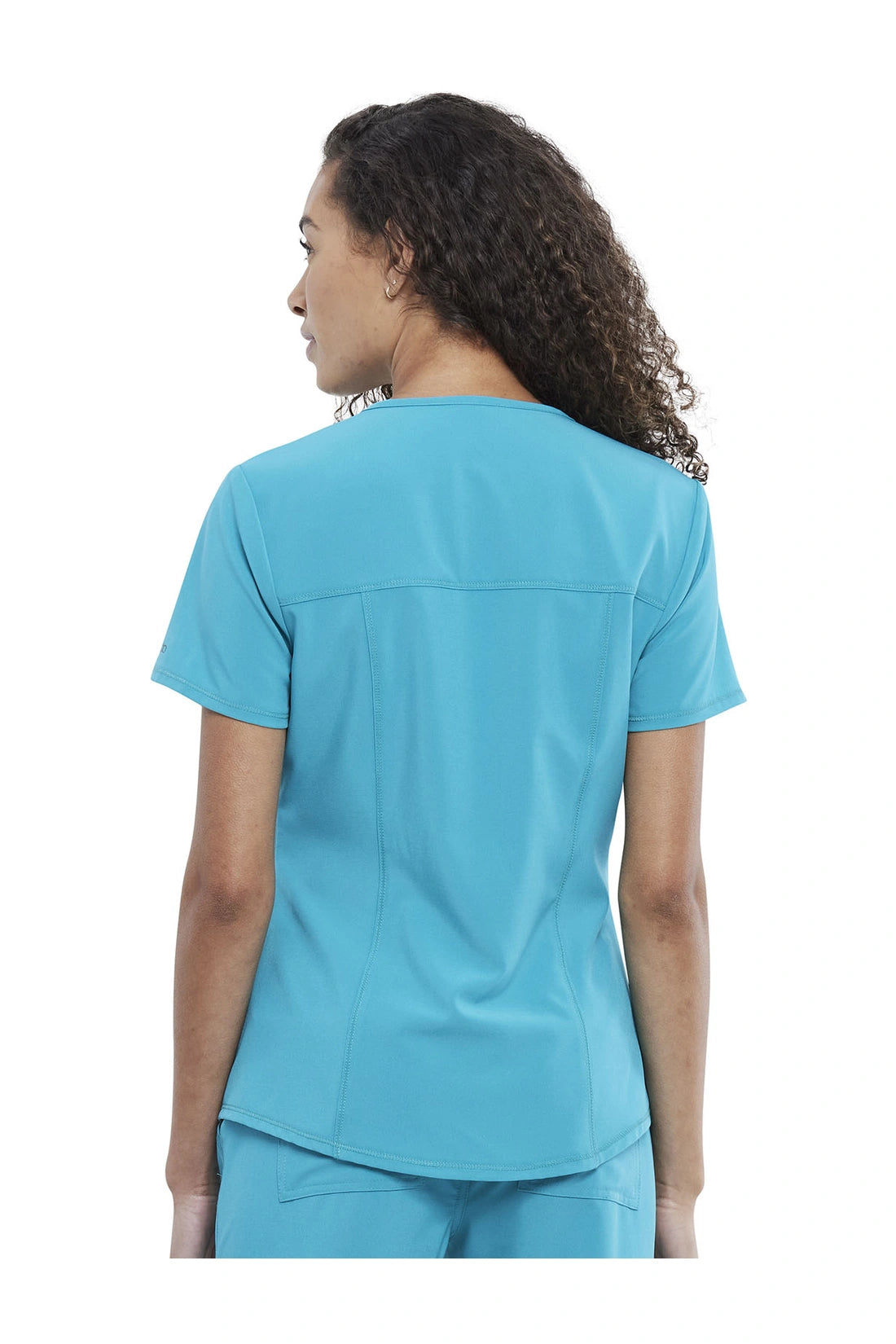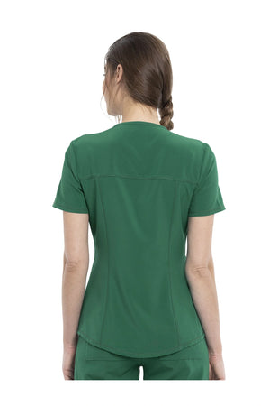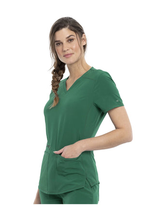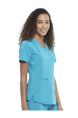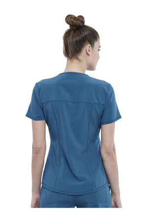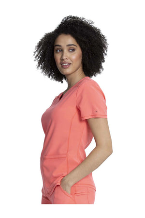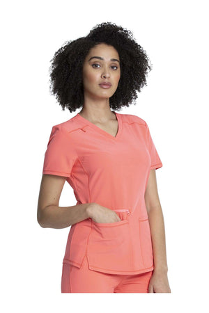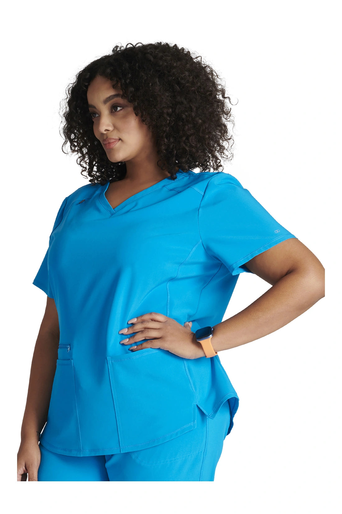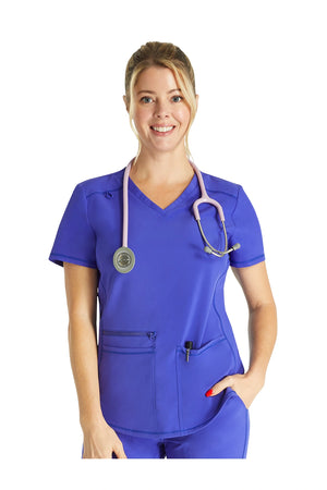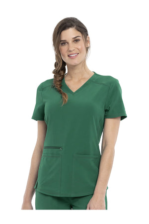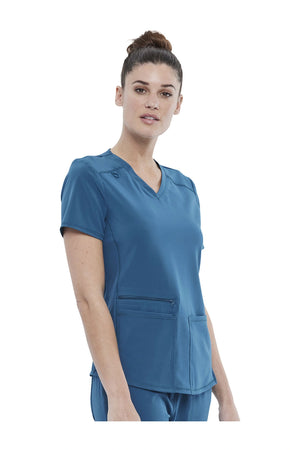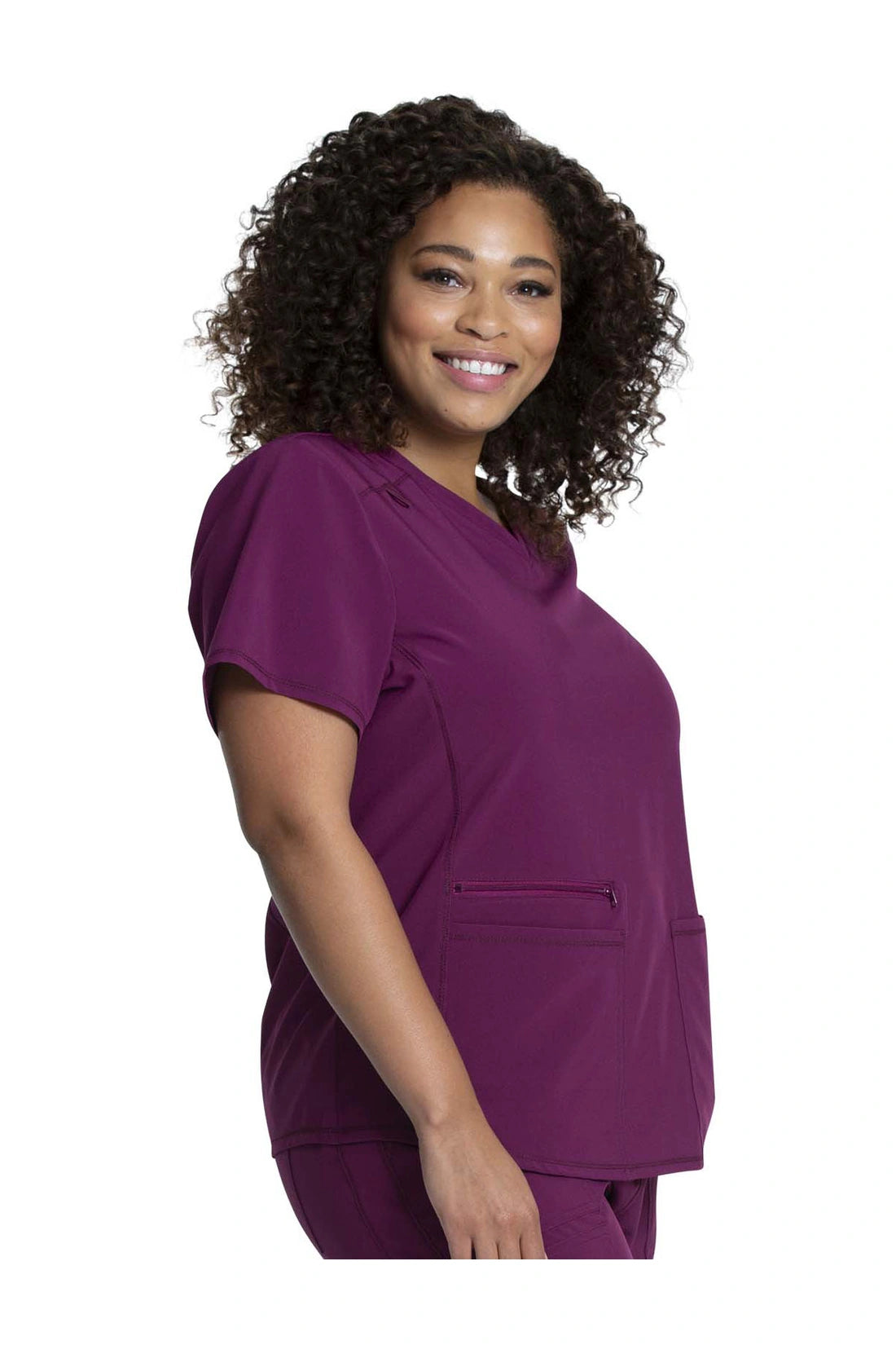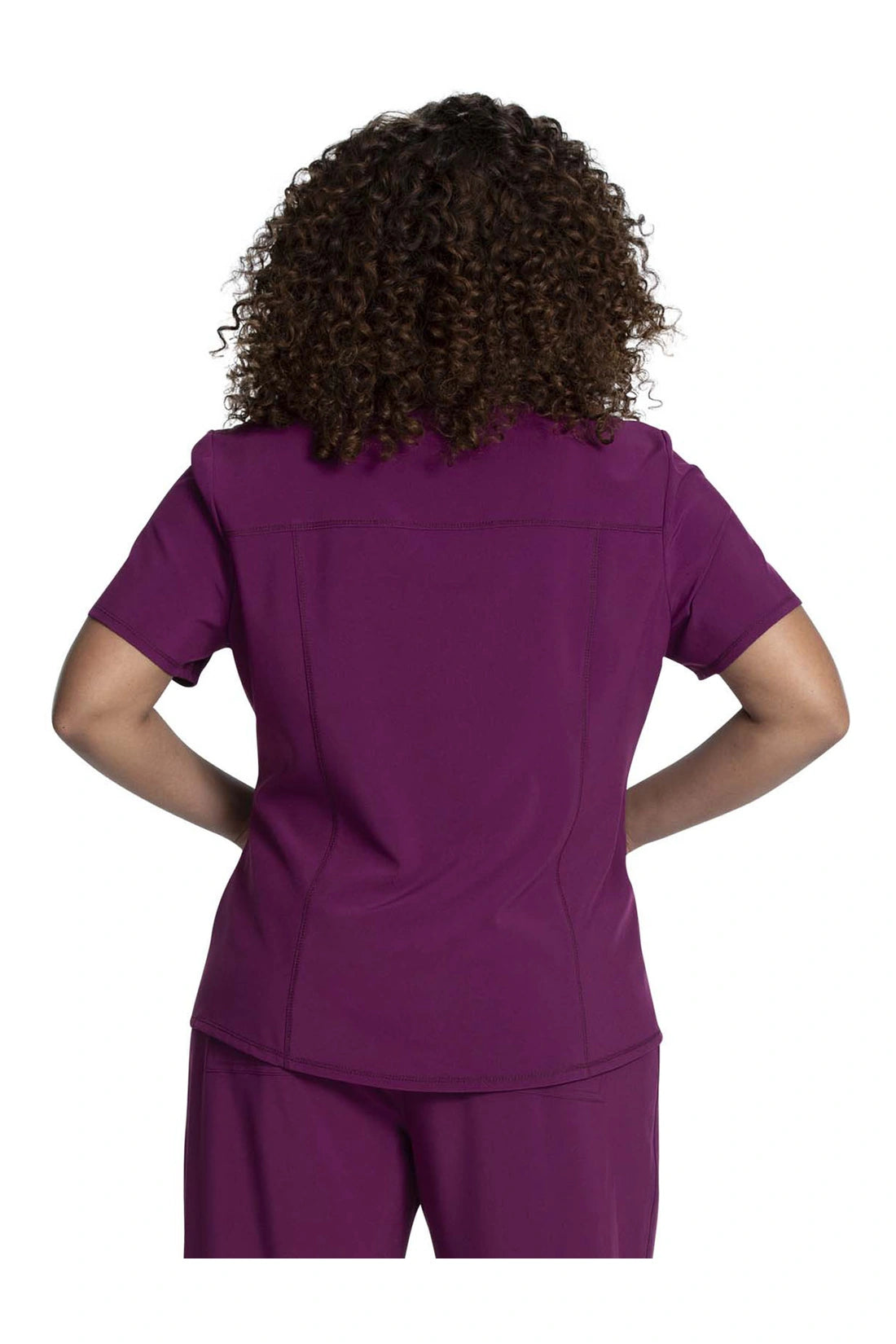 Esta camiseta con cuello en V de corte contemporáneo tiene costuras en los canesúes delanteros y traseros y un bucle de identificación en el canesú delantero derecho. Otras características son las costuras delanteras y traseras tipo princesa, los paneles laterales delanteros, las aberturas laterales y el dobladillo en cola de camisa. Hay tres bolsillos: dos bolsillos de parche delanteros y un bolsillo con cremallera para el móvil. Longitud de la espalda: 26