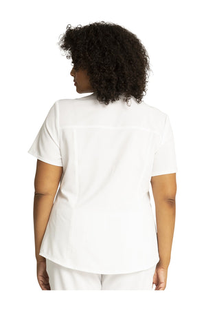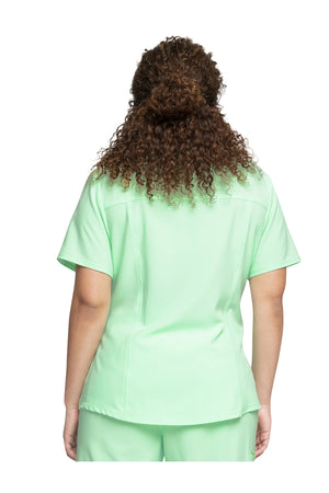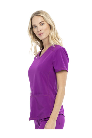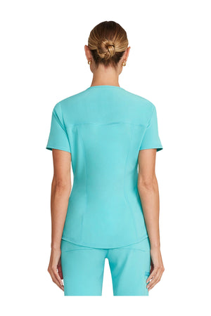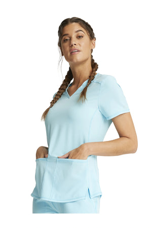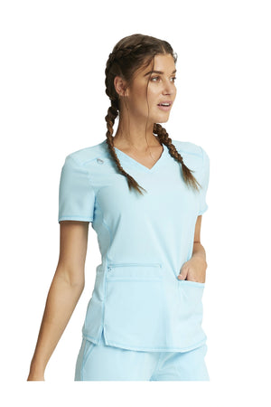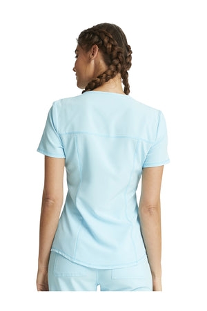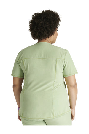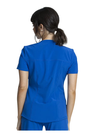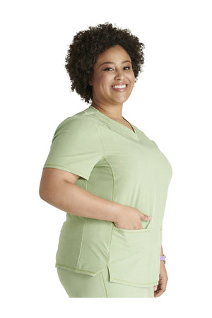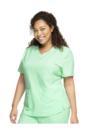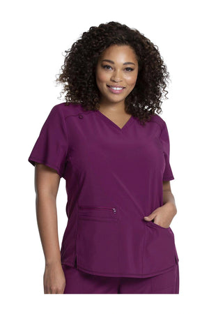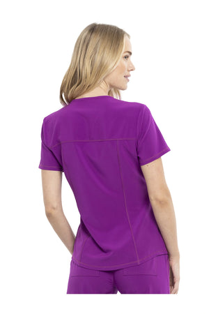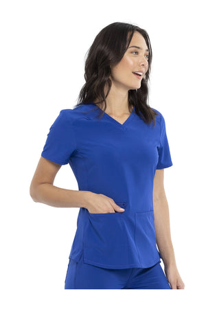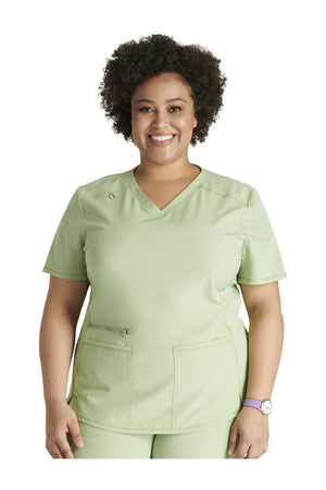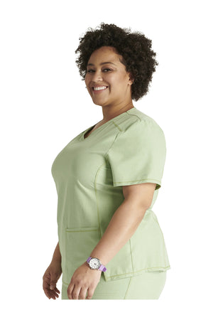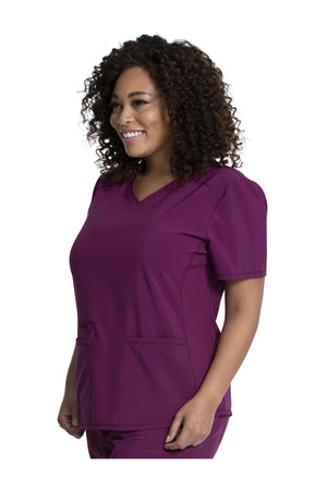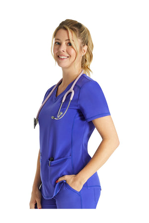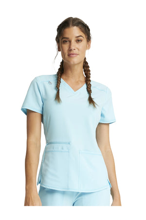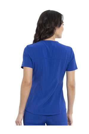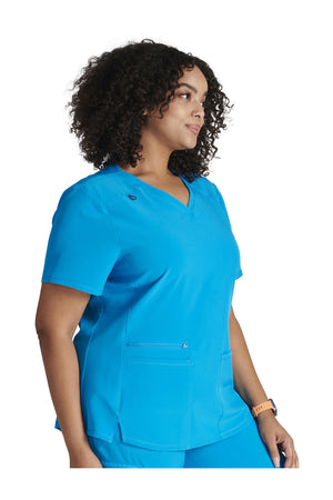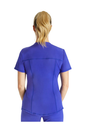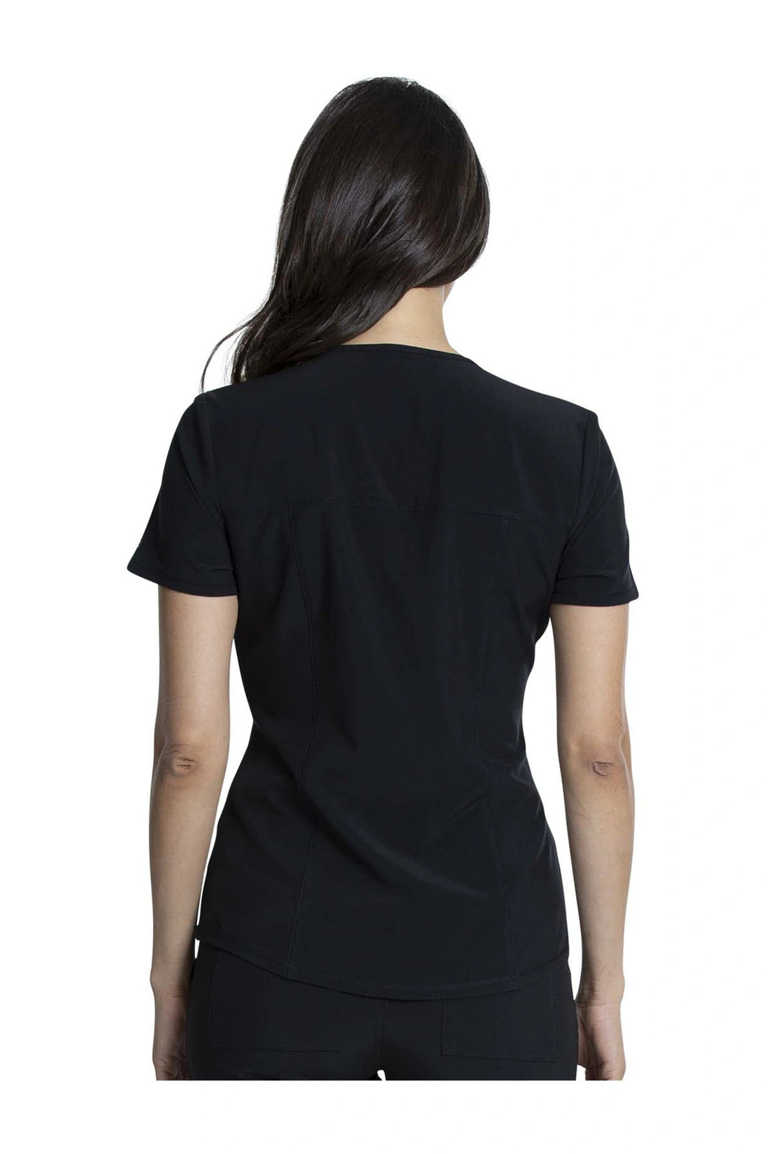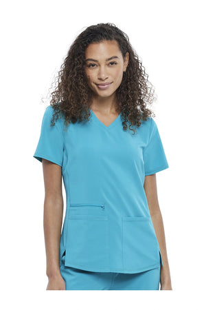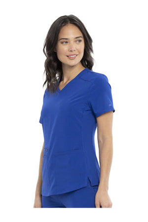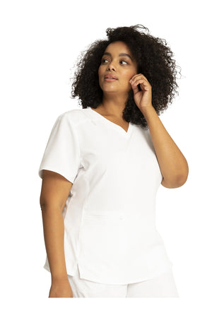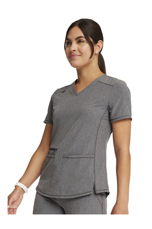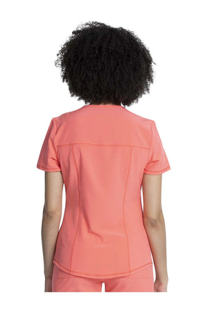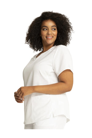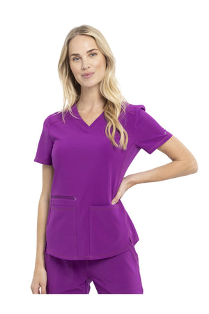 Esta camiseta con cuello en V de corte contemporáneo tiene costuras en los canesúes delanteros y traseros y un bucle de identificación en el canesú delantero derecho. Otras características son las costuras delanteras y traseras tipo princesa, los paneles laterales delanteros, las aberturas laterales y el dobladillo en cola de camisa. Hay tres bolsillos: dos bolsillos de parche delanteros y un bolsillo con cremallera para el móvil. Longitud de la espalda: 26