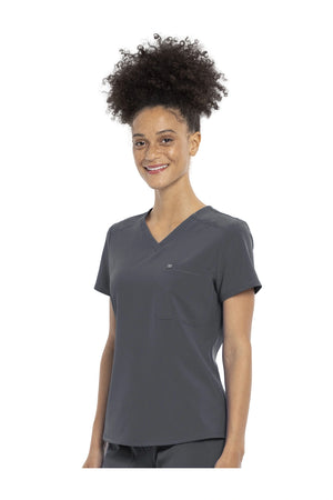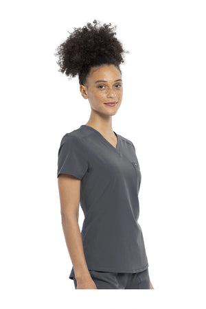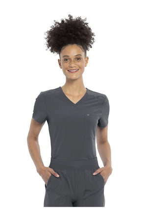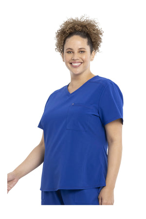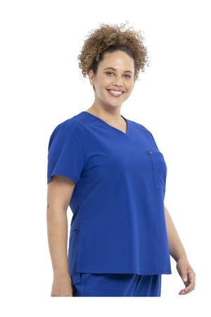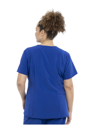 Esta camiseta con cuello en V de corte contemporáneo presenta costuras delanteras en el canesú, costuras traseras en forma de princesa y un dobladillo redondeado de talle alto. Tiene dos bolsillos: uno en el pecho y otro de seguridad con cremallera en la espalda. Las aberturas laterales altas permiten que esta camiseta se pueda meter por dentro. El cuello en V también se ve muy bien metido o sin meter. Longitud en el centro de la espalda: 26 1/2".