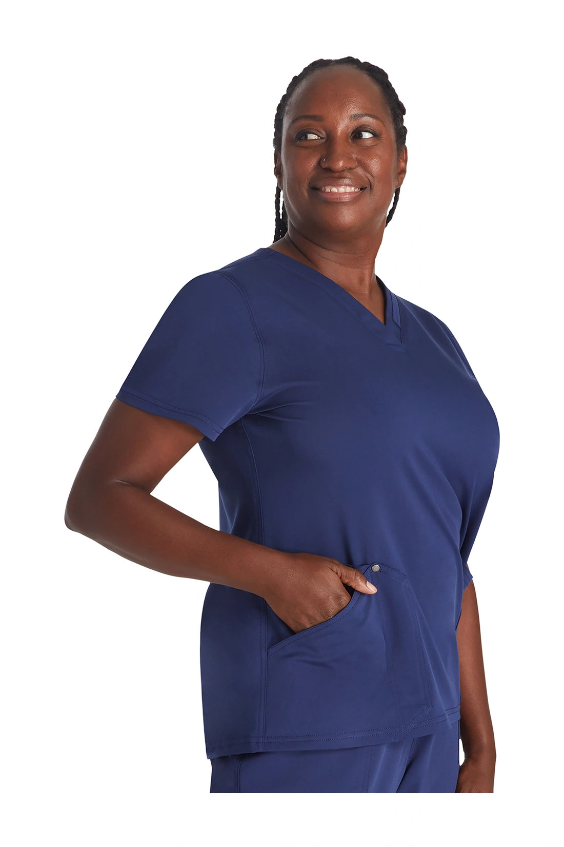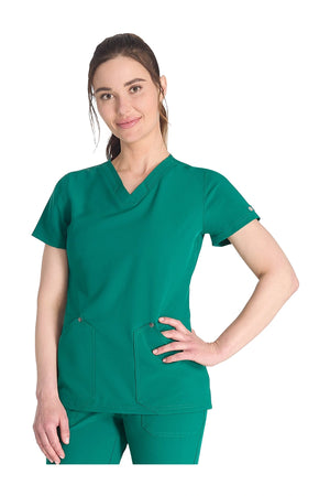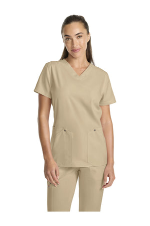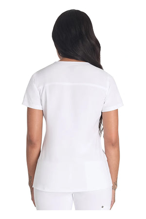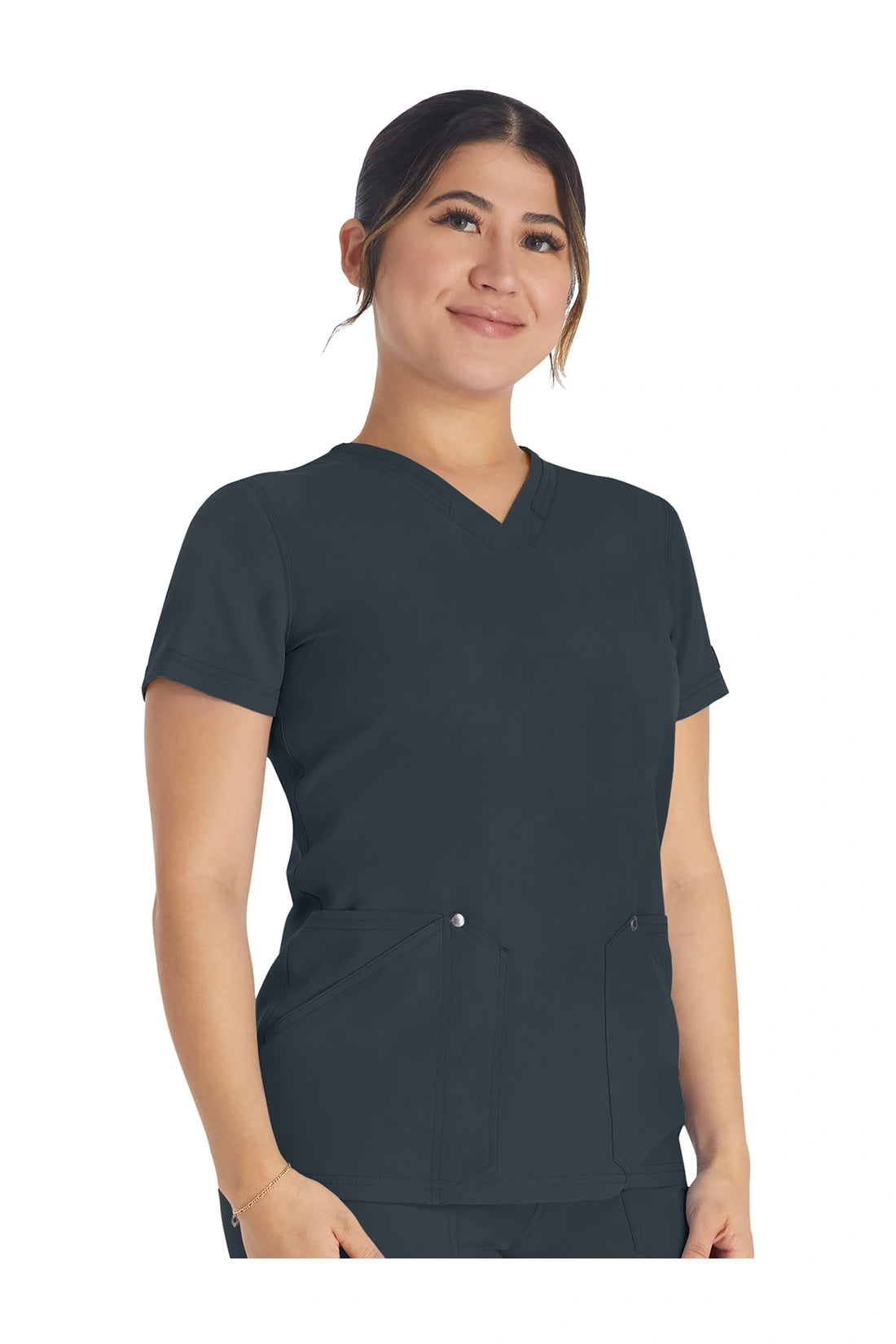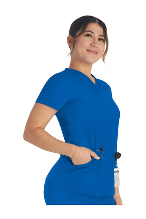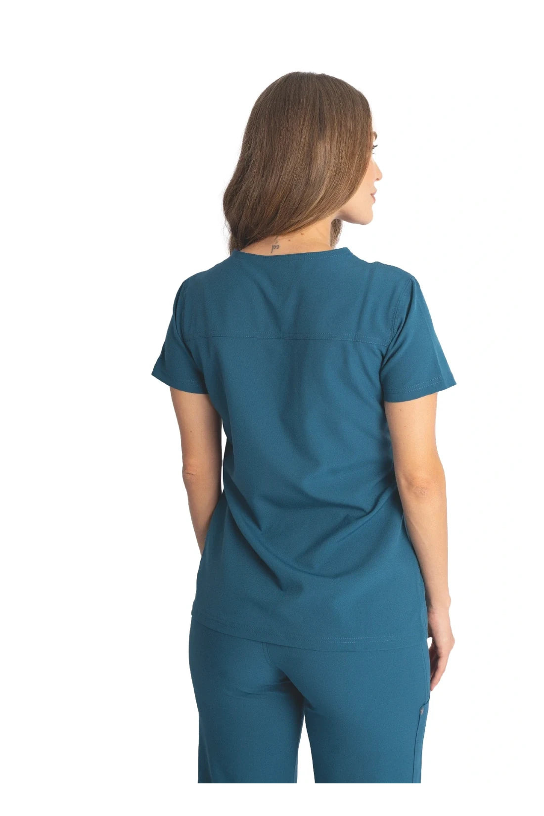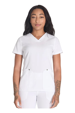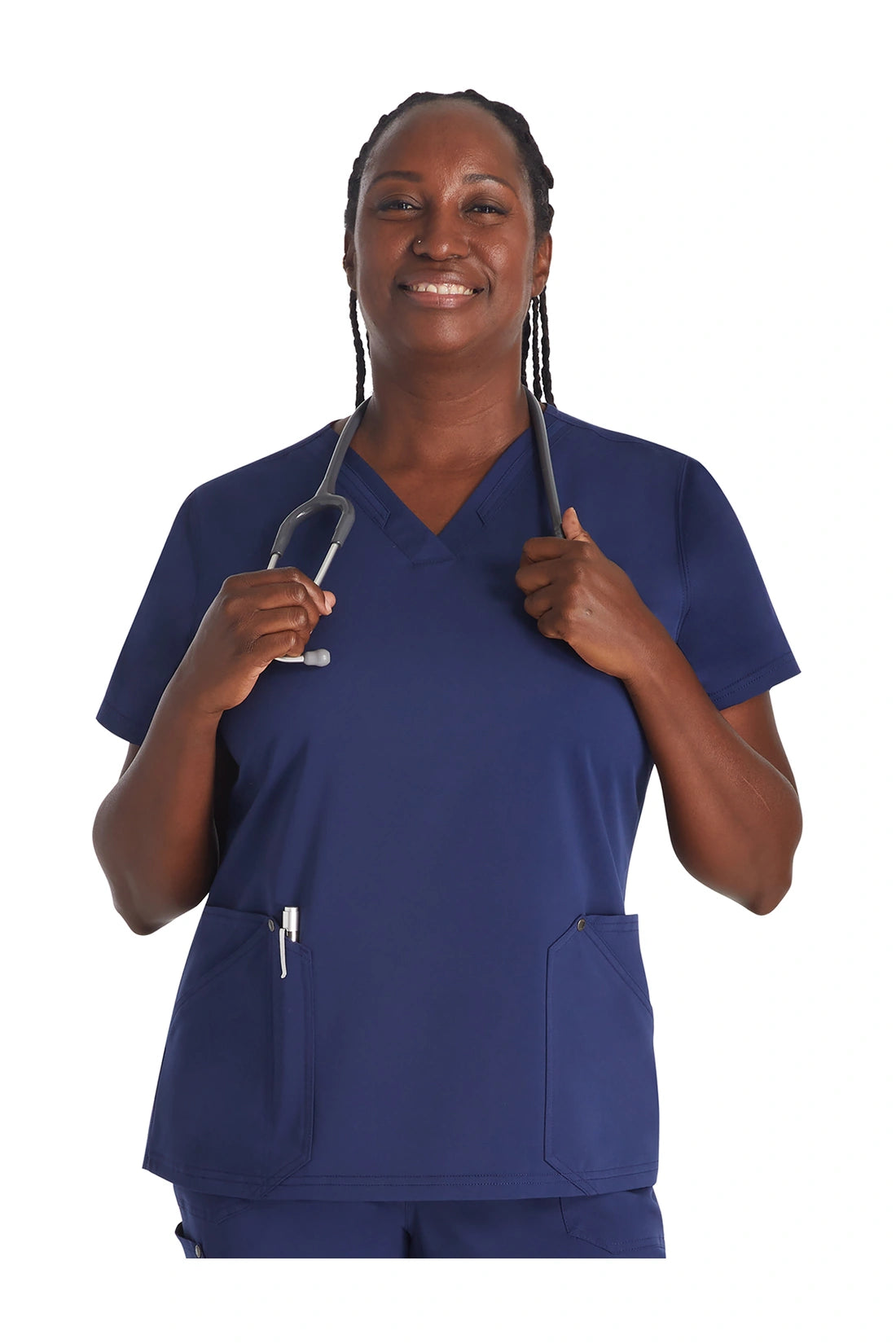 Los detalles no decepcionan en este top de corte contemporáneo con cuello en V. Presenta costuras decorativas en la cinta del cuello y pespuntes decorativos en todas las costuras para añadir estilo. Cuatro bolsillos para un almacenamiento organizado con bolsillos dobles de parche a cada lado (el derecho tiene una ranura para bolígrafo/instrumento). Logotipo decorativo en las esquinas de los bolsillos. El canesú trasero completa el look. CBL: 25