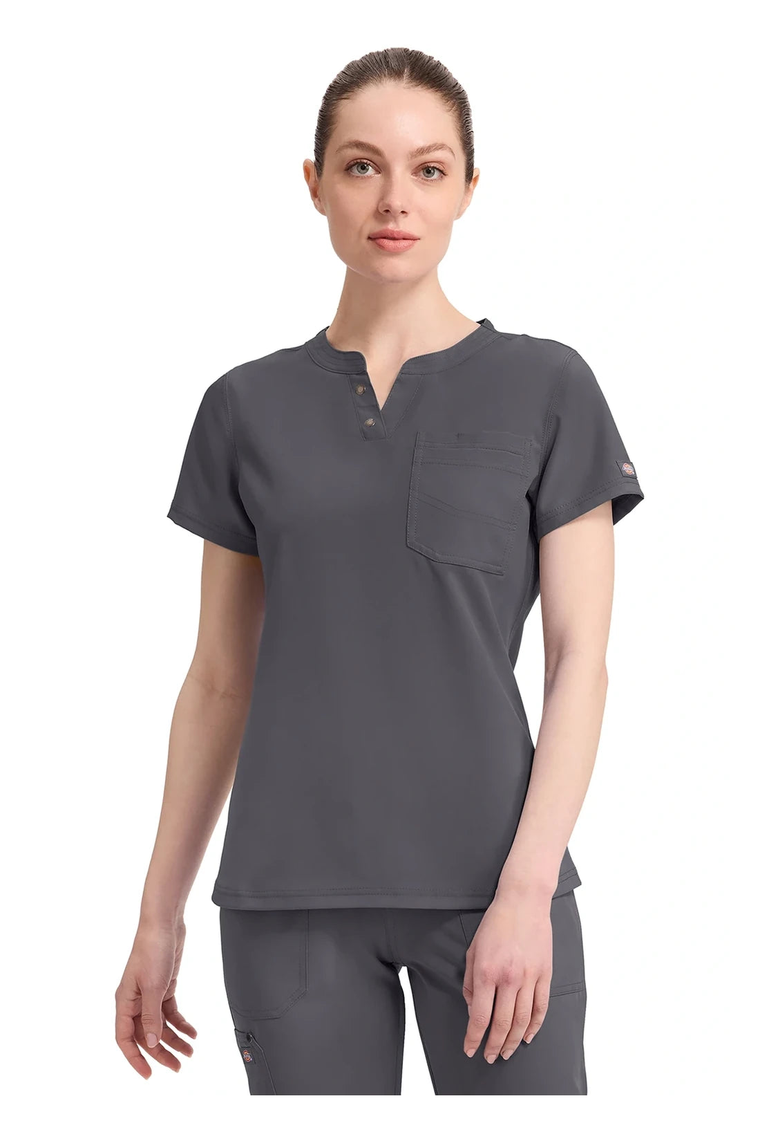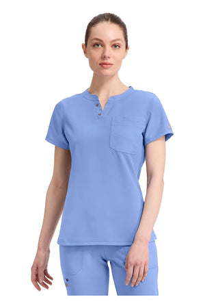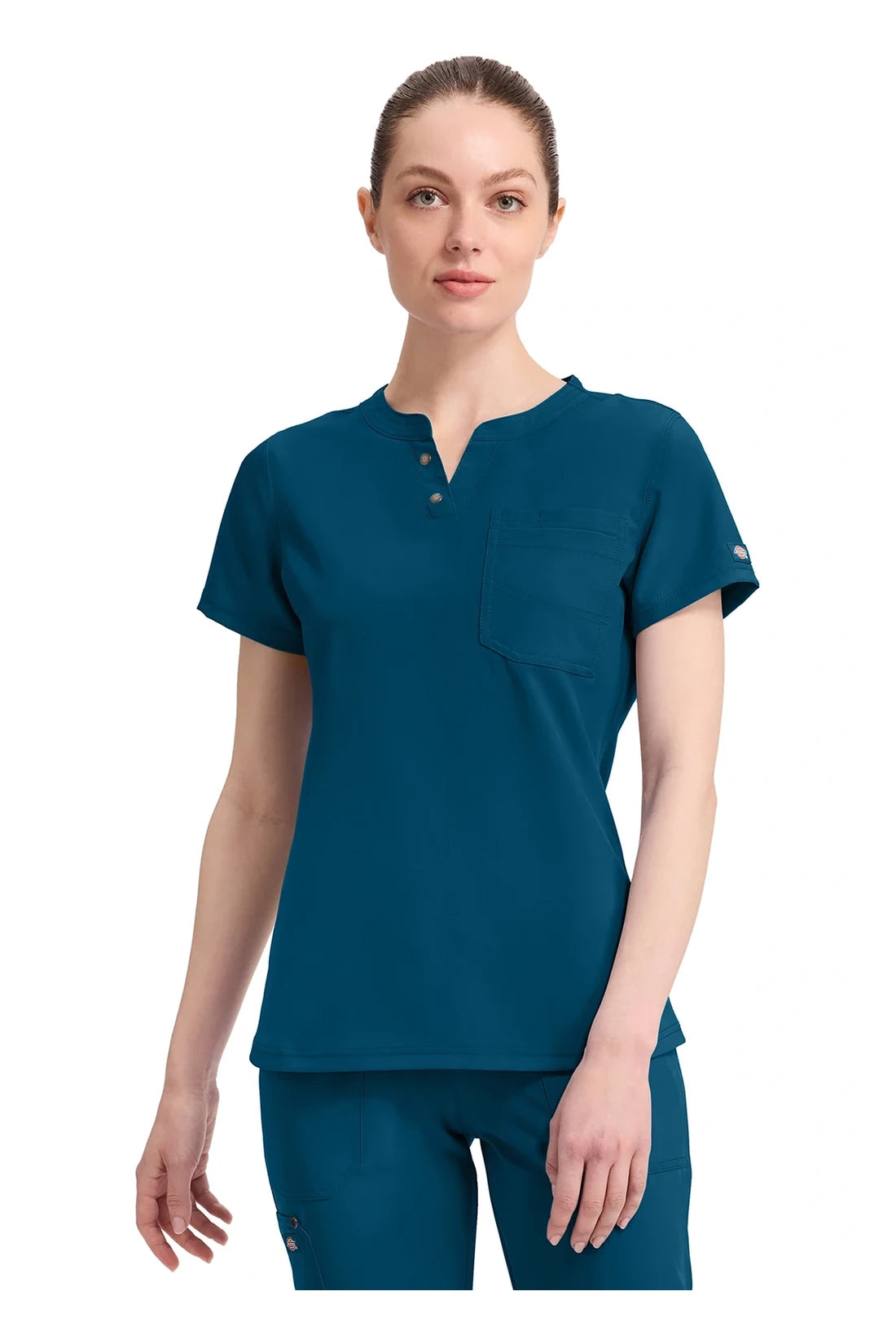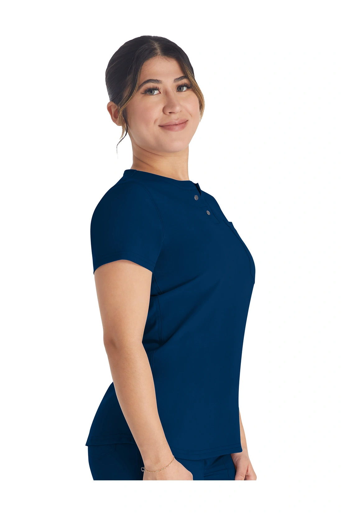 Esta camiseta Contemporary fit de cuello redondo presenta un escote henley con botones decorativos con el logotipo en la tapeta y costuras multiagujas en la cinta del cuello. Tiene un bolsillo de parche en el pecho con pespuntes decorativos y una ranura para bolígrafo/instrumento. Pespuntes decorativos en todas las costuras. El dobladillo redondeado puede llevarse recogido o sin recoger. CBL: 25 ½»