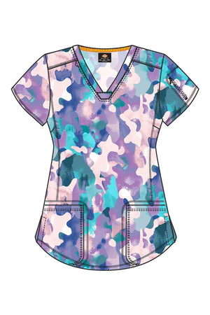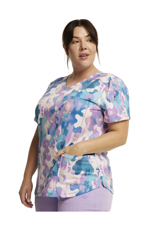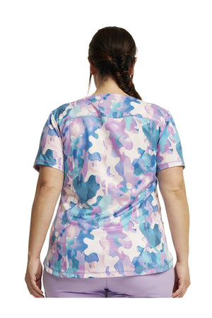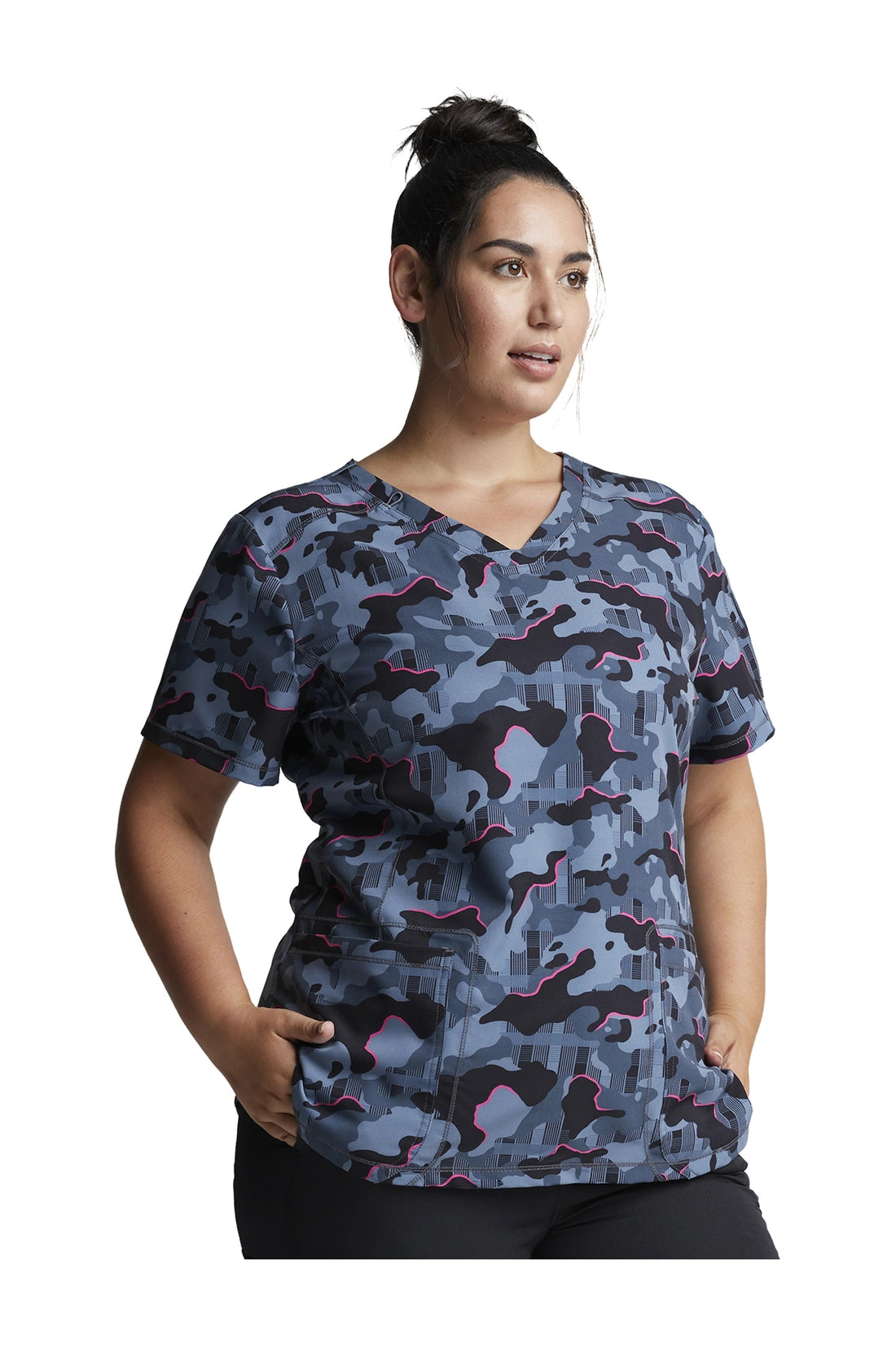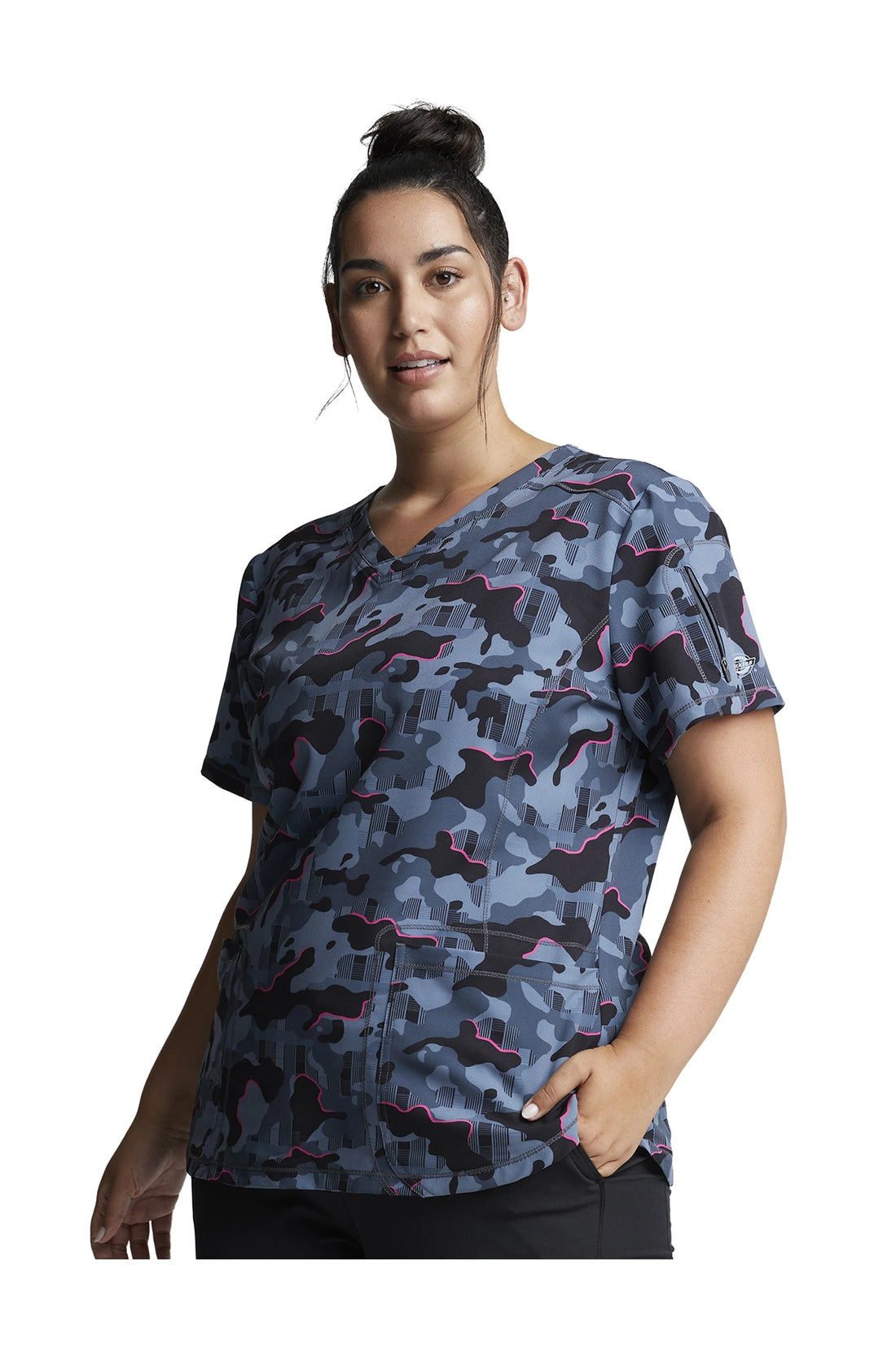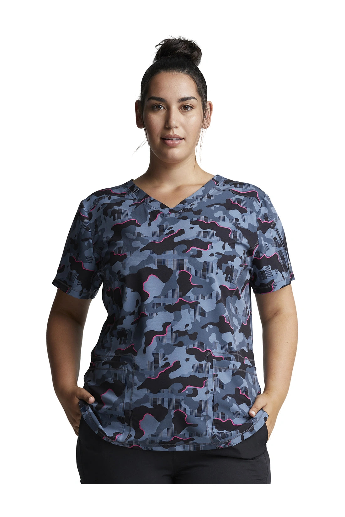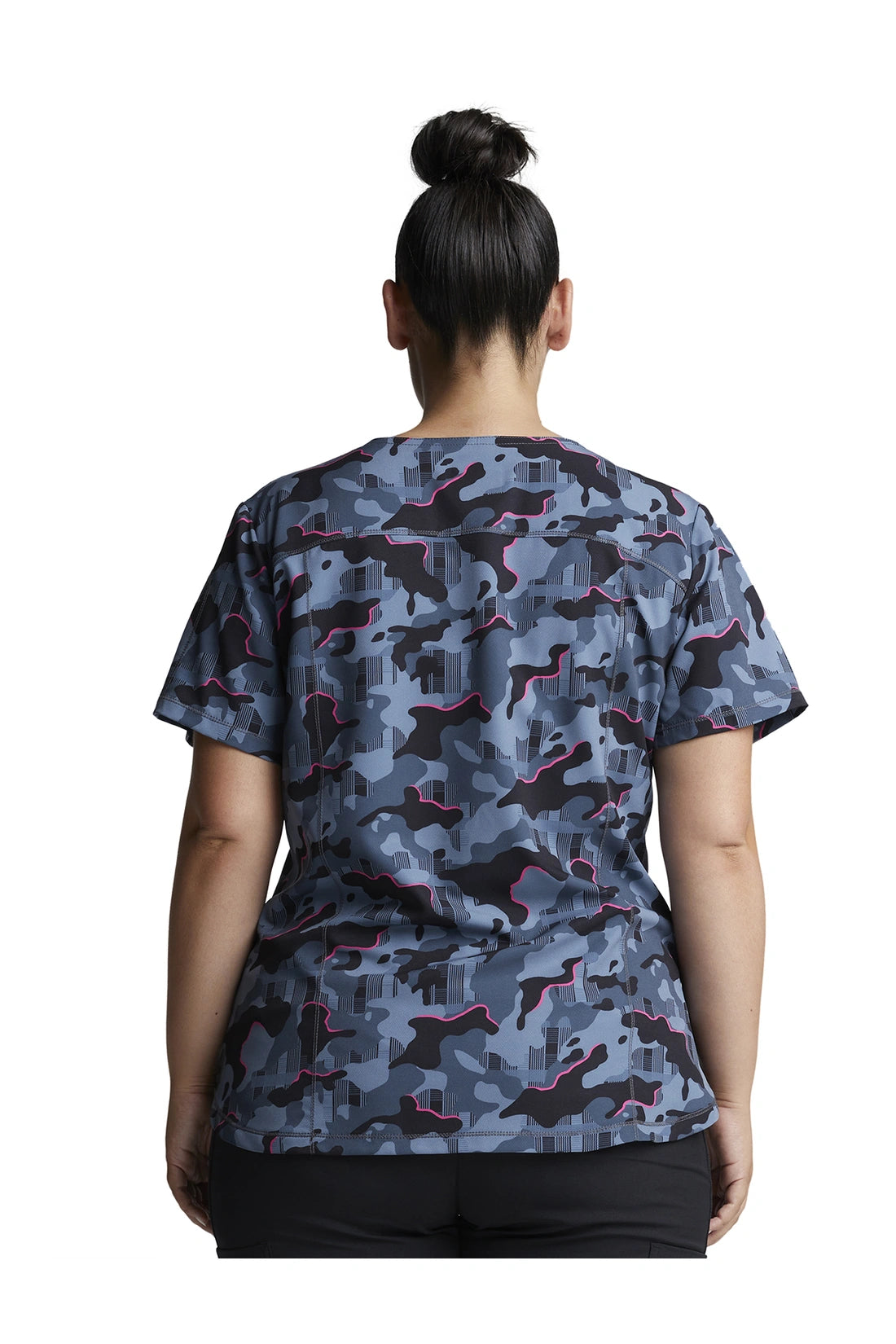Un top estampado de corte contemporáneo con cuello de pico, canesú delantero y trasero, detalle de línea princesa, bolsillos de parche delanteros redondeados con una salida de cable tonal en el interior del lado derecho. Dobladillo en cola de camisa, bolsillo en la manga con cierre de cremallera y logotipo en transferencias térmicas, aberturas laterales y detalles de pespuntes en toda la prenda. Longitud del centro de la espalda: 26