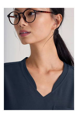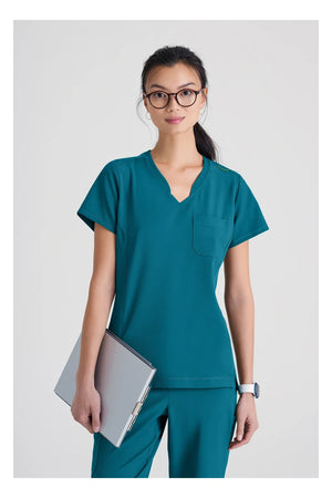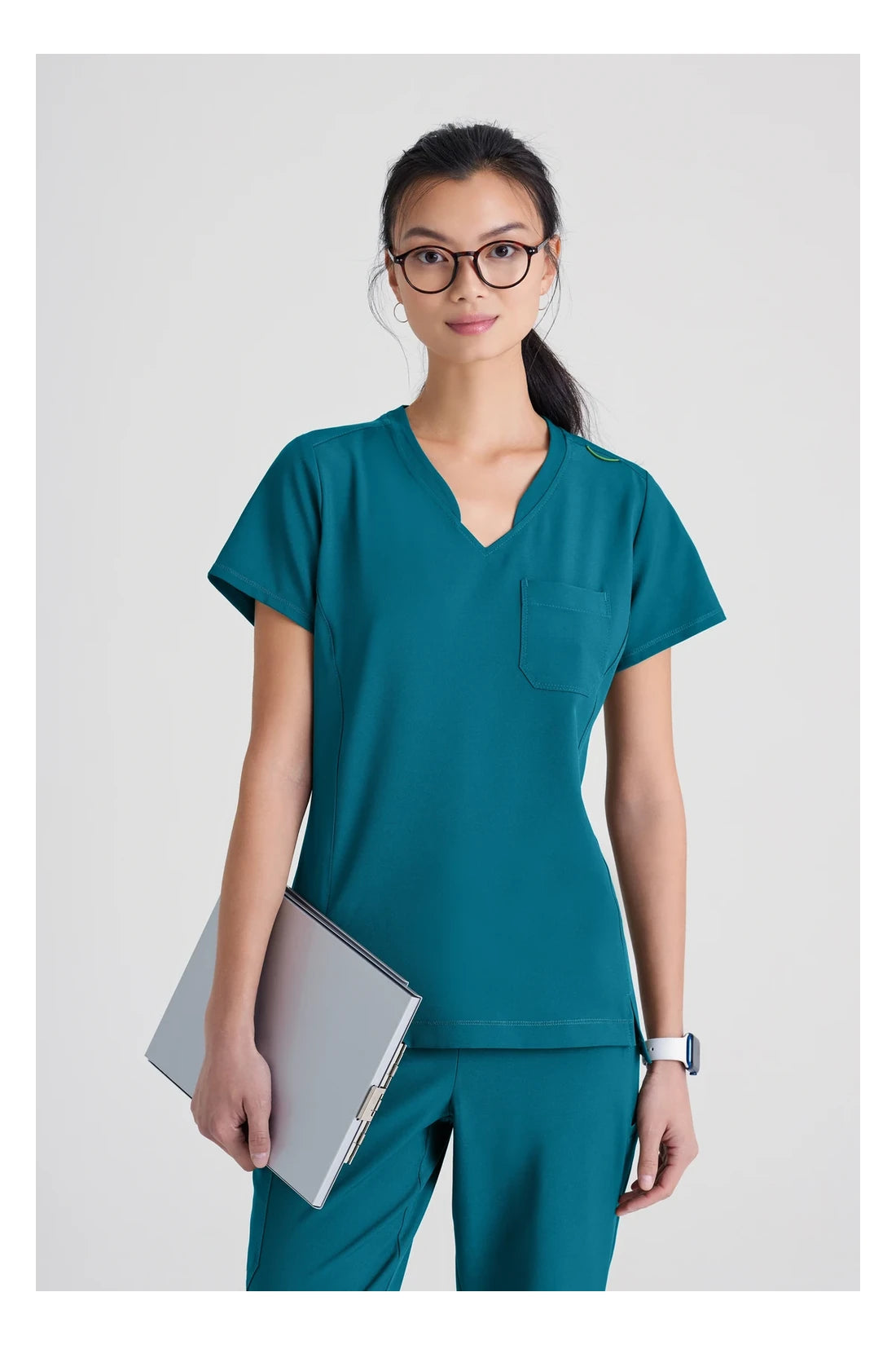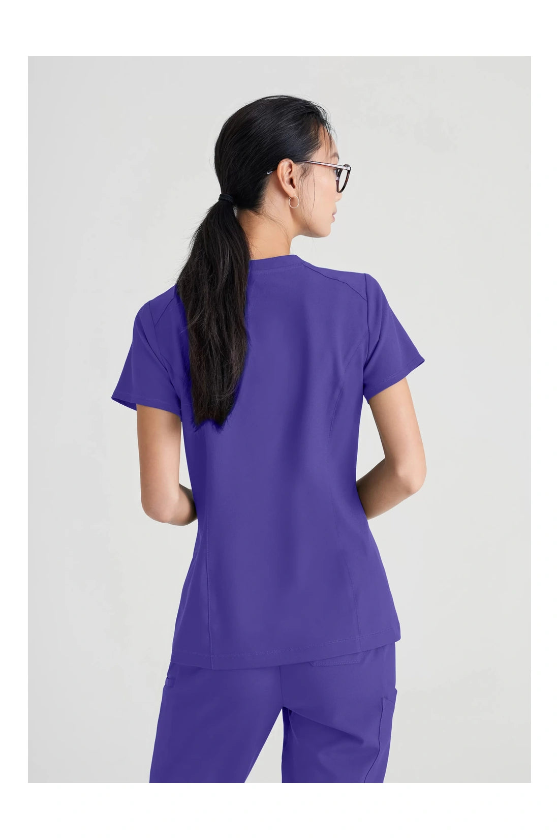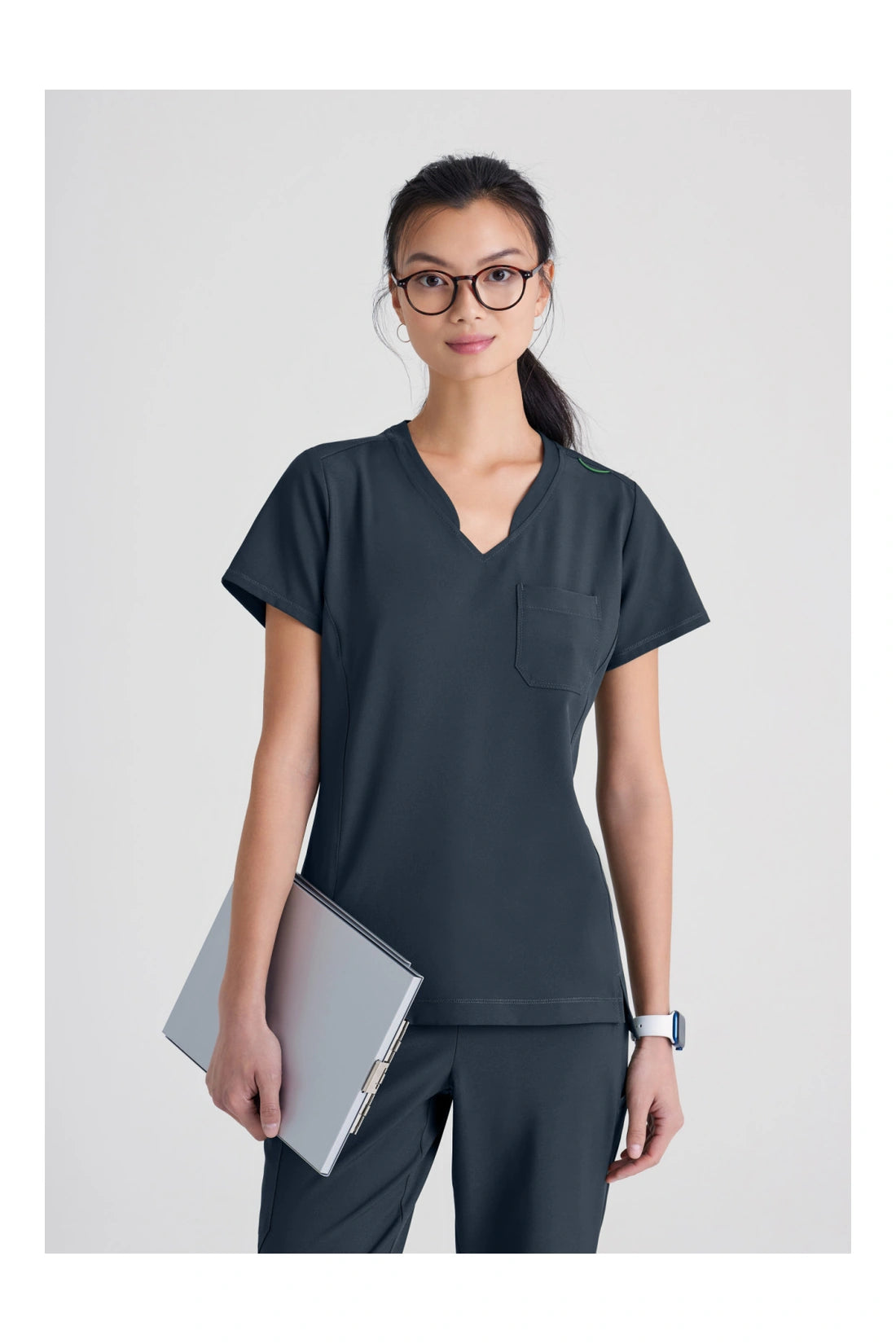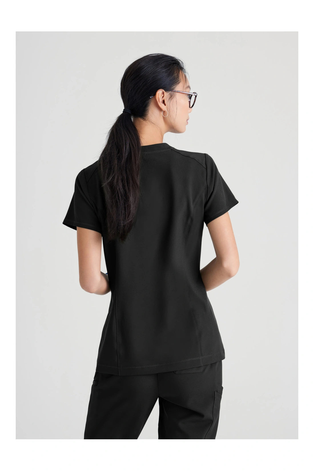 Prepárate para el éxito con el top Sway de la colección Grey's Anatomy by Barco Evolve. El diseño limpio cuenta con un moderno cuello de pico con banda que complementa el dobladillo alto-bajo, mientras que las costuras princesa proporcionan un ajuste favorecedor. Además, el característico lazo verde ofrece un práctico lugar para tu insignia. Fabricado con poliéster reciclado y tecnología CiCLO®, el tejido es suave, elástico y transpirable para ofrecer comodidad durante todo el día.