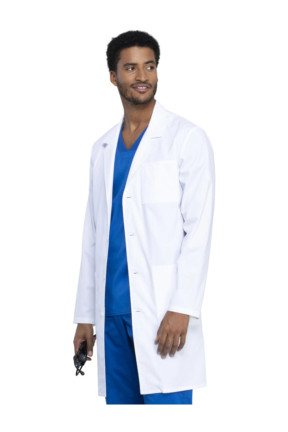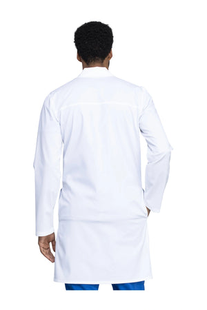 Esta bata médica para hombre de corte moderno de 40" tiene una solapa de muesca tradicional, cierre frontal con cuatro botones autocubiertos y aberturas de acceso laterales. Hay un total de cuatro bolsillos; un bolsillo de parche en el pecho, dos bolsillos exteriores de 8" para tabletas y un bolsillo interior derecho de 8" para tabletas. La costura del canesú trasero completa este look clásico.