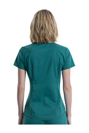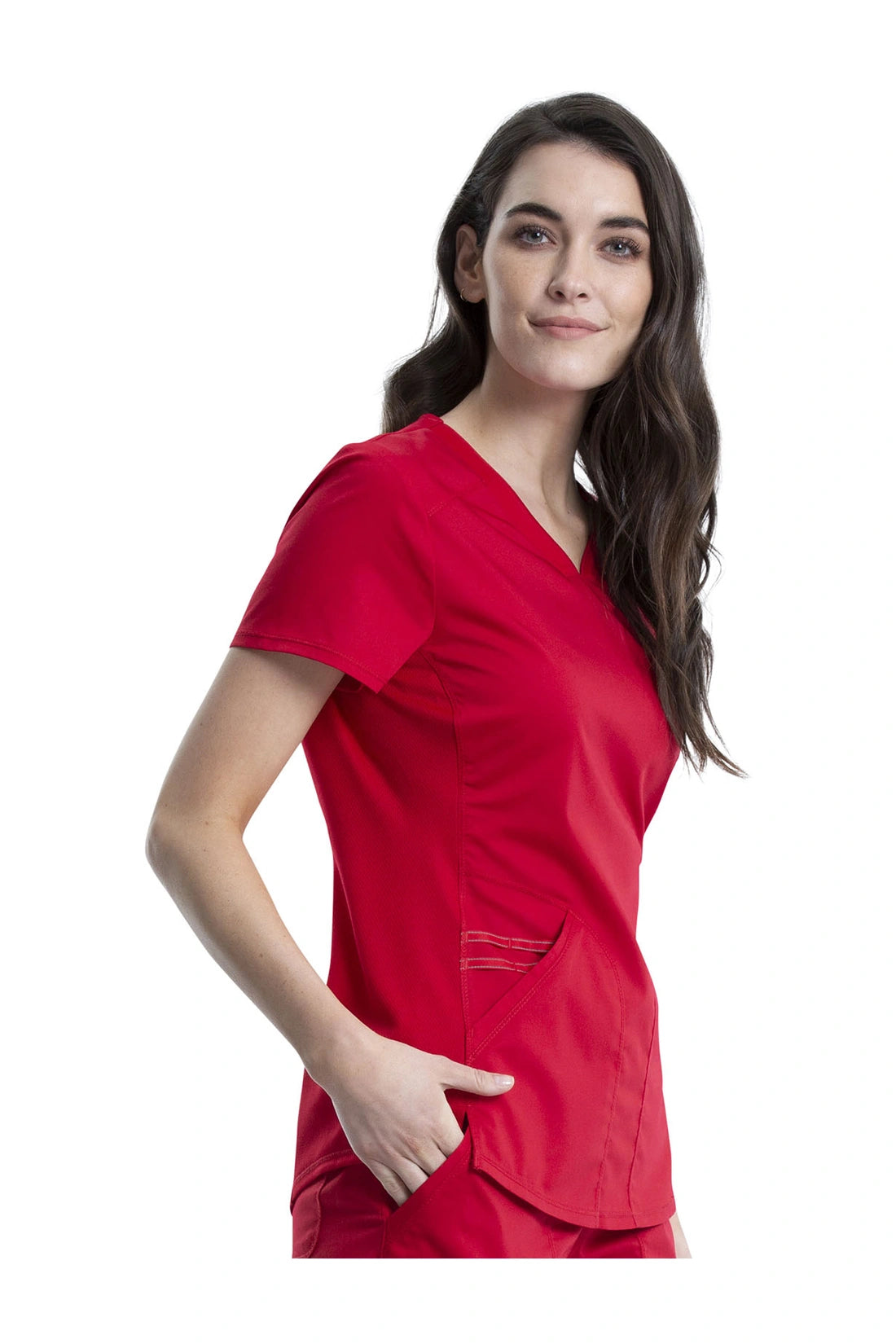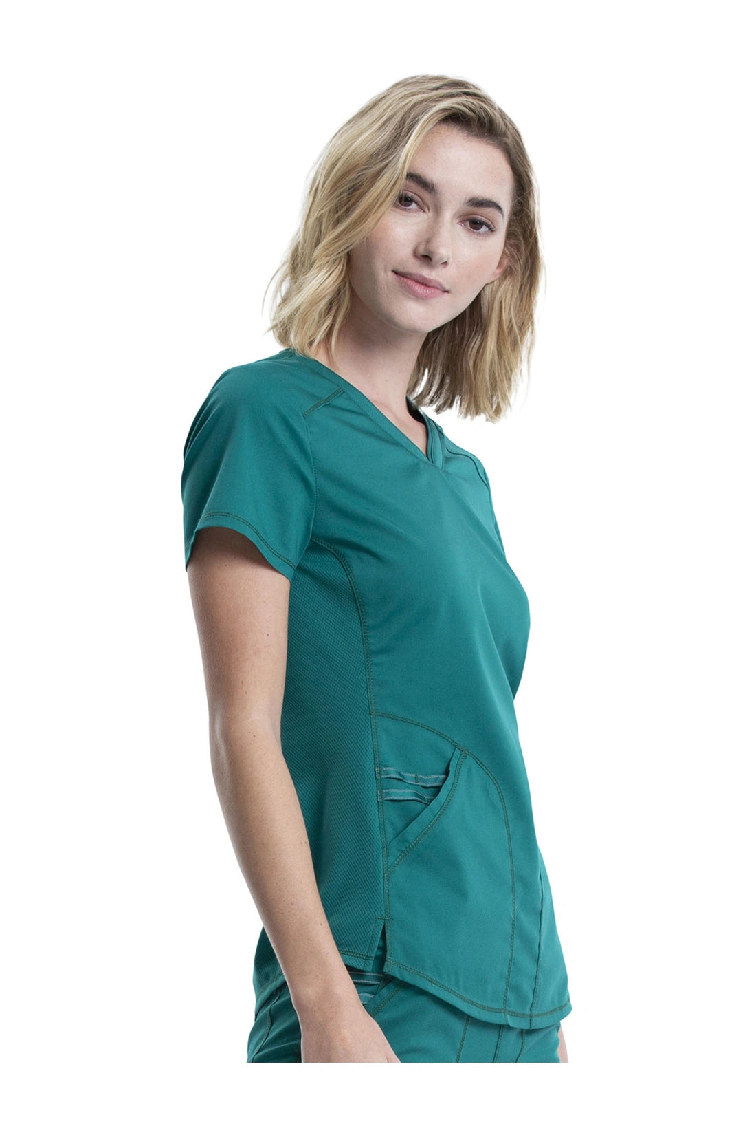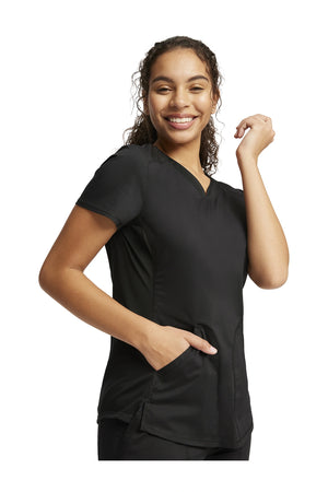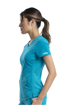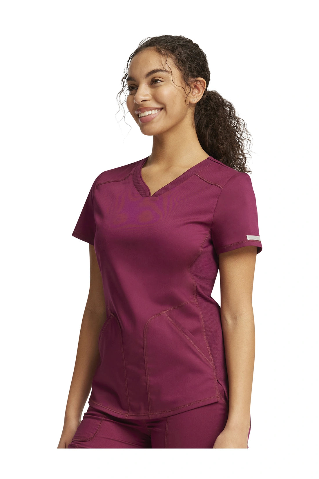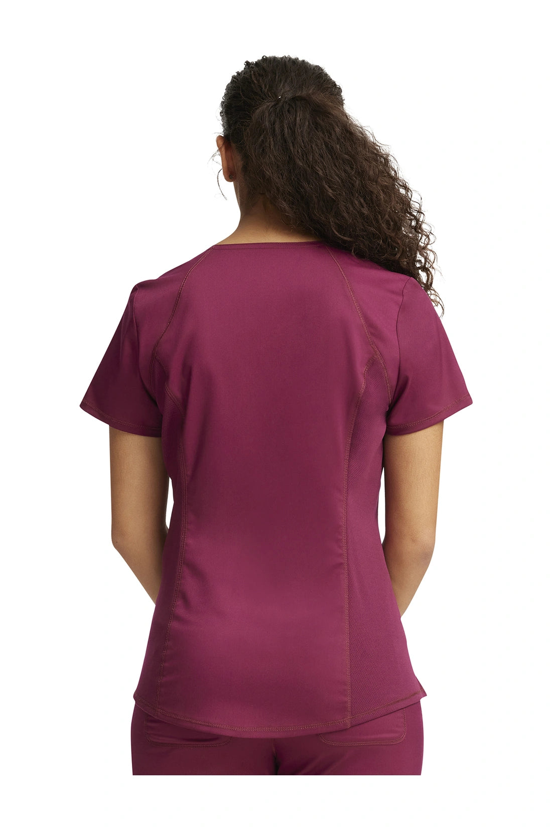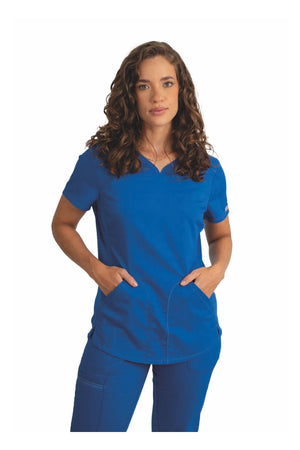 Añade un toque deportivo a tu vestuario médico con este top de cuello en V de forma suave con dos bolsillos de parche y bucles para instrumentos. Una malla transpirable en la banda del cuello y los paneles laterales para mayor comodidad y movilidad. Ajuste clásico moderno. Longitud en el centro de la espalda: 26