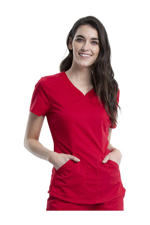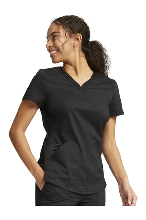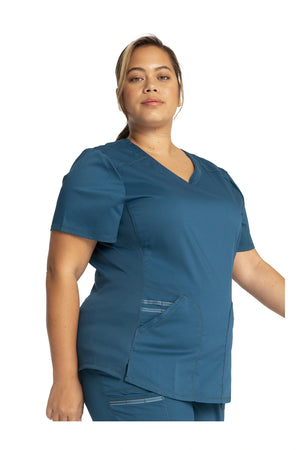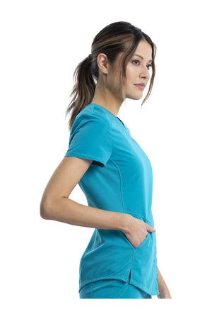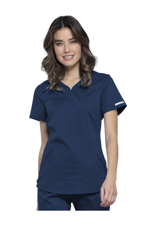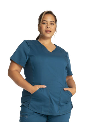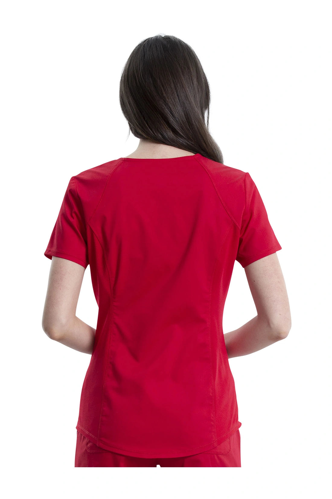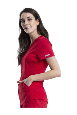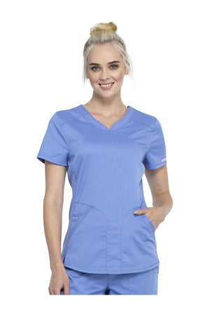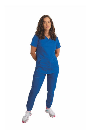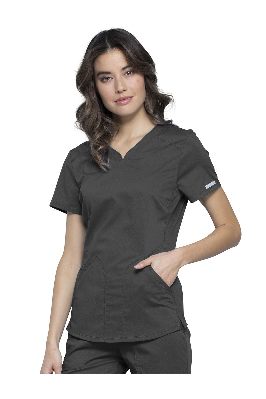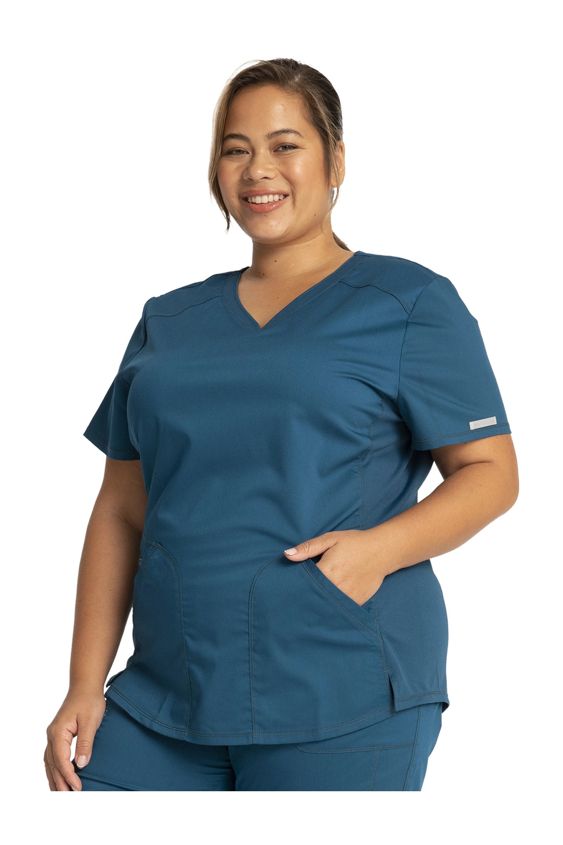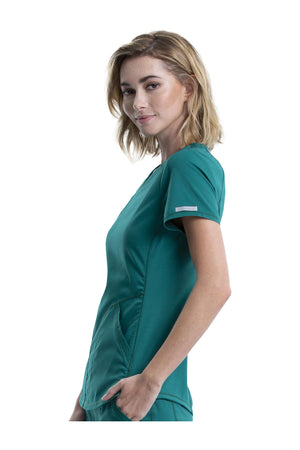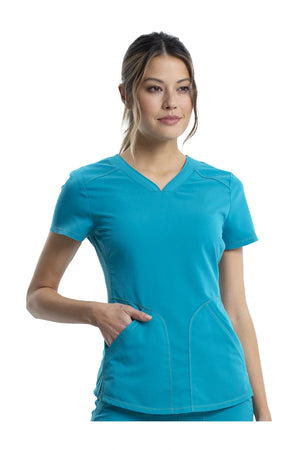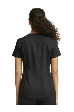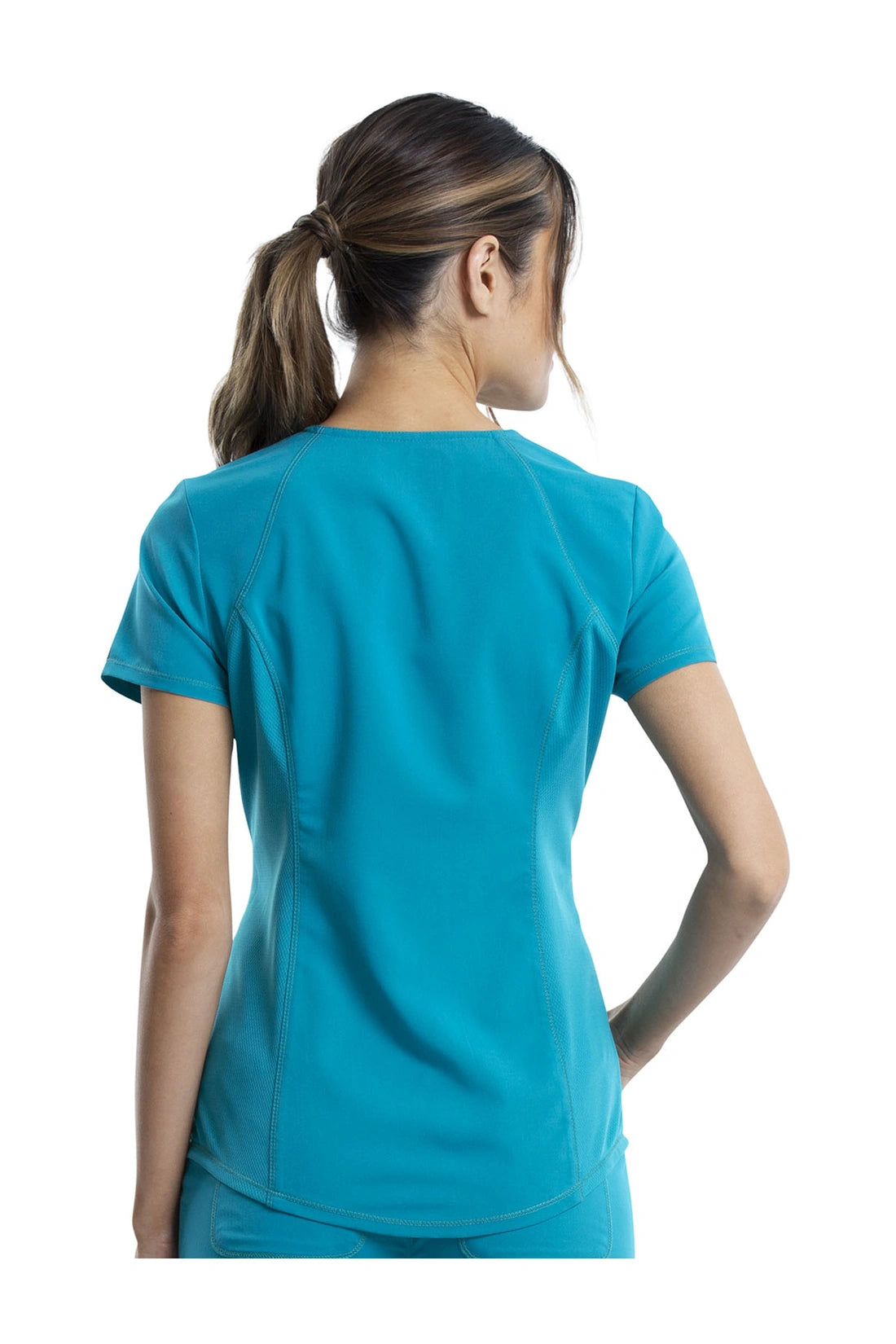 Añade un toque deportivo a tu vestuario médico con este top de cuello en V de forma suave con dos bolsillos de parche y bucles para instrumentos. Una malla transpirable en la banda del cuello y los paneles laterales para mayor comodidad y movilidad. Ajuste clásico moderno. Longitud en el centro de la espalda: 26
