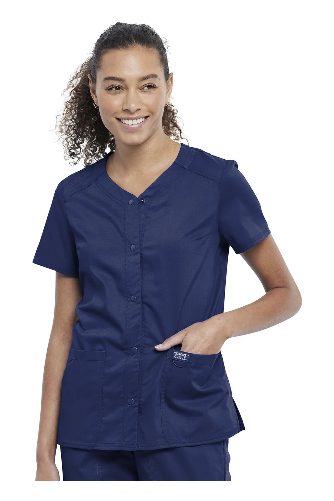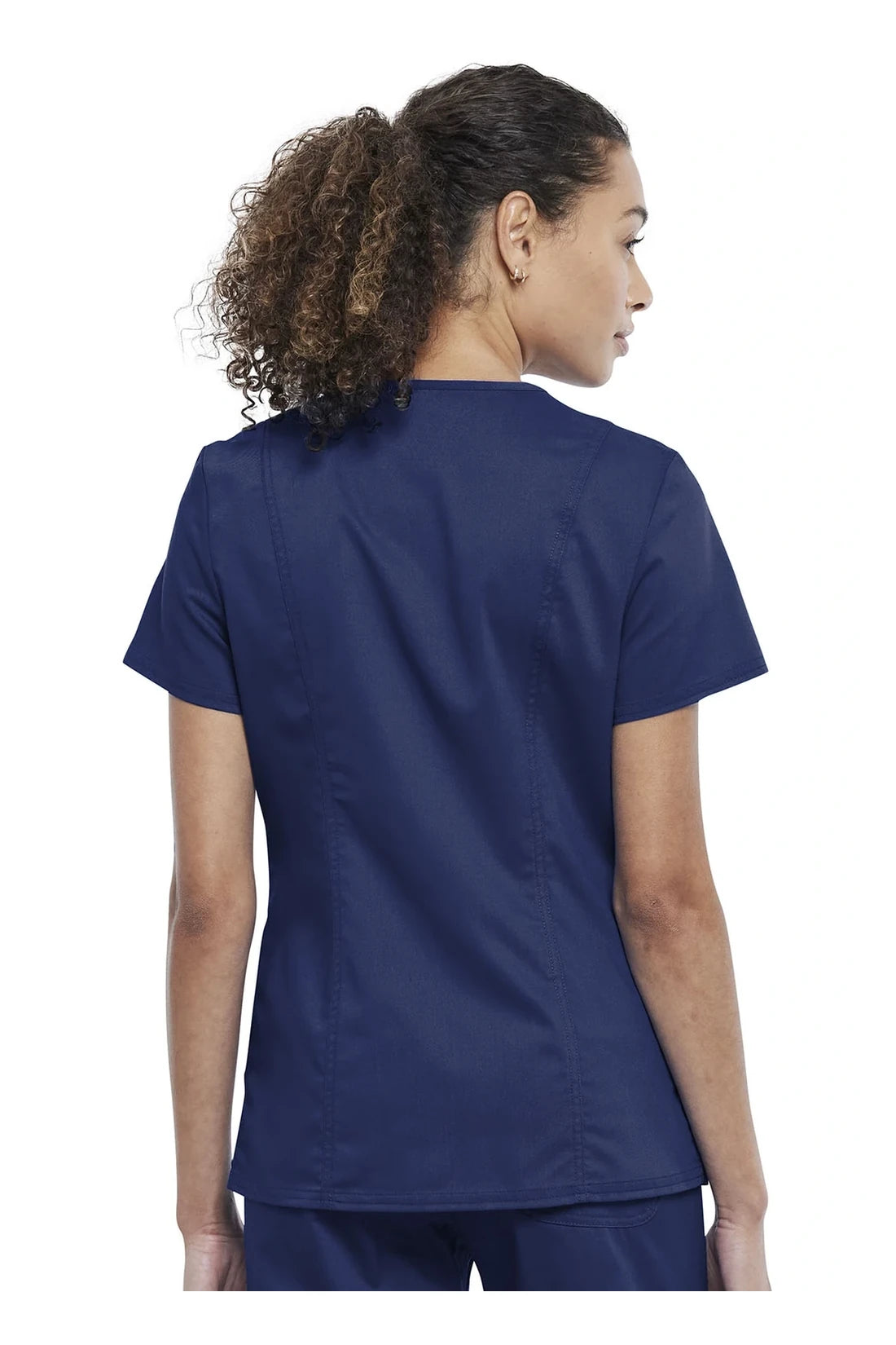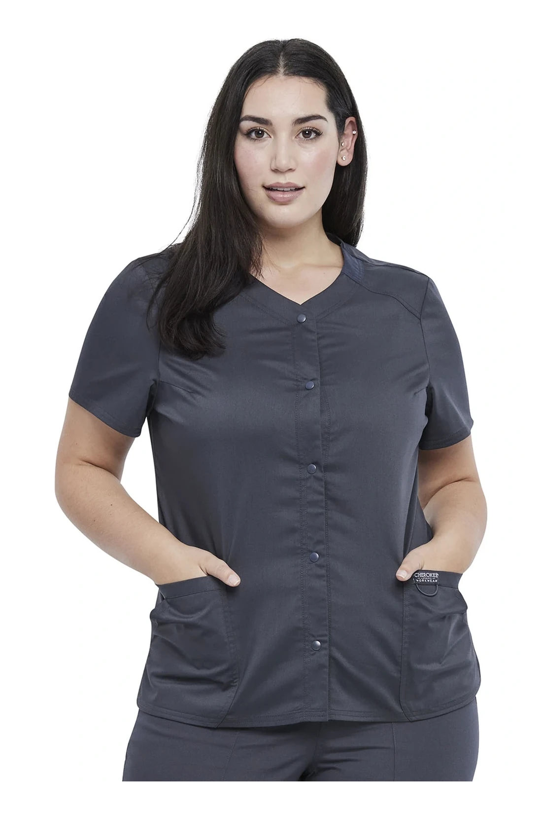 Esta camiseta Modern Classic con escote en V presenta cierre frontal con presión, incrustaciones de punto en el escote, costuras de canesú delanteras, costuras princesa traseras y una etiqueta con logo con lazo elástico. En total hay cuatro bolsillos: dos bolsillos frontales con parche de entrada superior y dos bolsillos laterales con ángulo lateral. Las rejillas laterales completan el aspecto. Longitud del centro de la espalda: 26"