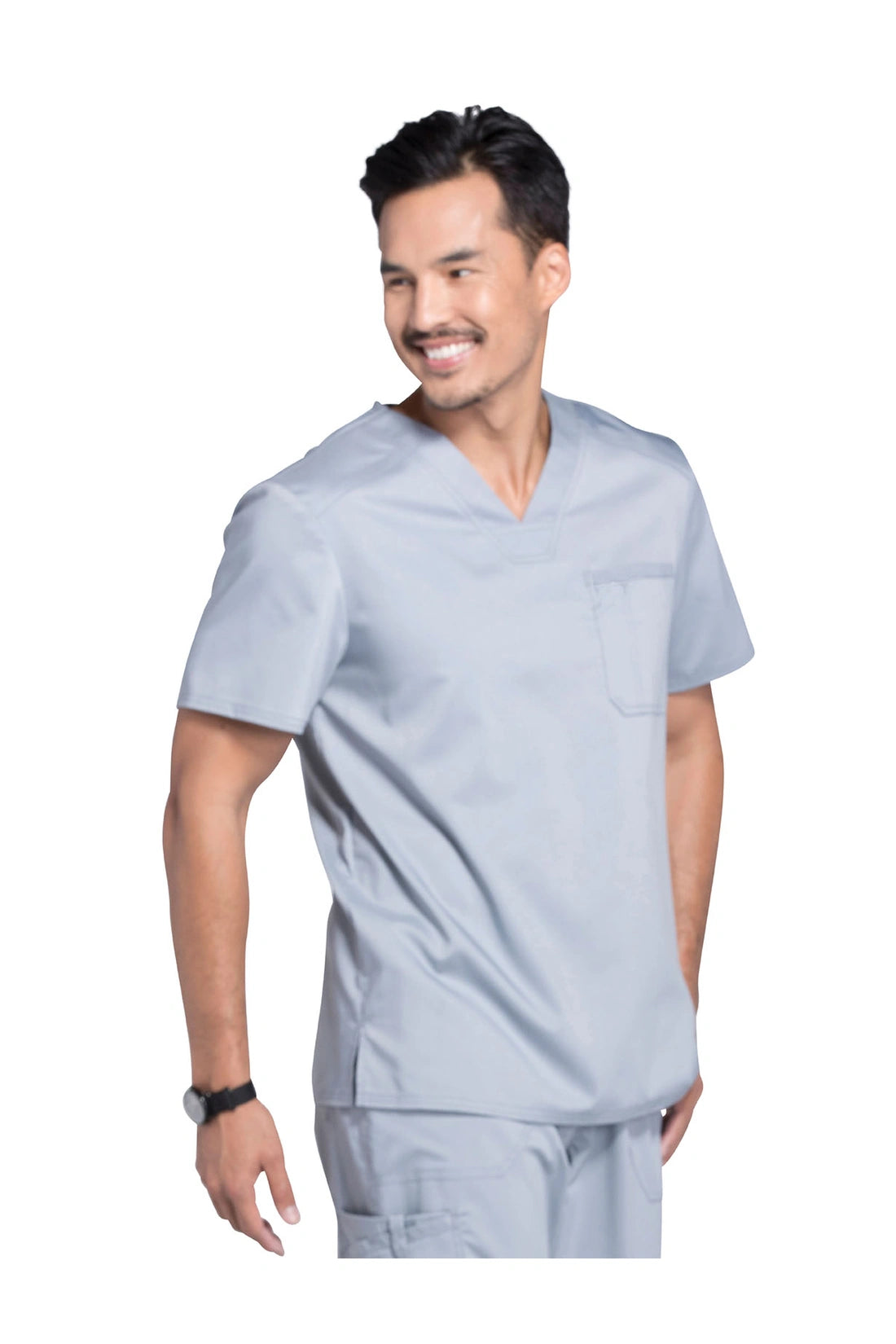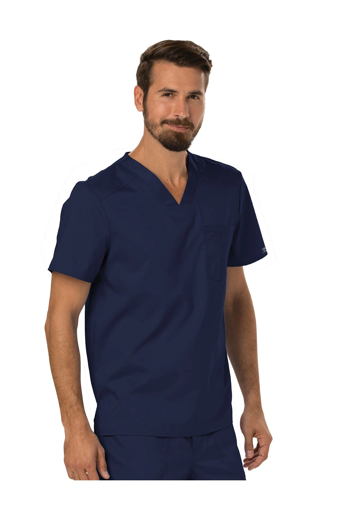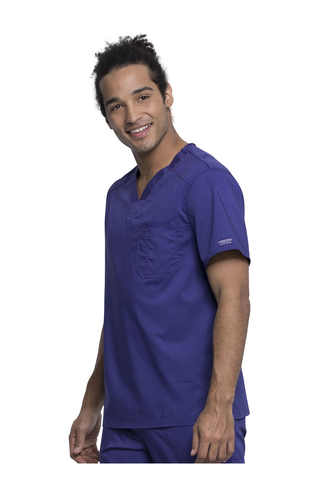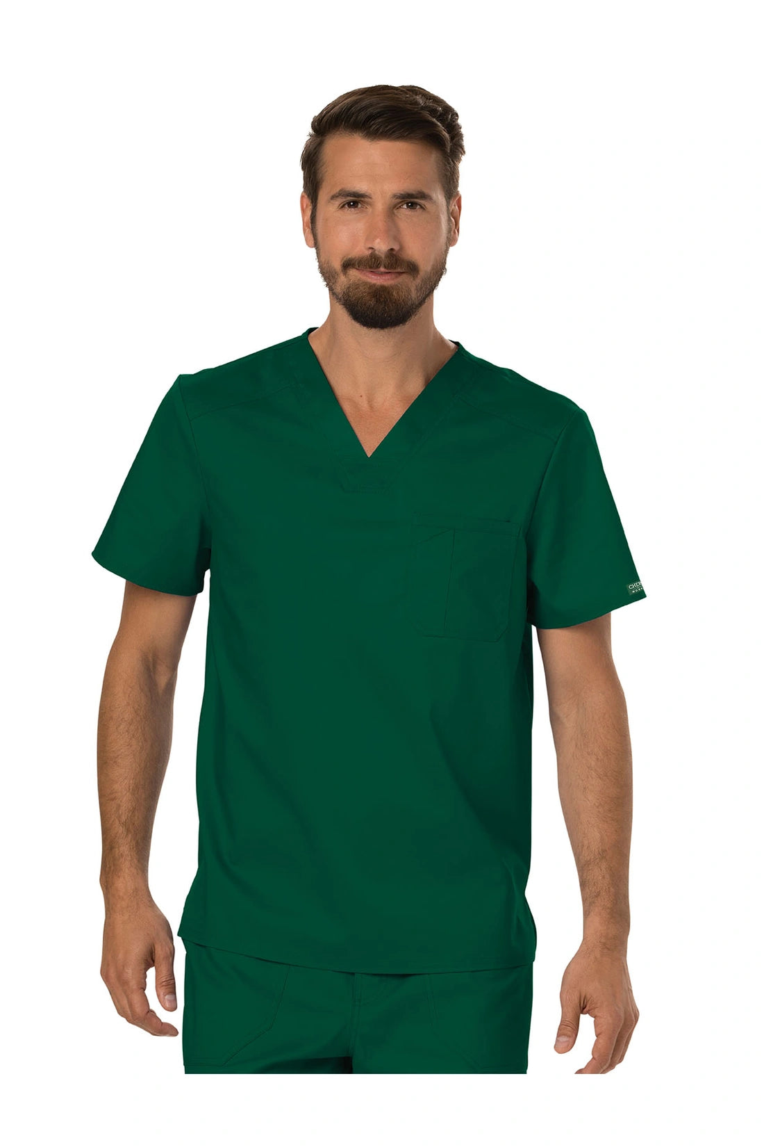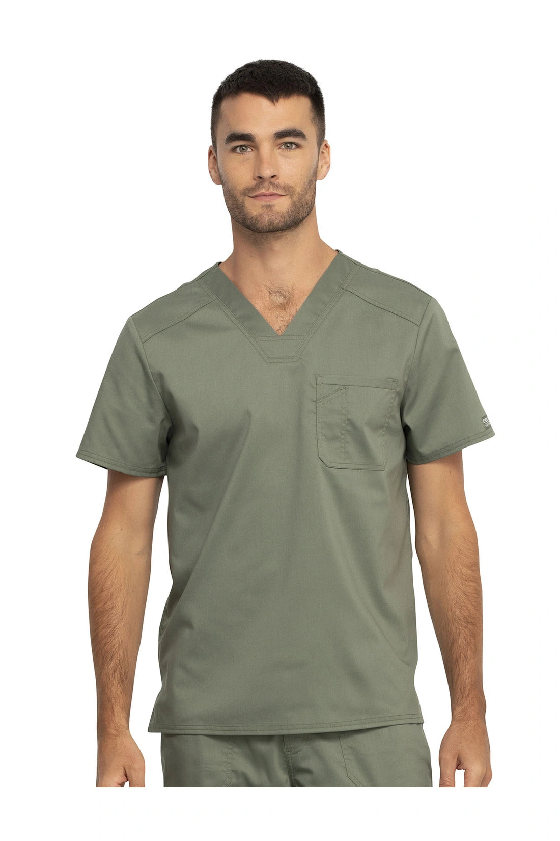 La camiseta de cuello en V de corte moderno para hombre cuenta con un bolsillo en el pecho con un bolsillo adicional para bolígrafos, un canesú en la espalda y aberturas laterales. Este estilo se ve muy bien metido o sin meter. Longitud en el centro de la espalda: 29