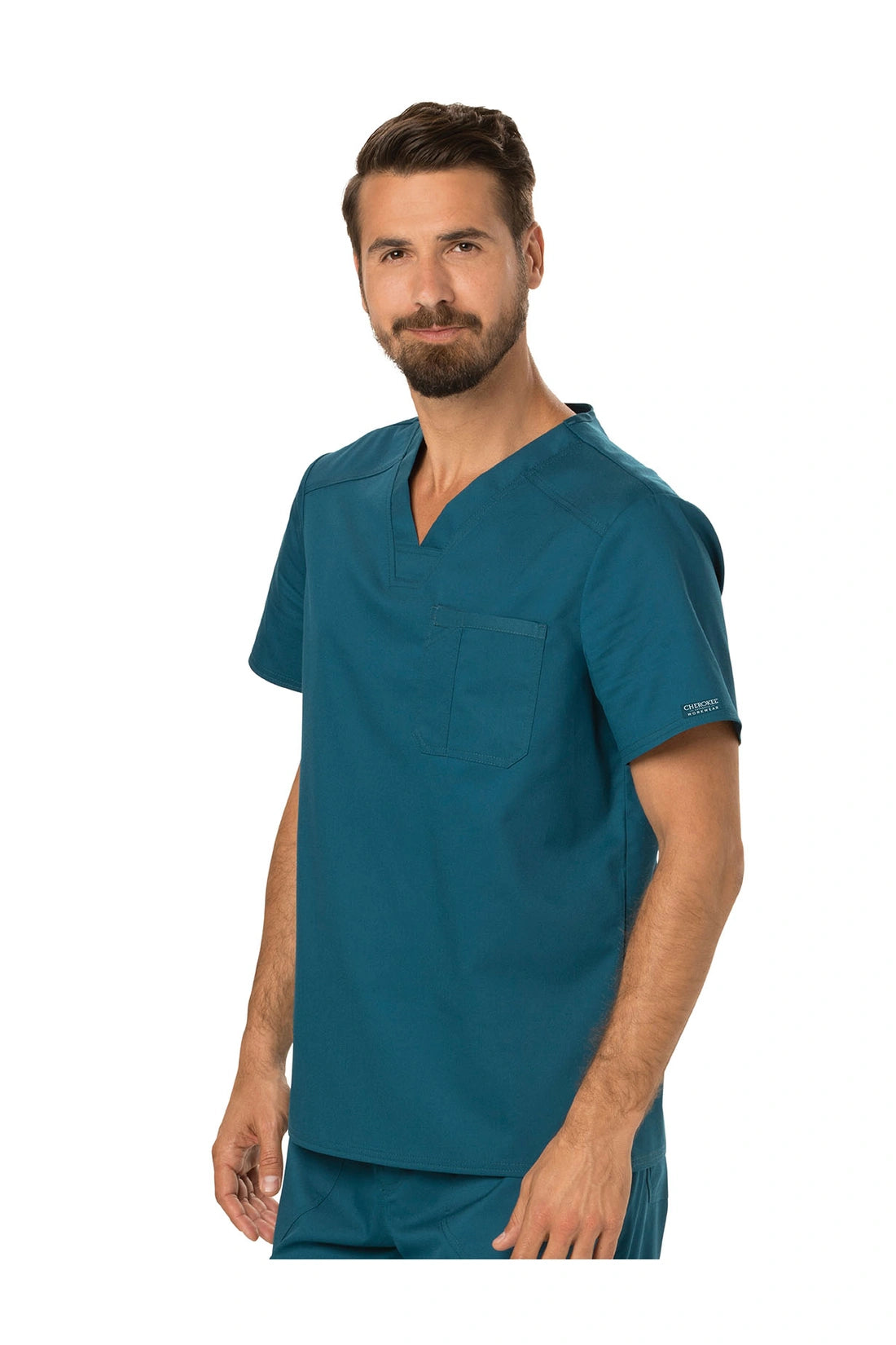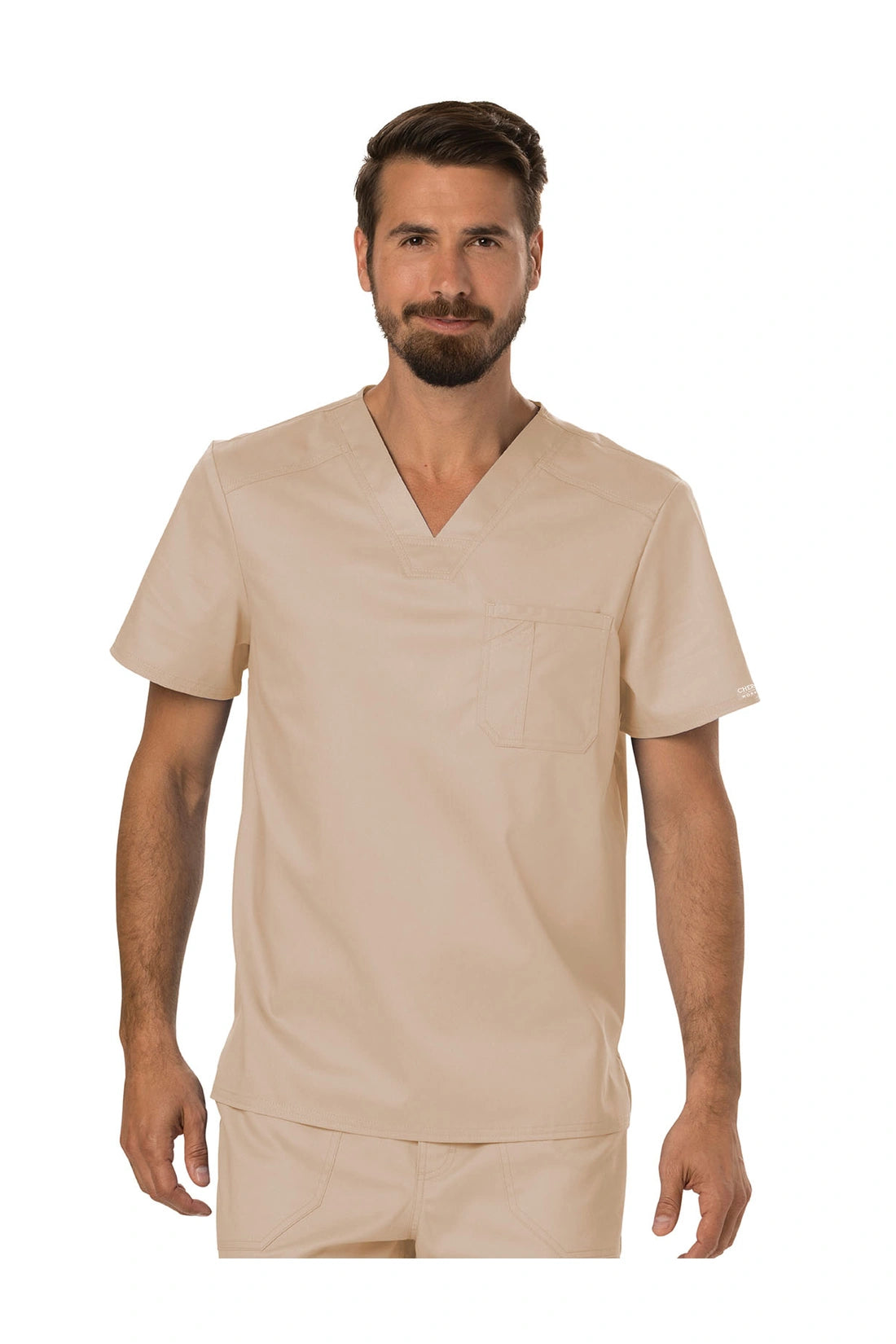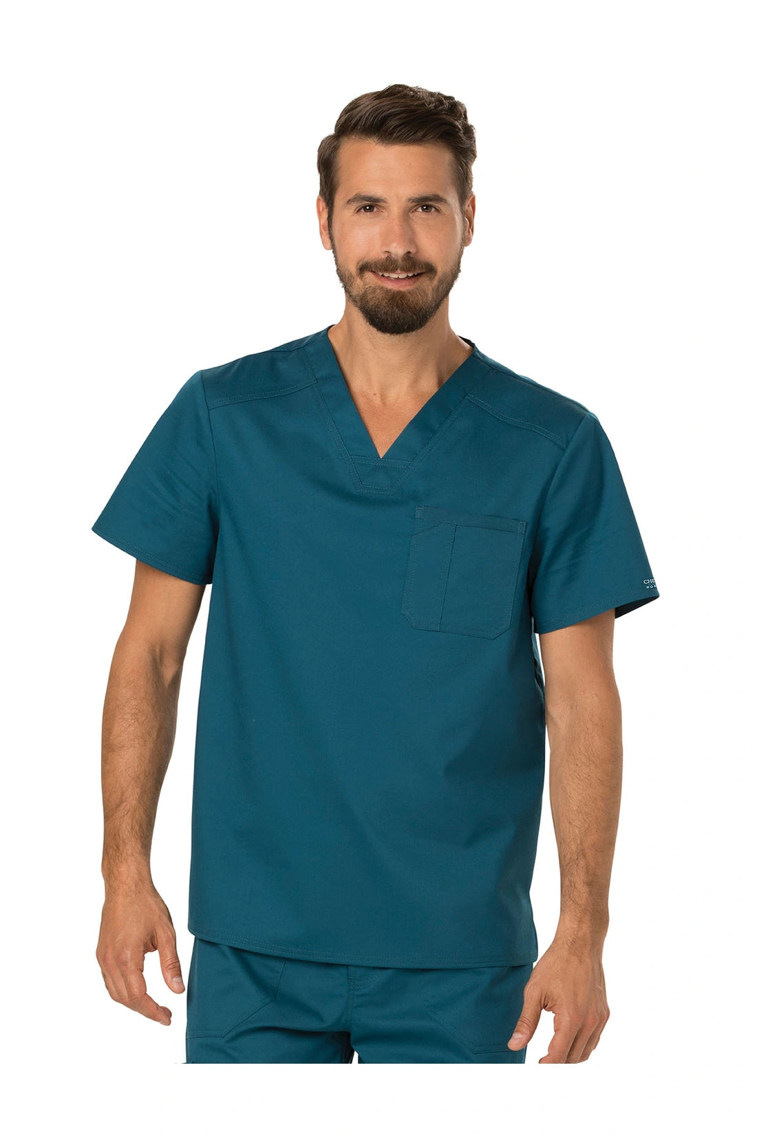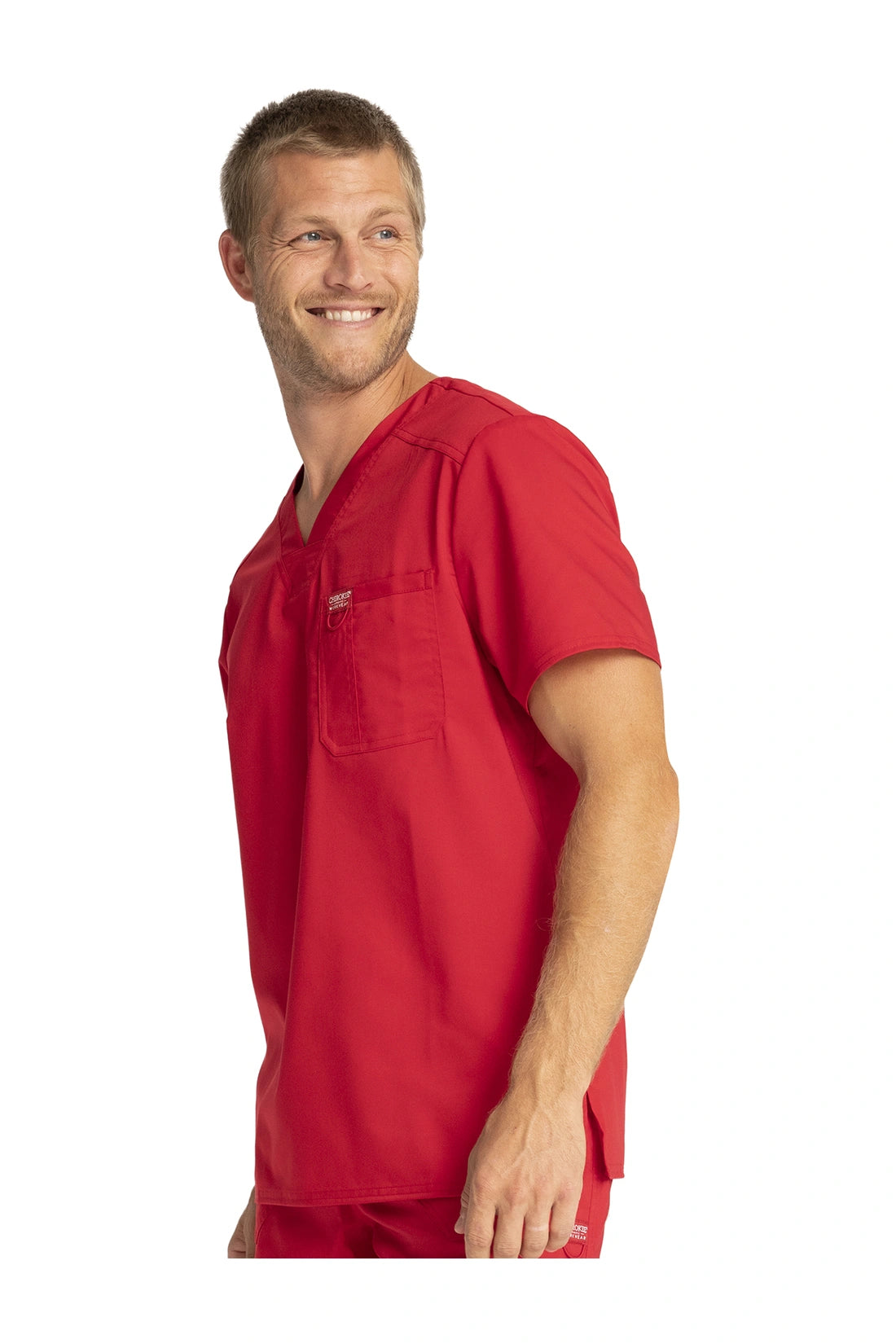 La camiseta de cuello en V de corte moderno para hombre cuenta con un bolsillo en el pecho con un bolsillo adicional para bolígrafos, un canesú en la espalda y aberturas laterales. Este estilo se ve muy bien metido o sin meter. Longitud en el centro de la espalda: 29