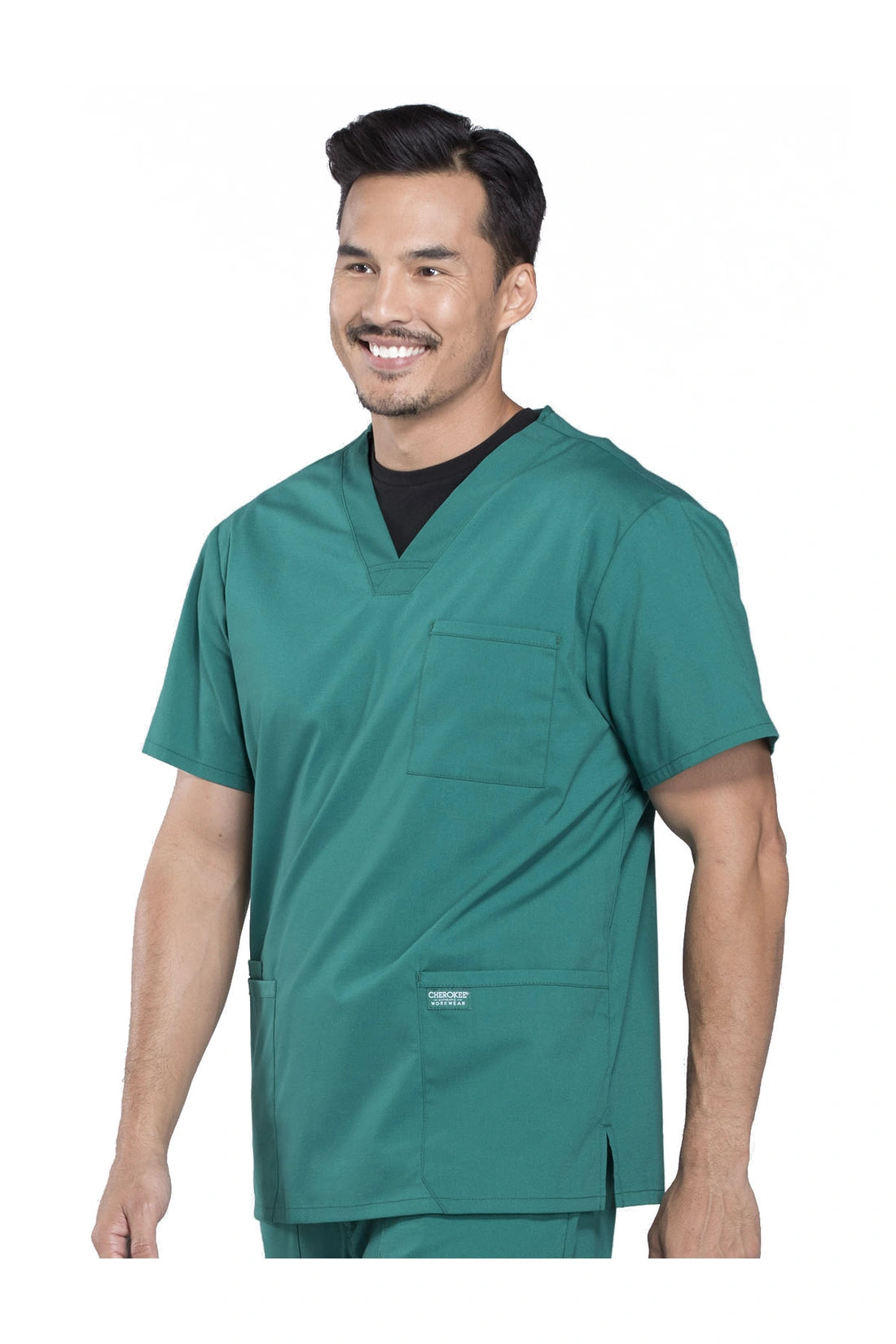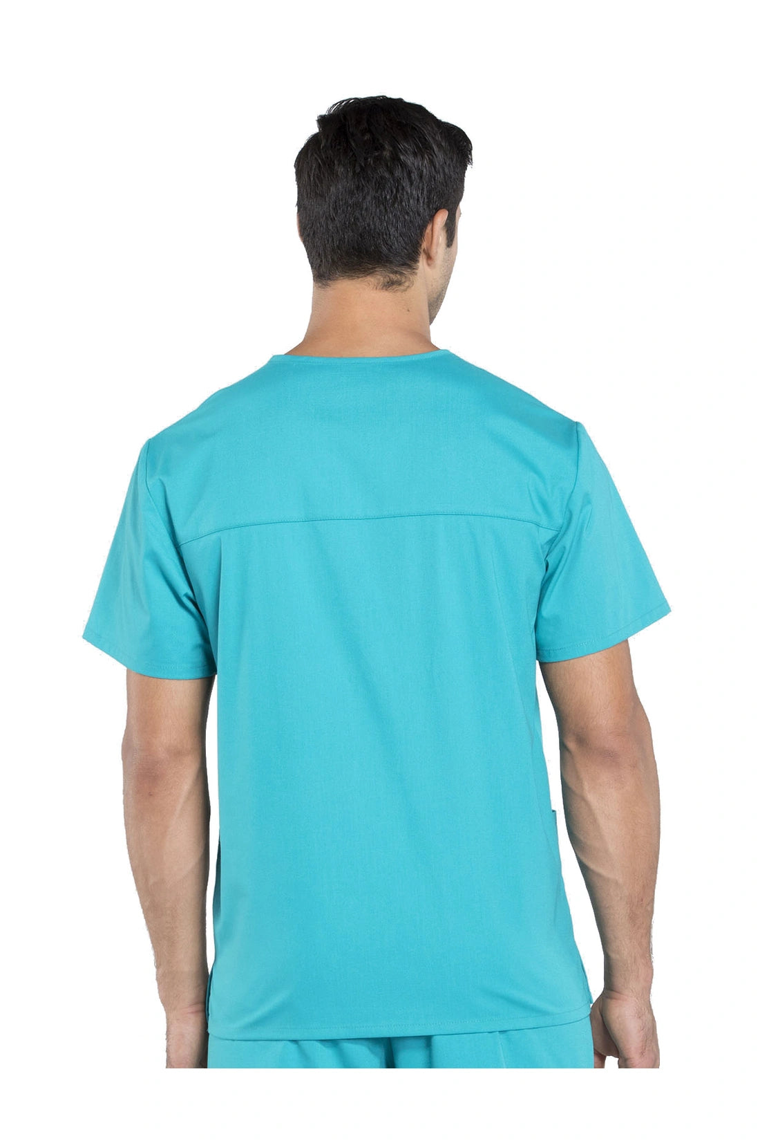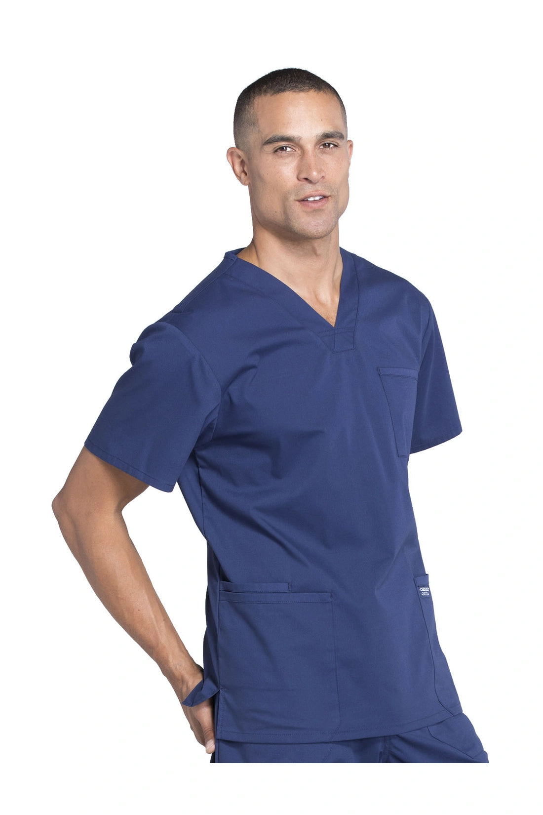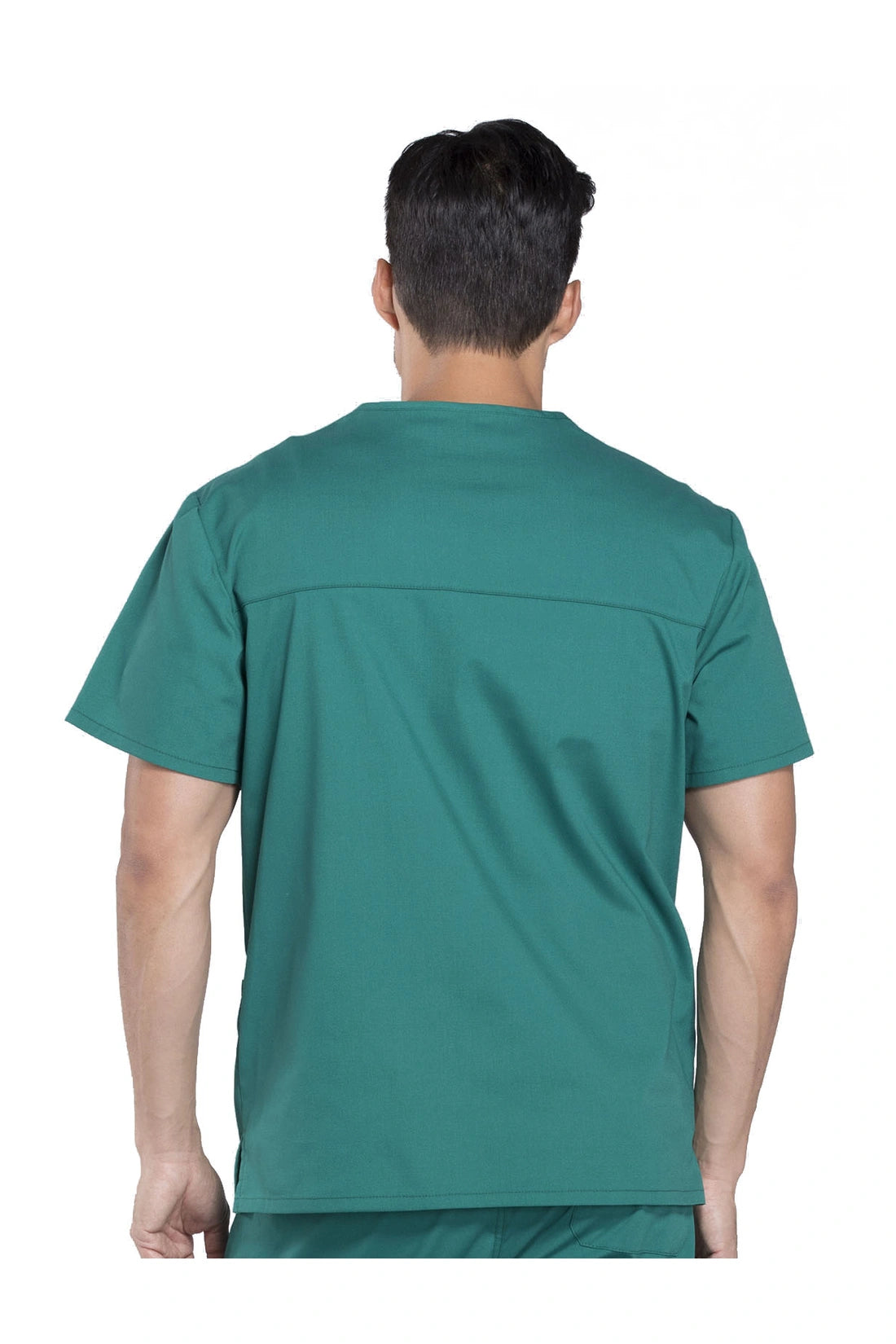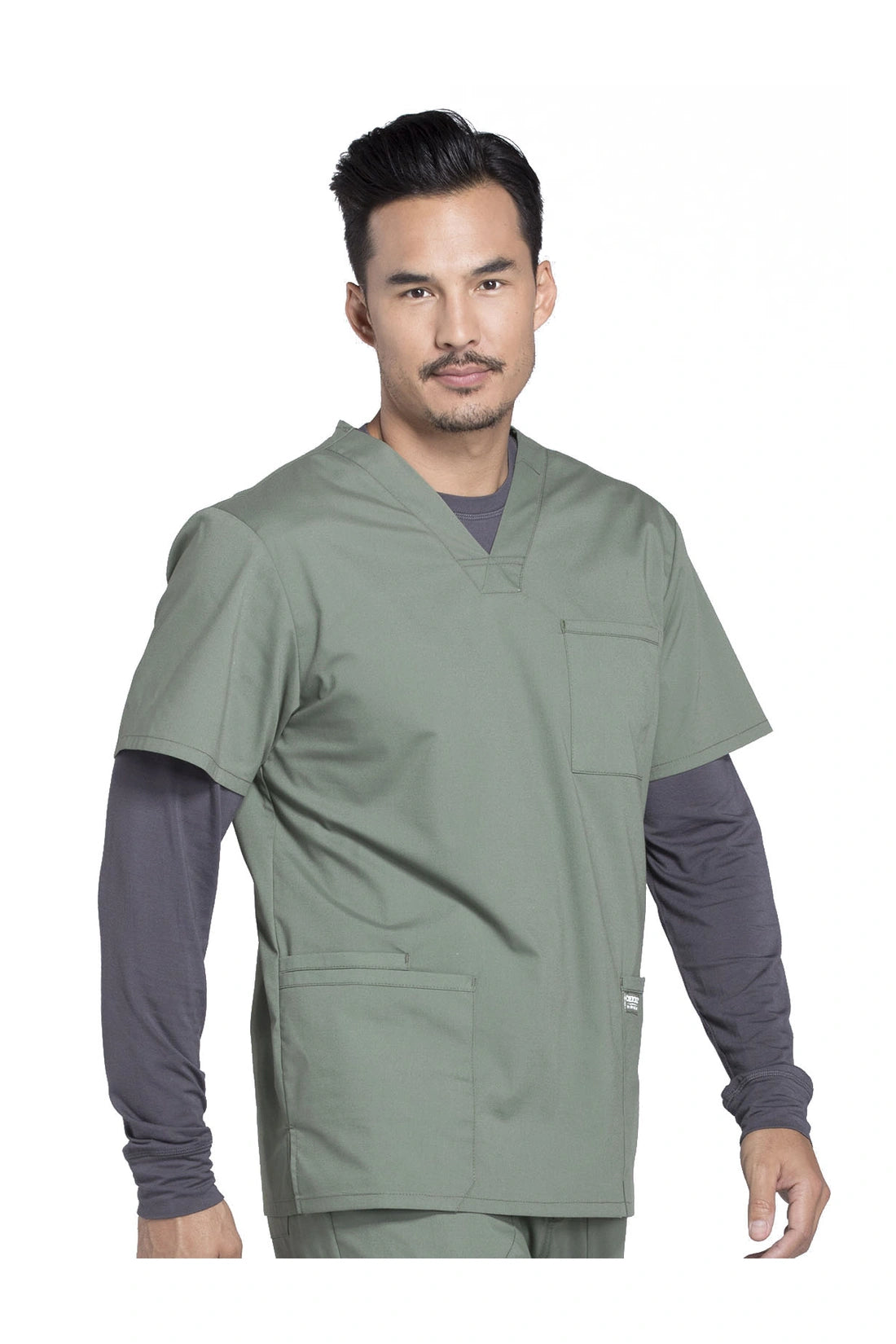 La camiseta de cuello en V de corte tradicional para hombre cuenta con un bolsillo en el pecho, dos bolsillos de parche, un bolsillo para el teléfono móvil, un lazo oculto para instrumentos, un canesú en la espalda y aberturas laterales. Longitud del centro de la espalda: 32