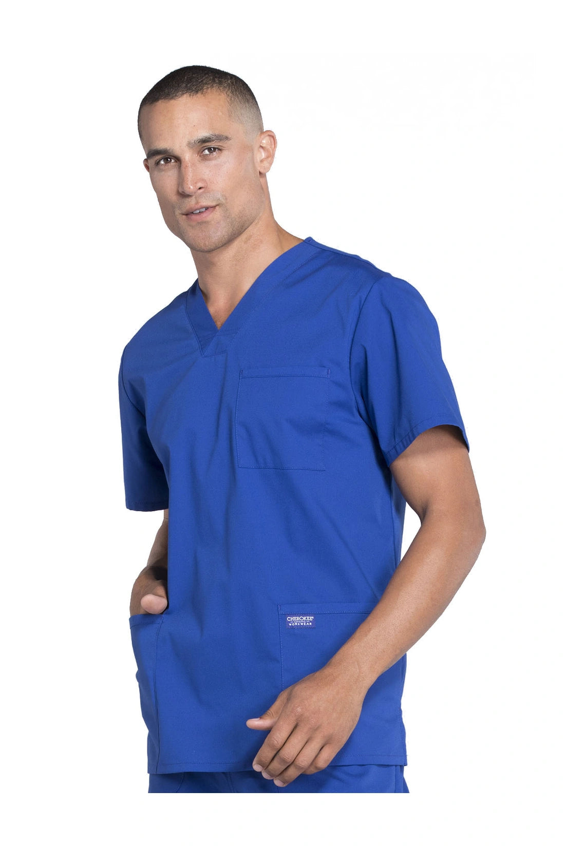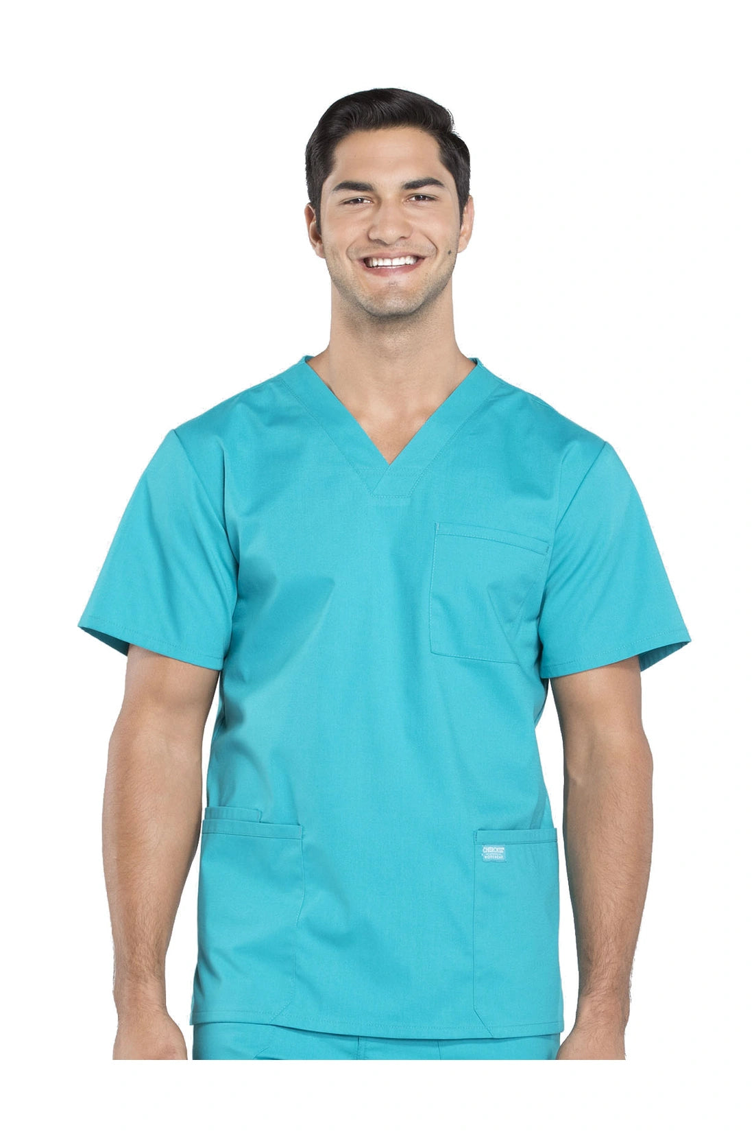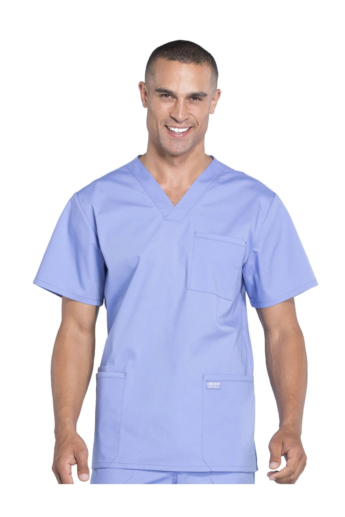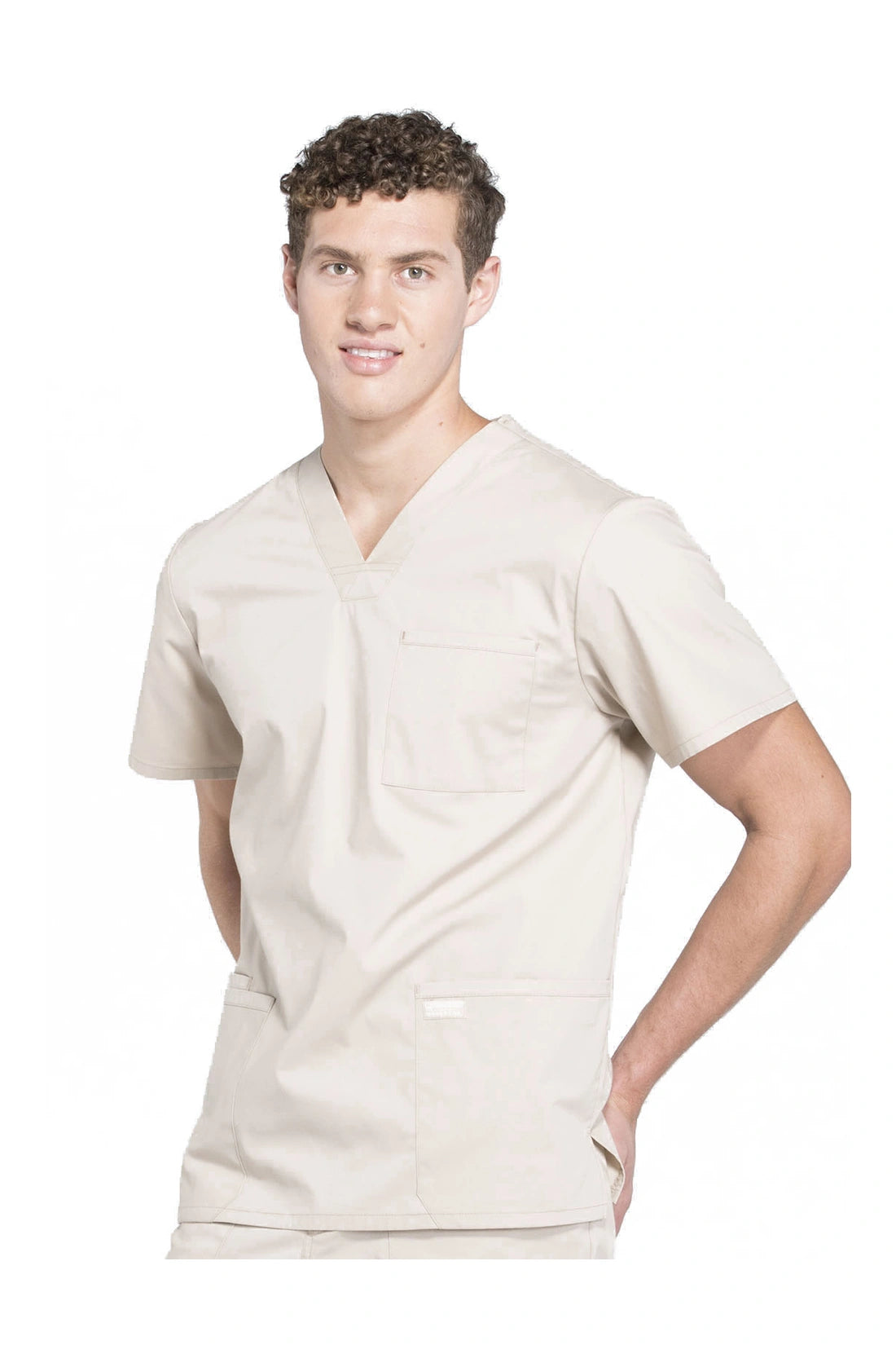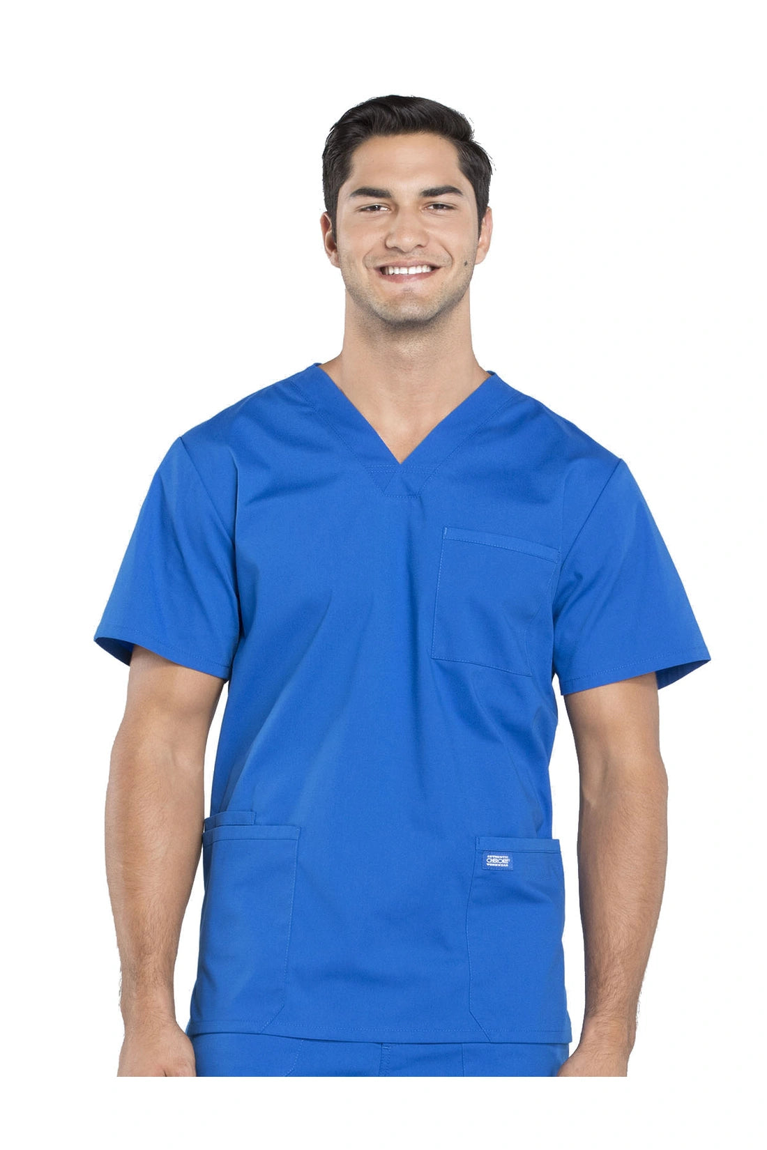 La camiseta de cuello en V de corte tradicional para hombre cuenta con un bolsillo en el pecho, dos bolsillos de parche, un bolsillo para el teléfono móvil, un lazo oculto para instrumentos, un canesú en la espalda y aberturas laterales. Longitud del centro de la espalda: 32
