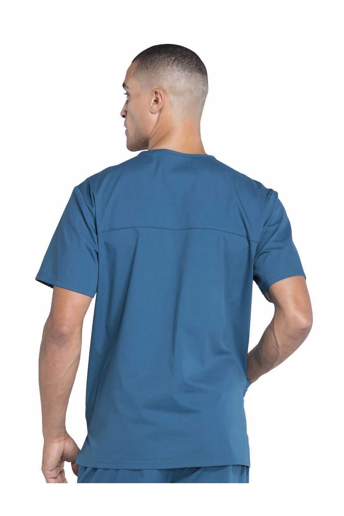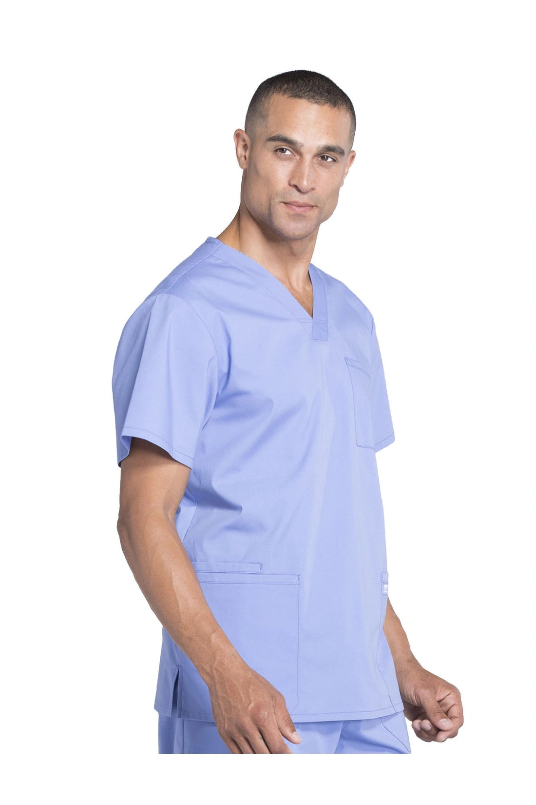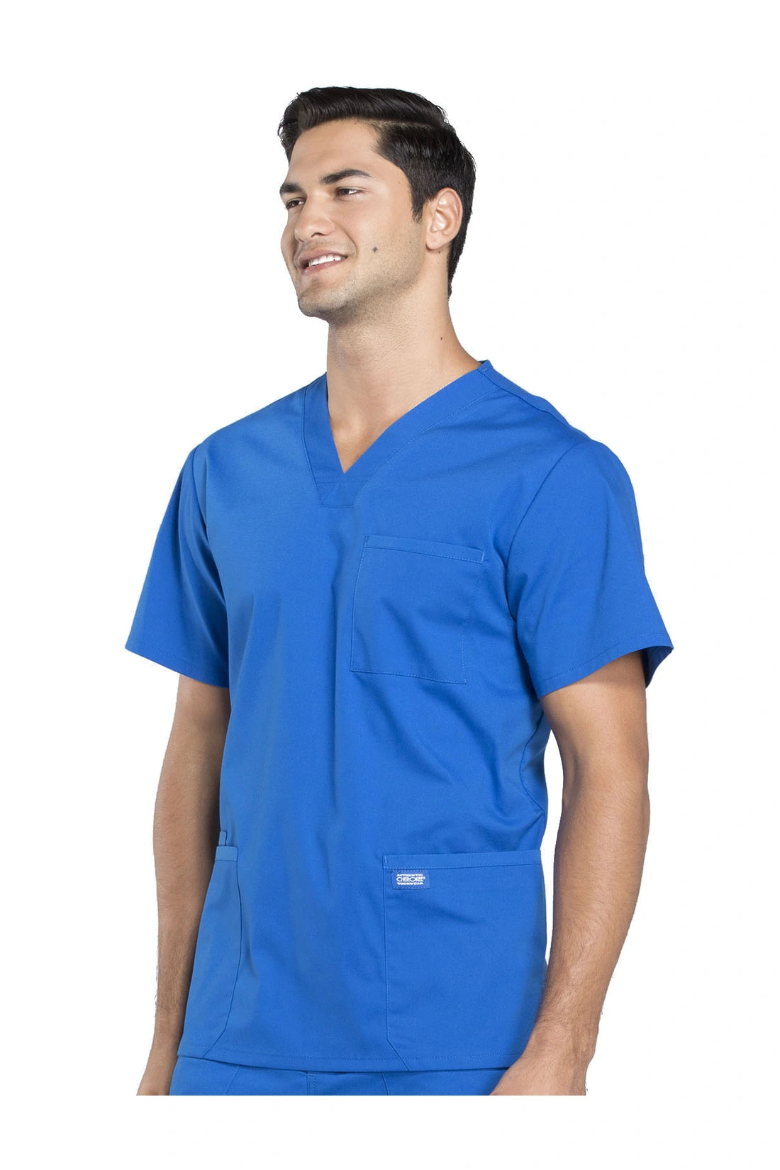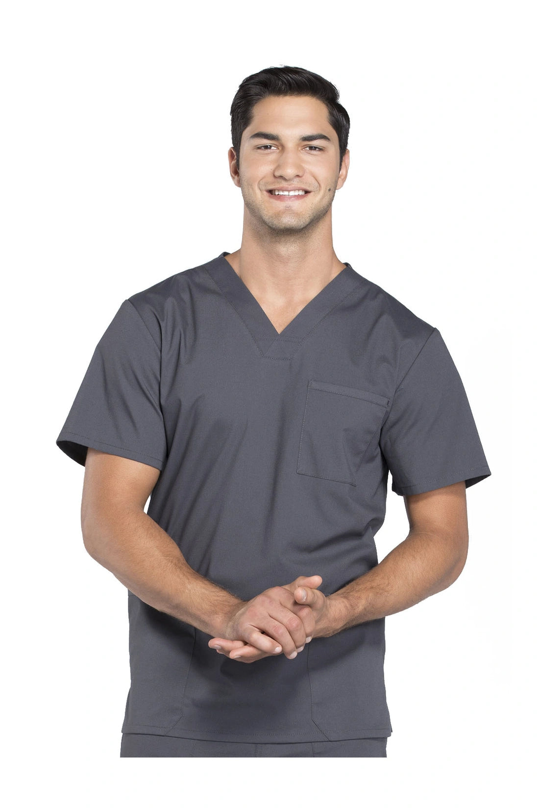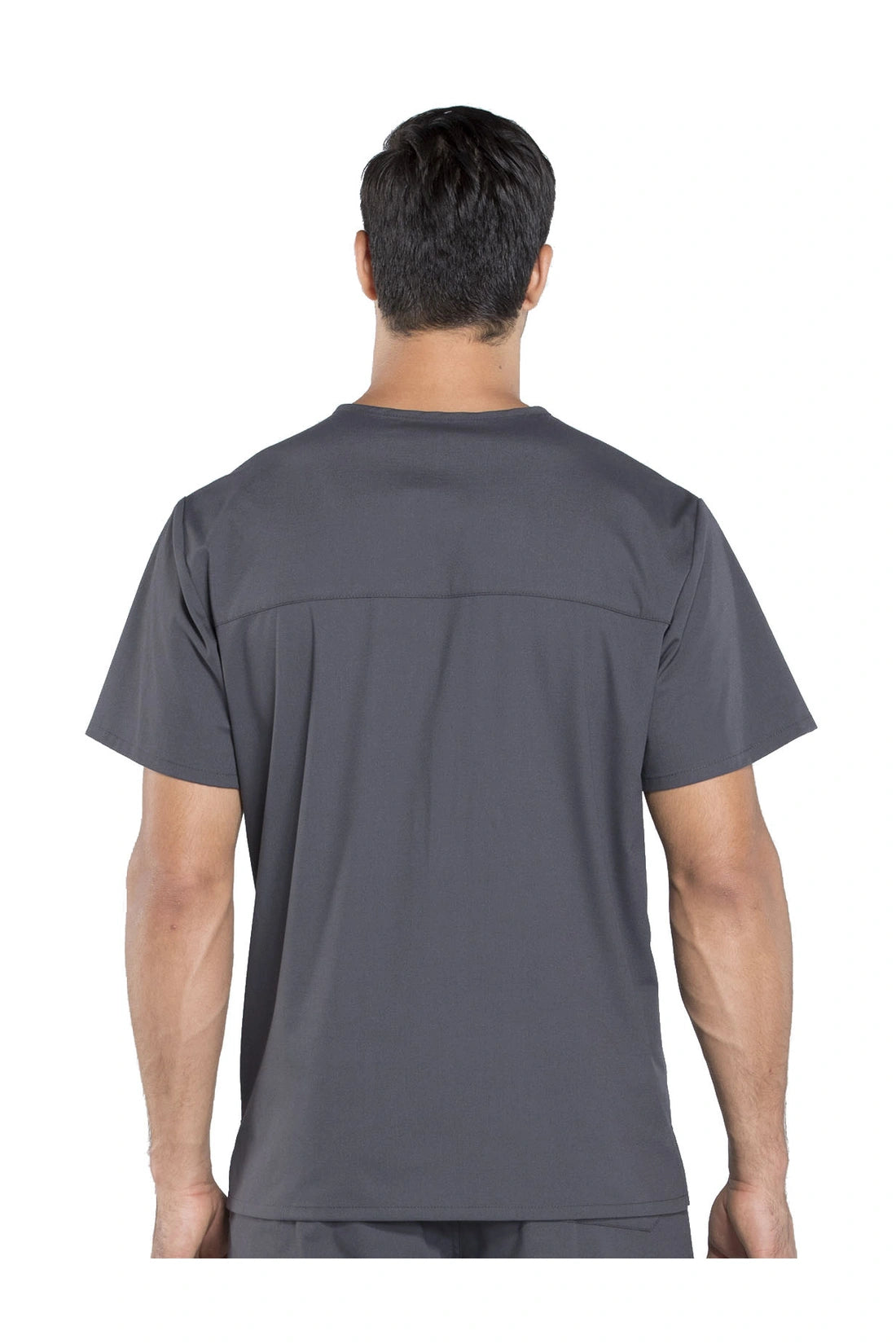 La camiseta de cuello en V de corte tradicional para hombre cuenta con un bolsillo en el pecho, dos bolsillos de parche, un bolsillo para el teléfono móvil, un lazo oculto para instrumentos, un canesú en la espalda y aberturas laterales. Longitud del centro de la espalda: 32