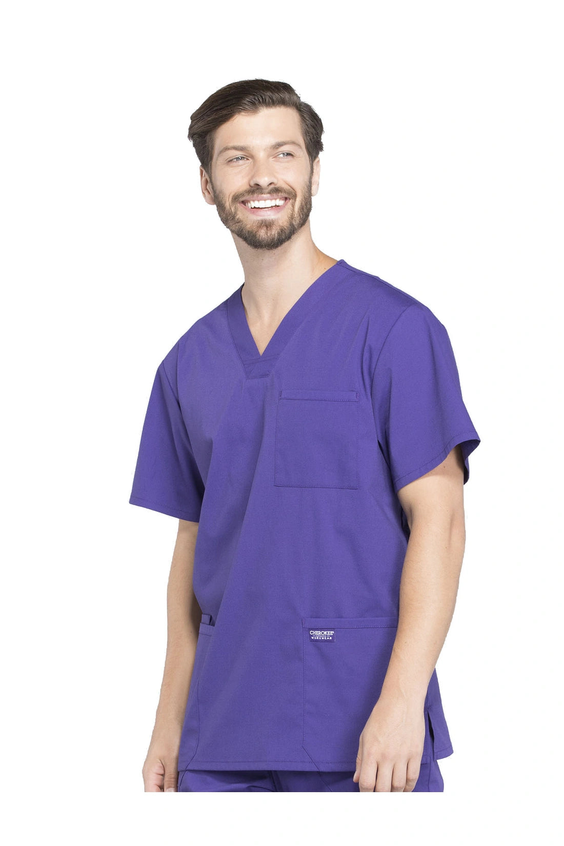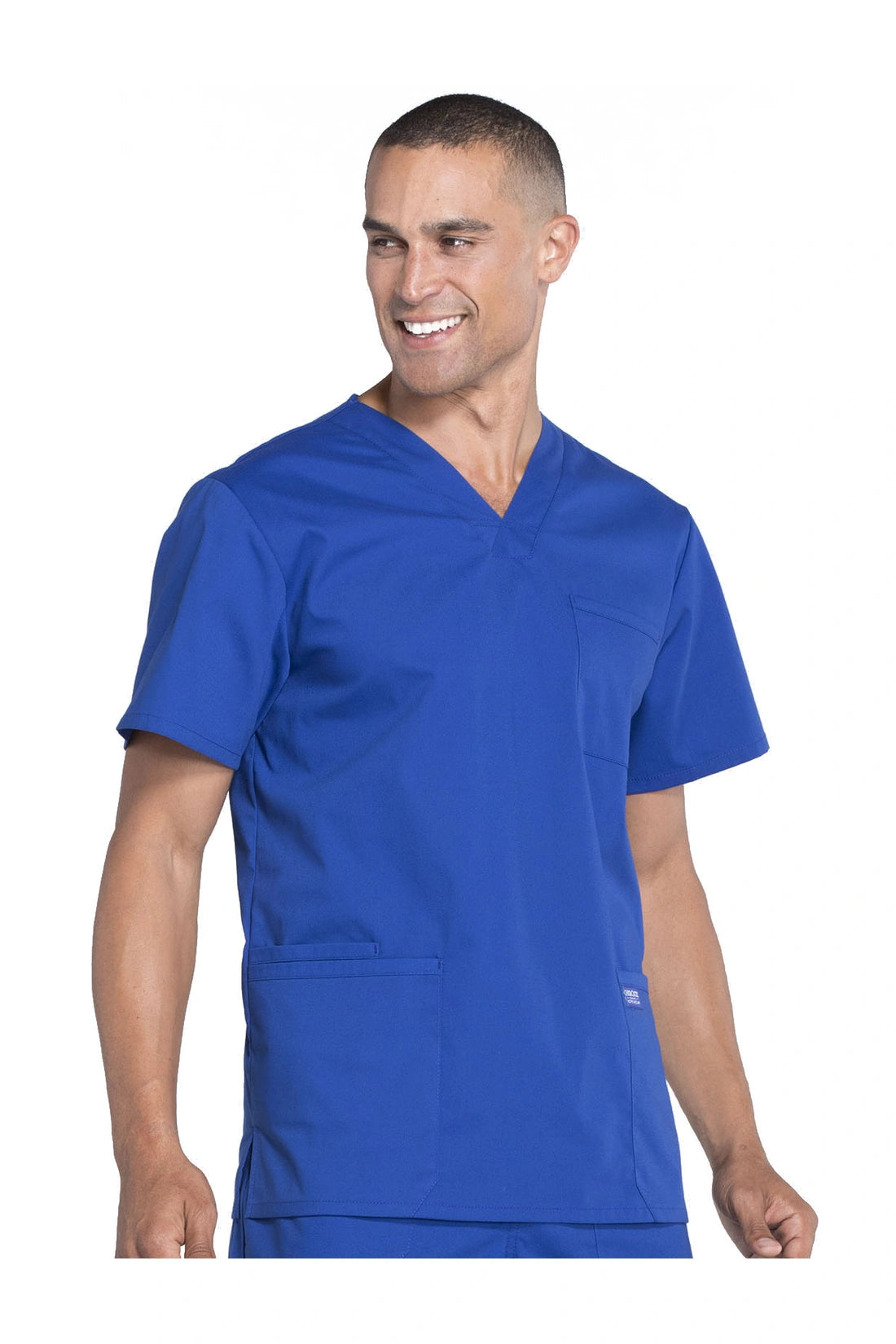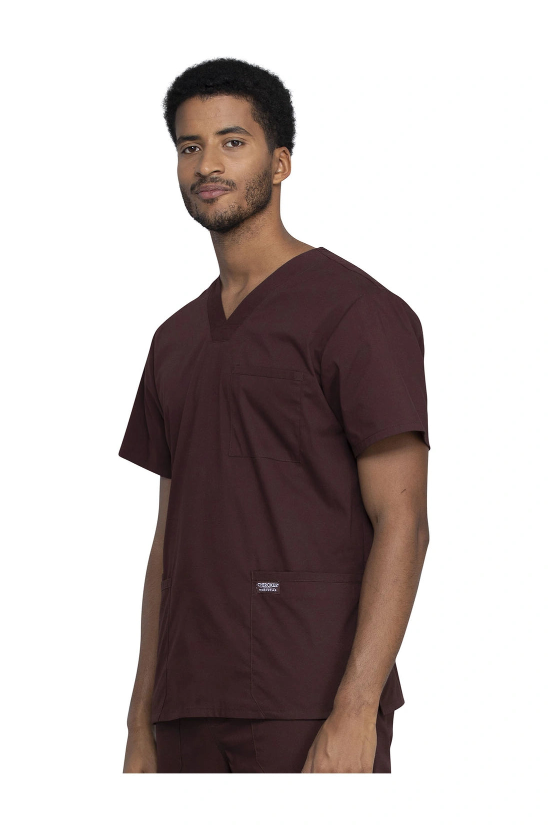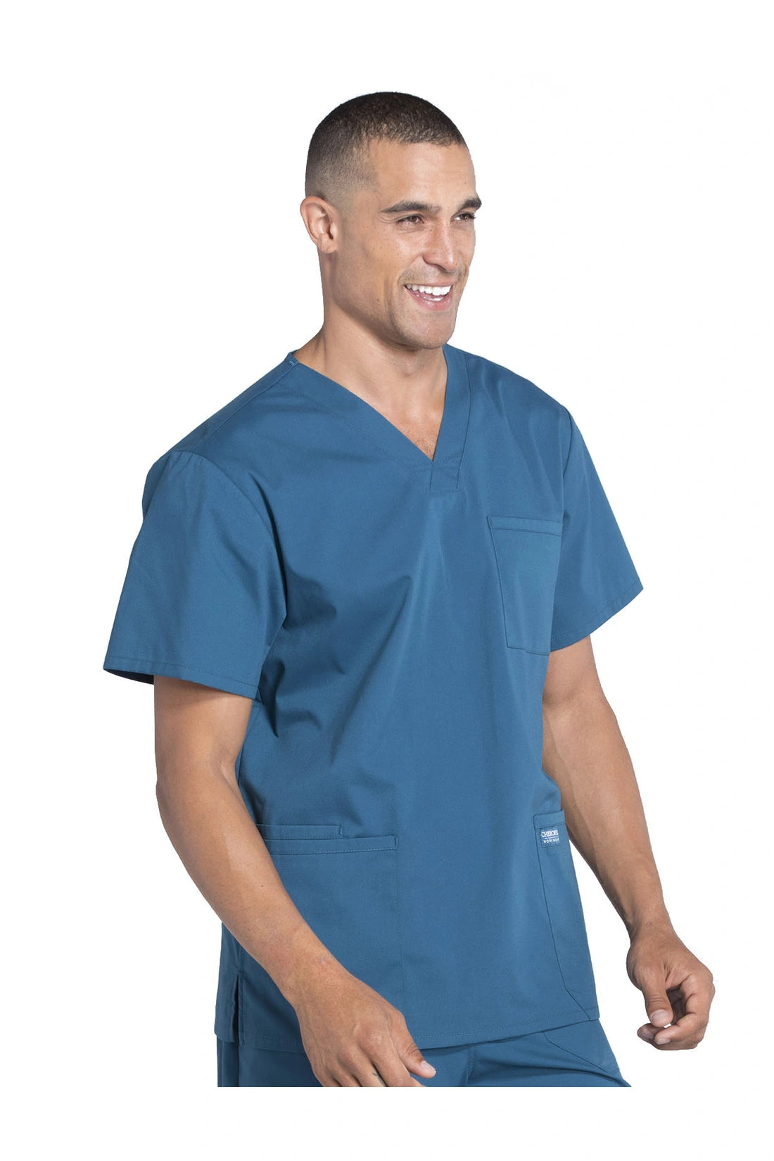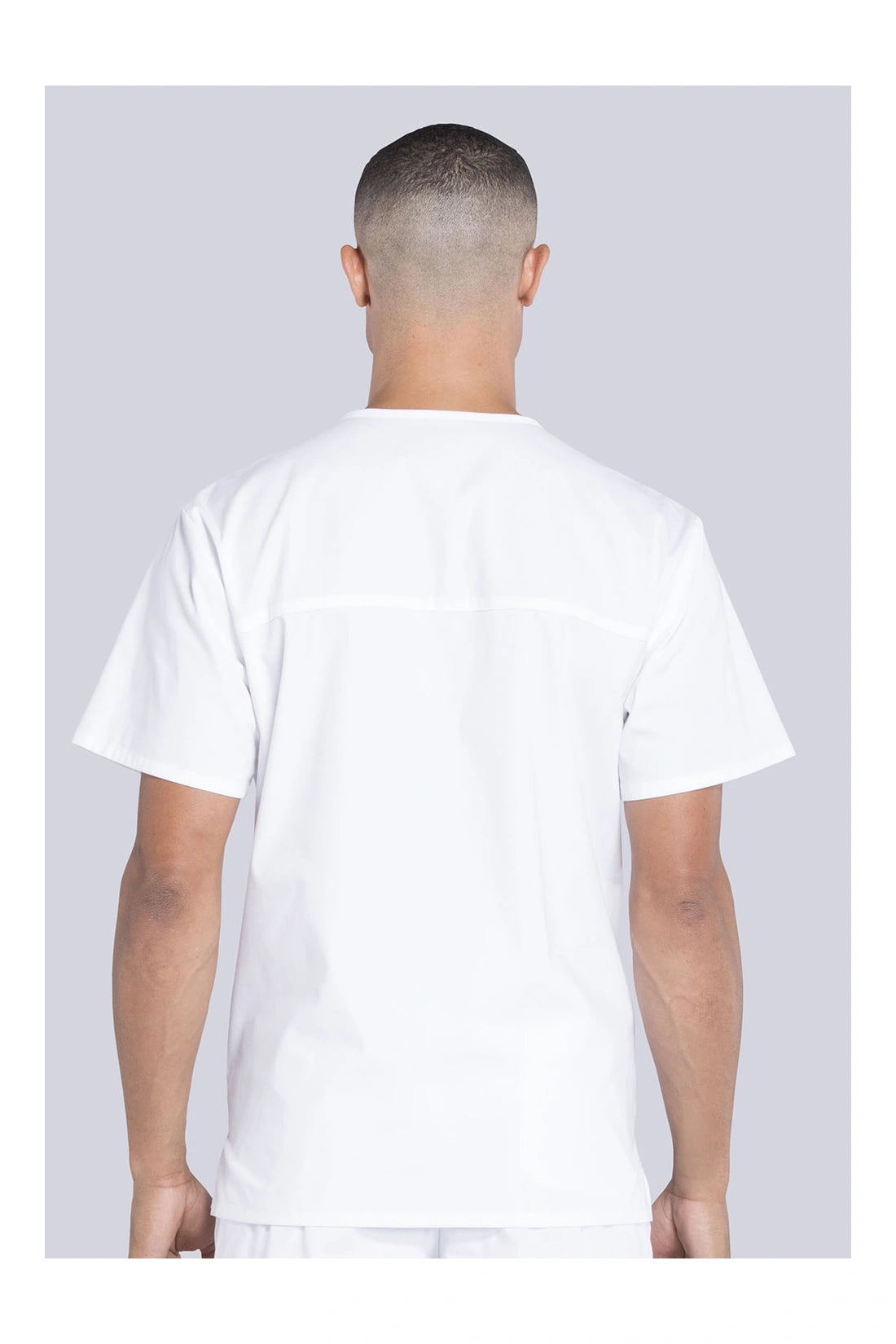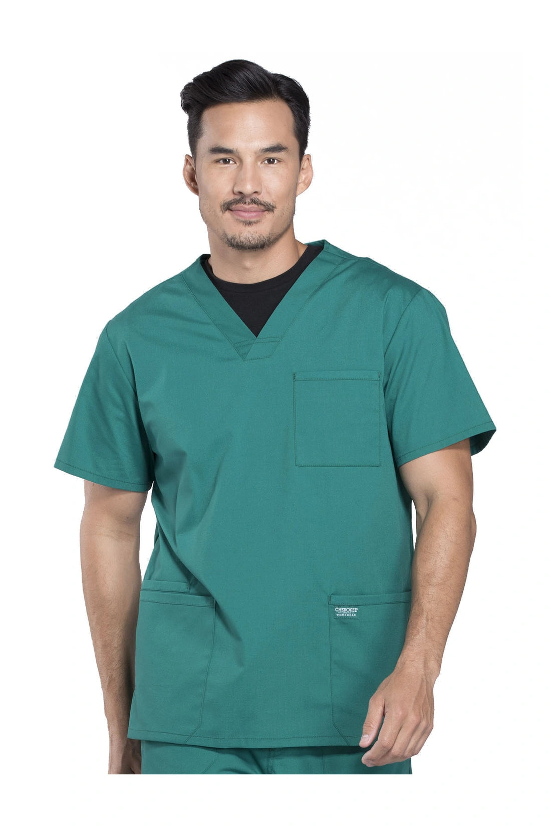 La camiseta de cuello en V de corte tradicional para hombre cuenta con un bolsillo en el pecho, dos bolsillos de parche, un bolsillo para el teléfono móvil, un lazo oculto para instrumentos, un canesú en la espalda y aberturas laterales. Longitud del centro de la espalda: 32