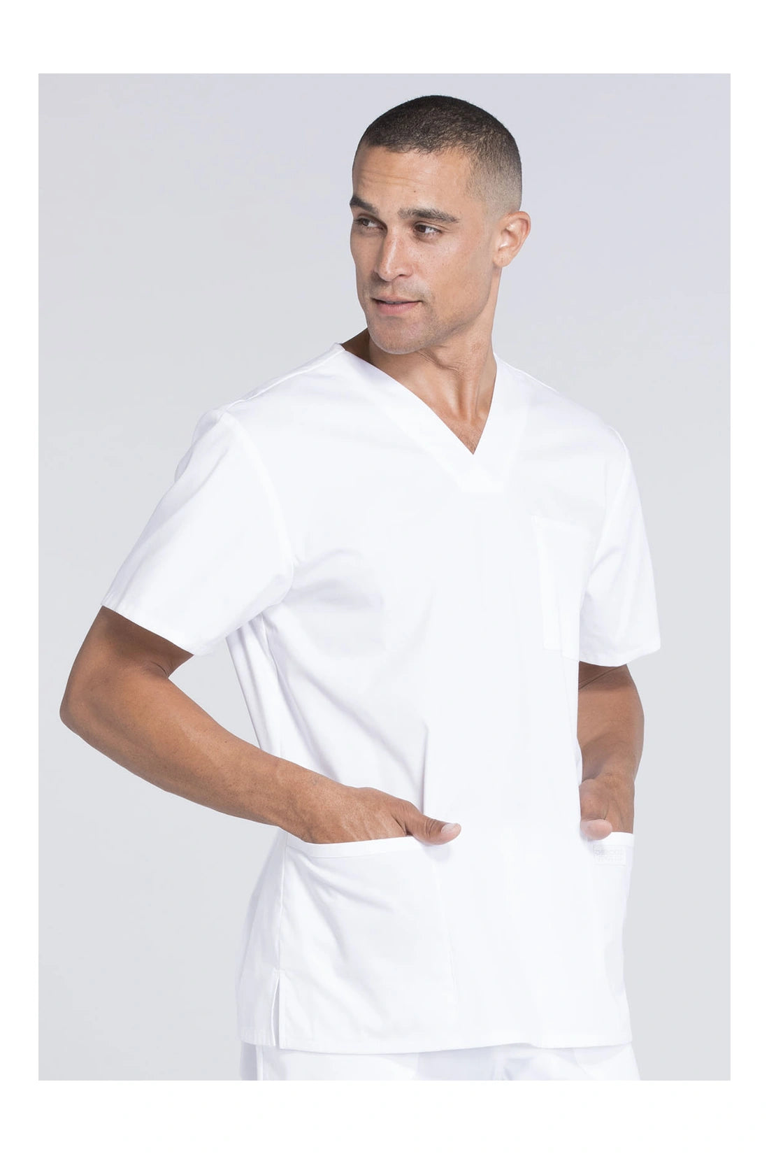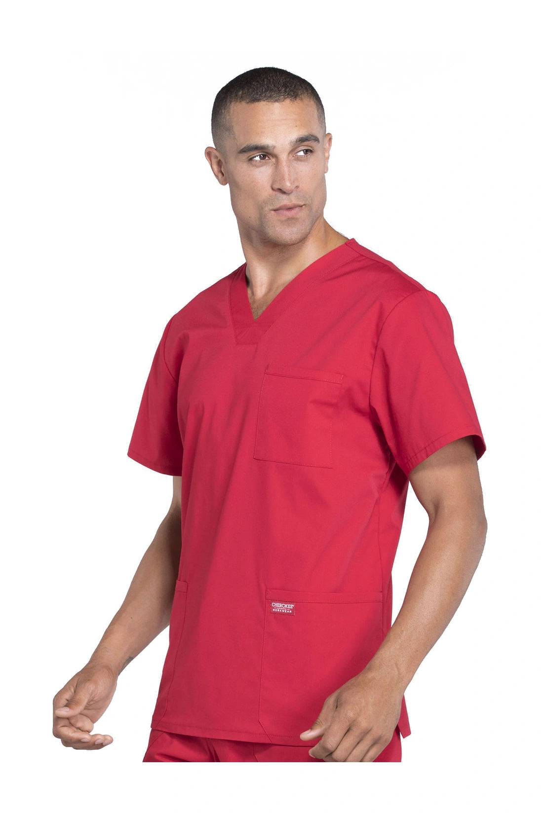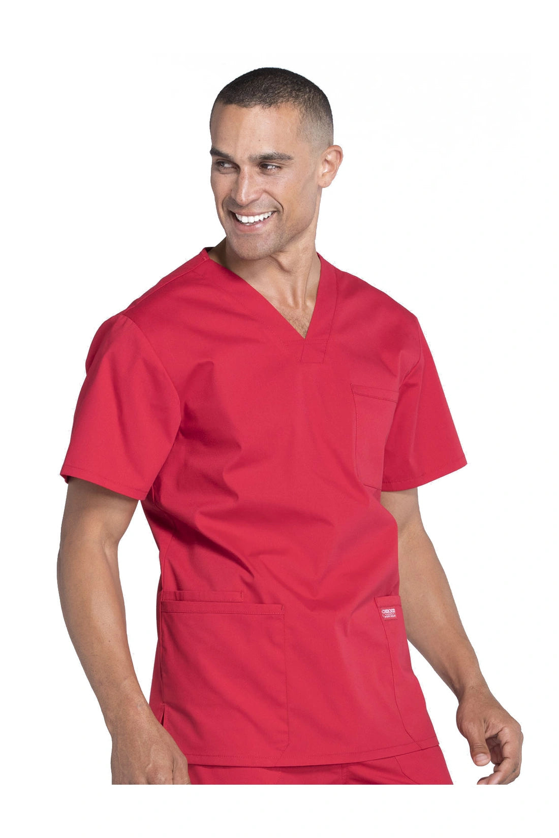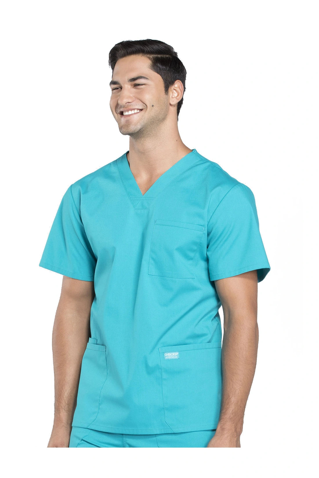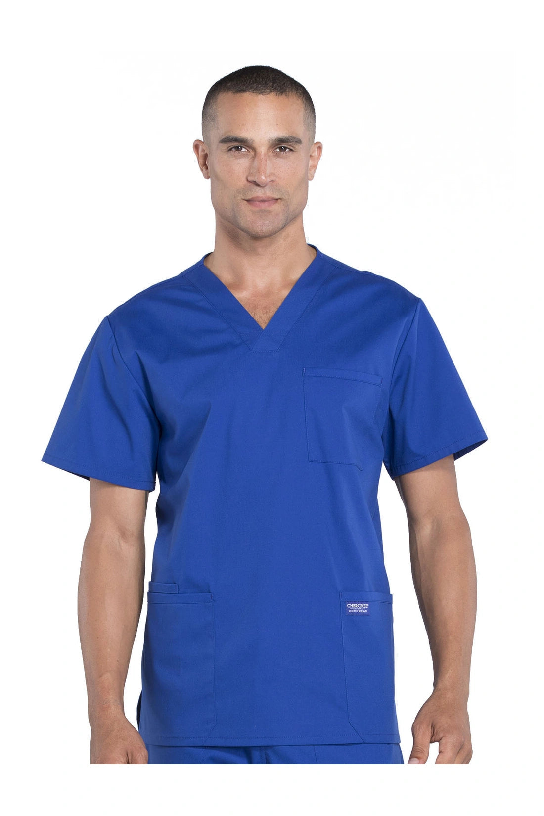 La camiseta de cuello en V de corte tradicional para hombre cuenta con un bolsillo en el pecho, dos bolsillos de parche, un bolsillo para el teléfono móvil, un lazo oculto para instrumentos, un canesú en la espalda y aberturas laterales. Longitud del centro de la espalda: 32