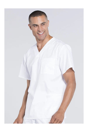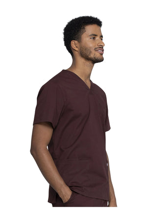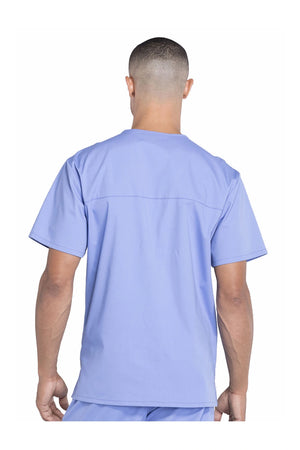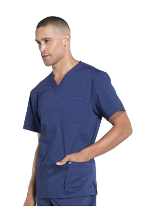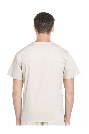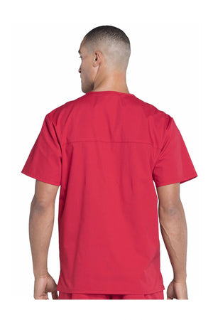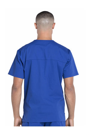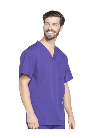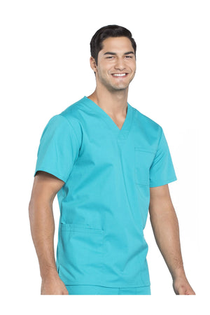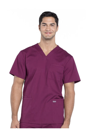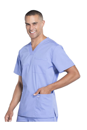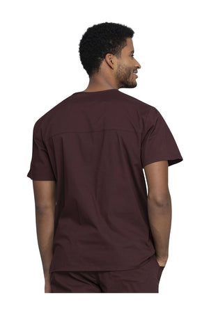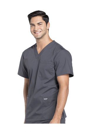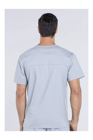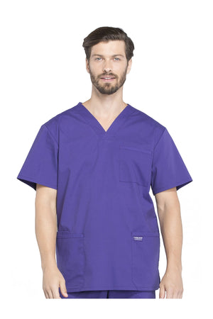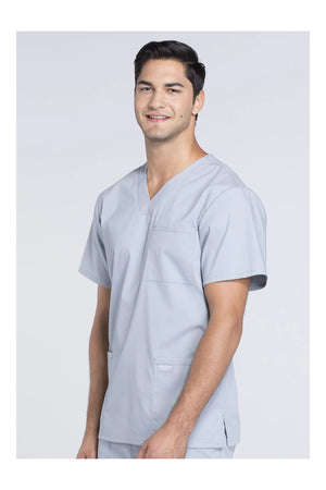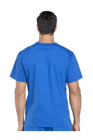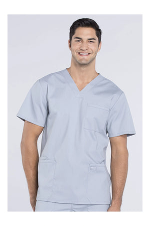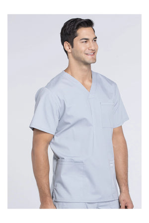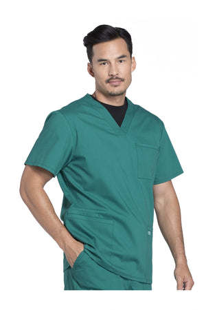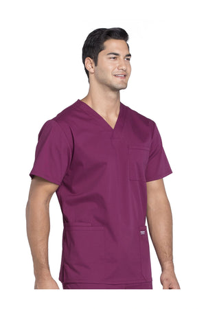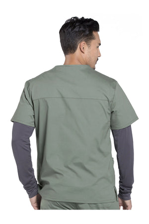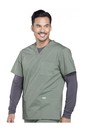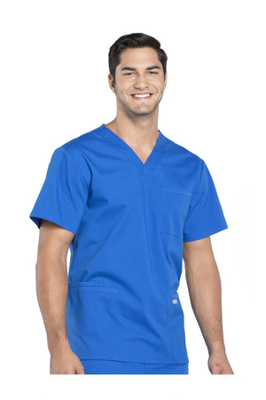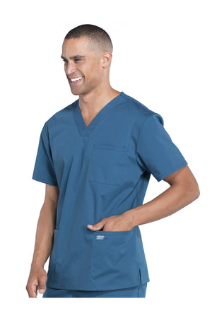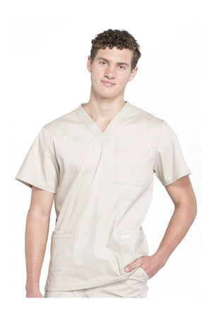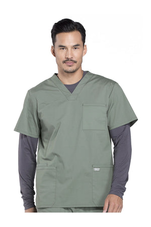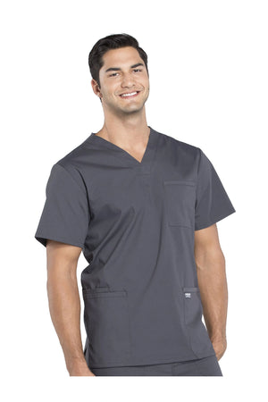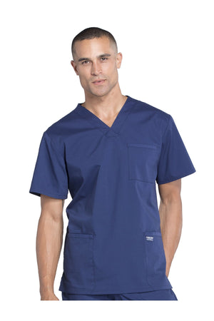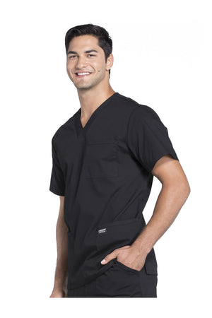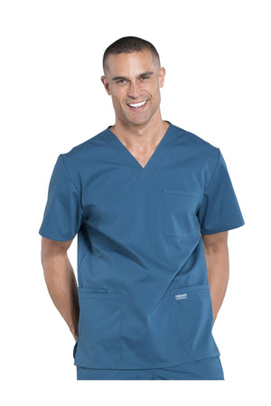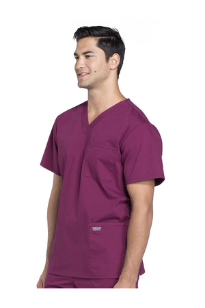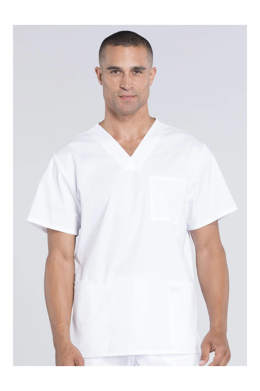 La camiseta de cuello en V de corte tradicional para hombre cuenta con un bolsillo en el pecho, dos bolsillos de parche, un bolsillo para el teléfono móvil, un lazo oculto para instrumentos, un canesú en la espalda y aberturas laterales. Longitud del centro de la espalda: 32